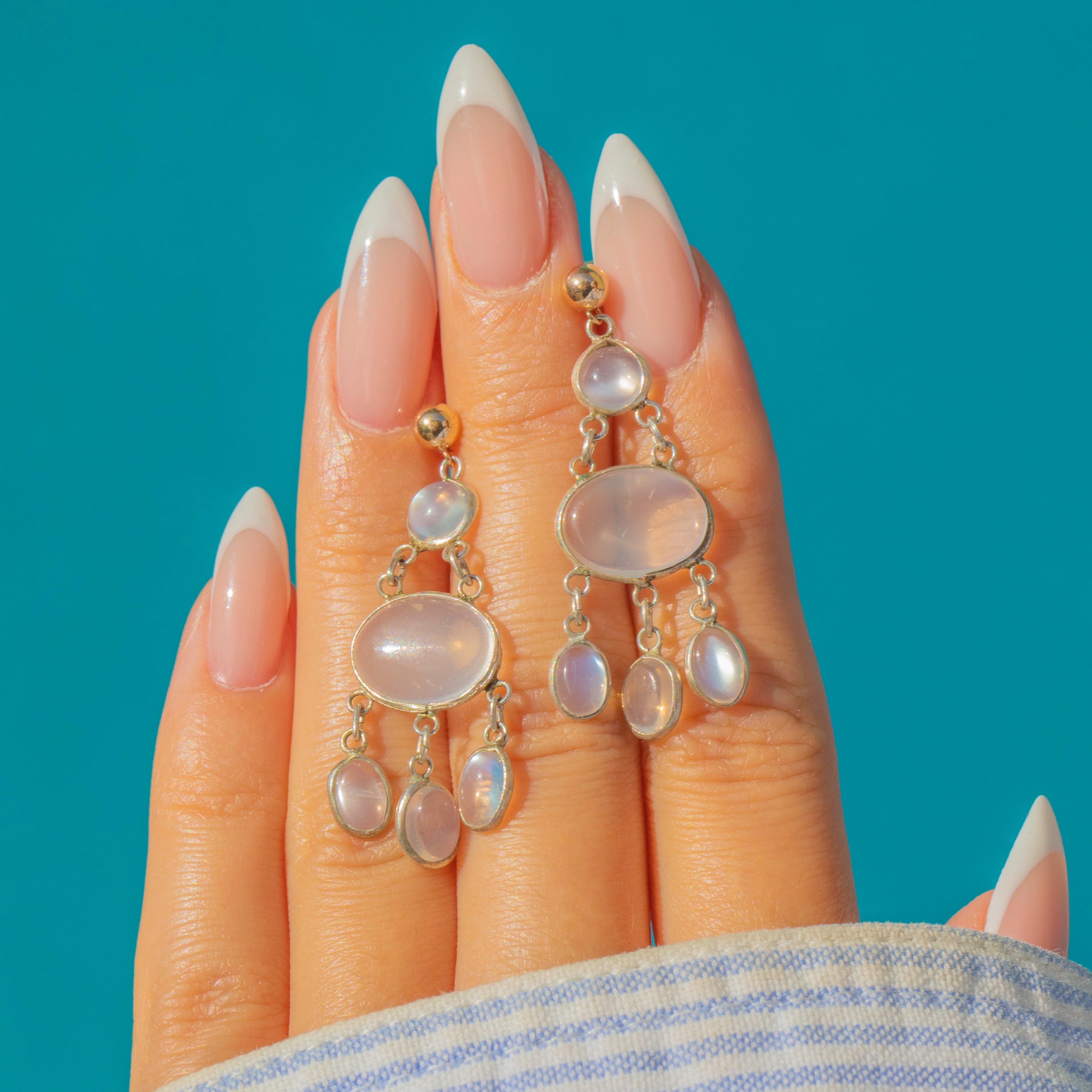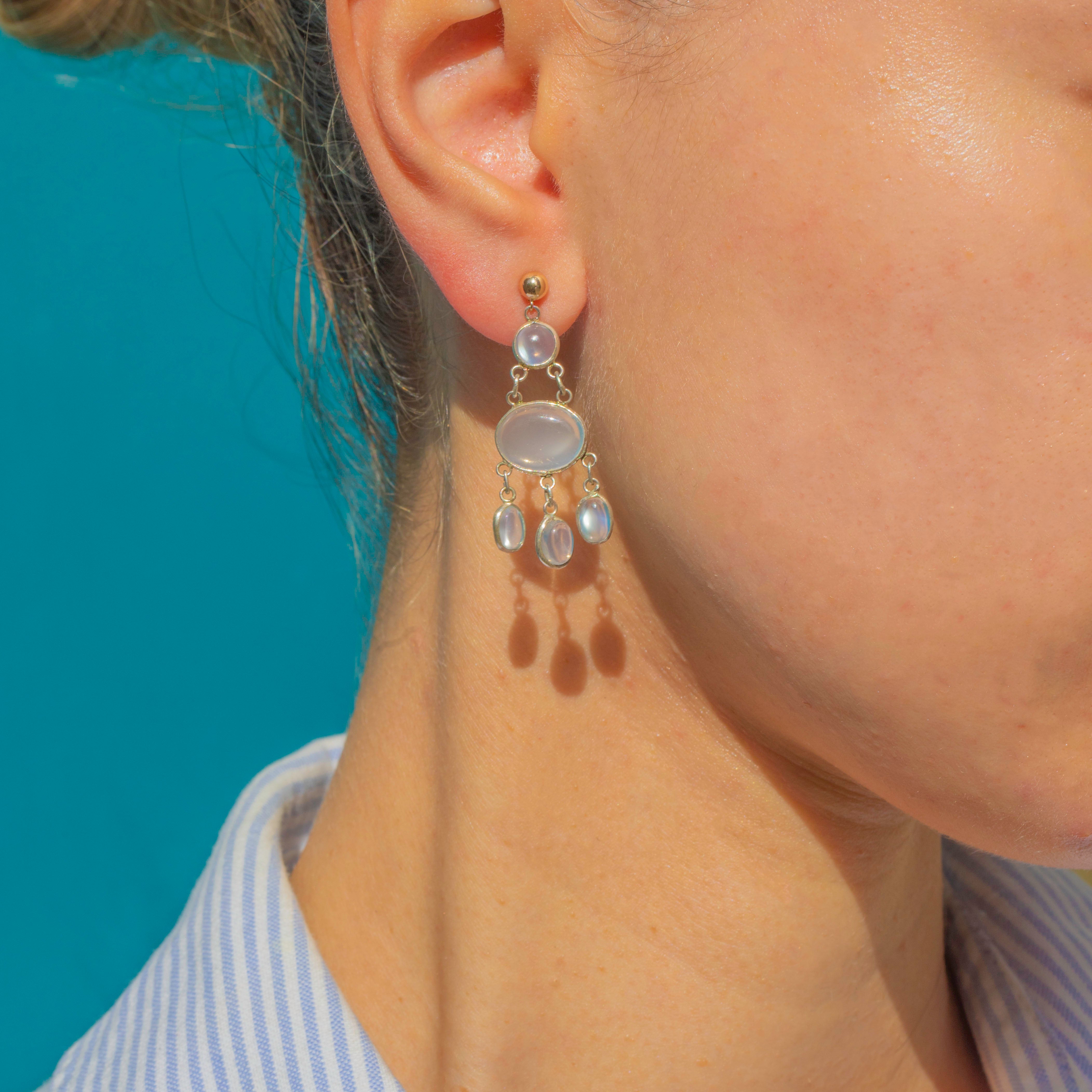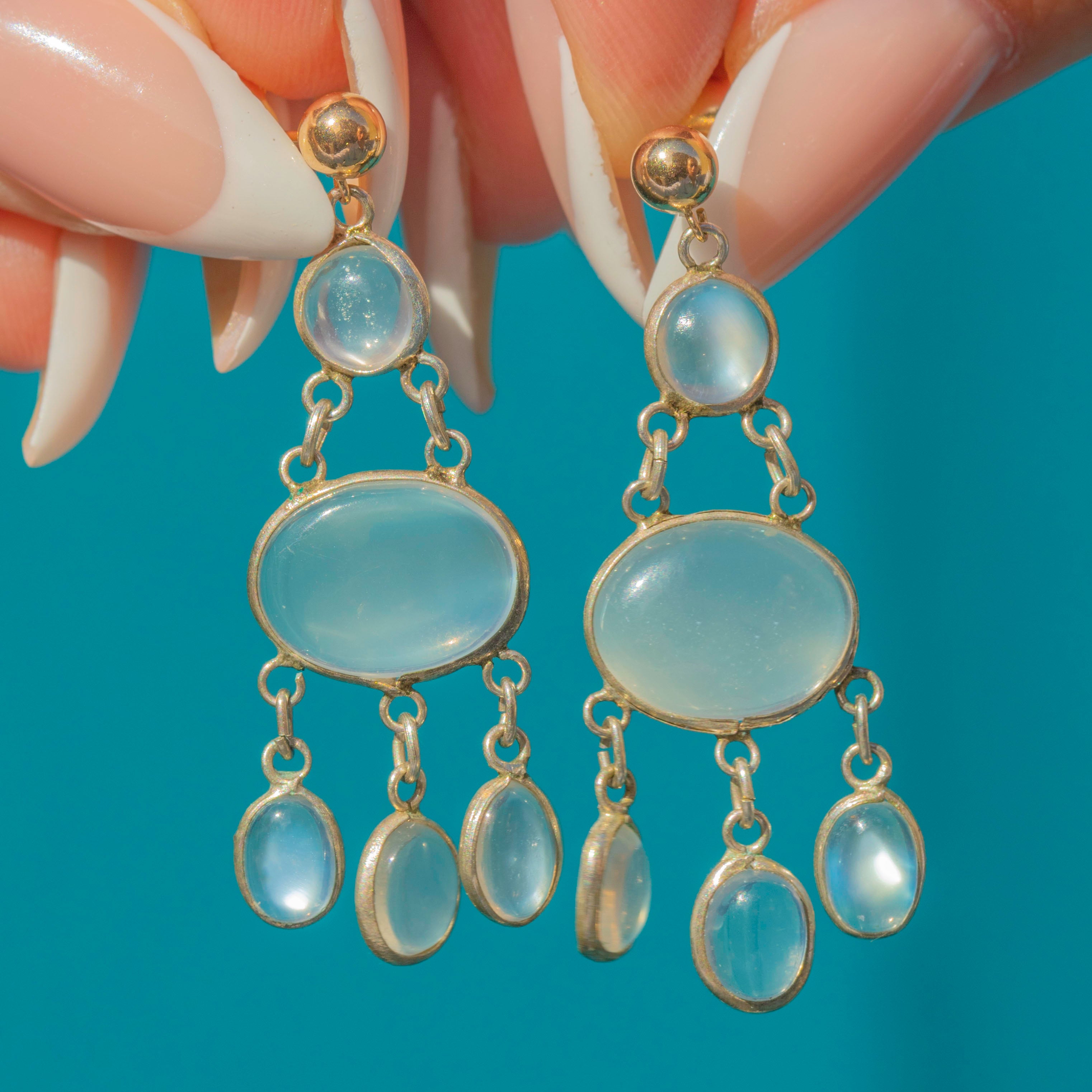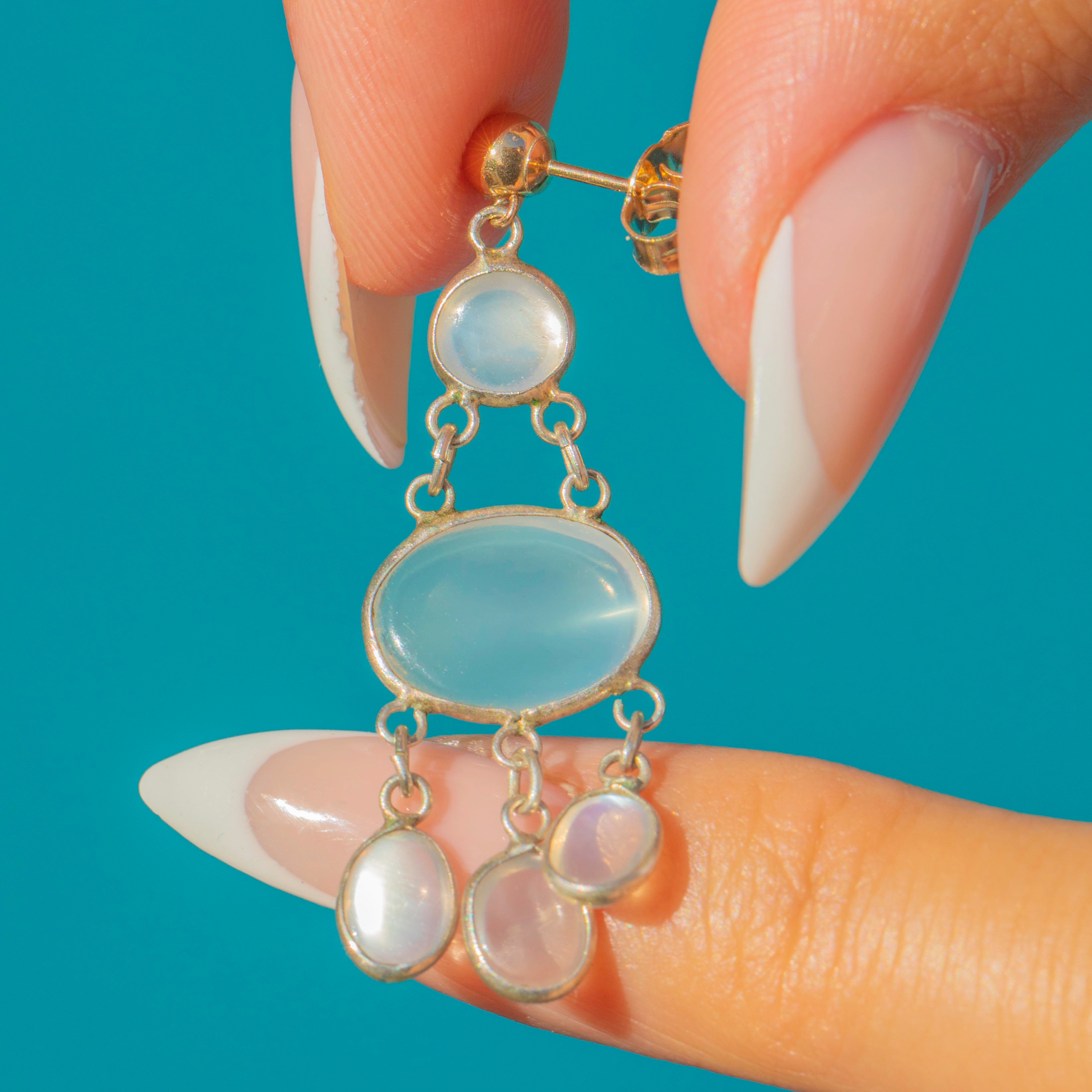 Draped with luminous Moonstone cabochons, these mid-century chandelier earrings deliver elegant movement and a dreamy, blue glow. Slender articulated links keep them light and wearable while the bezel settings give a clean, modern finish.