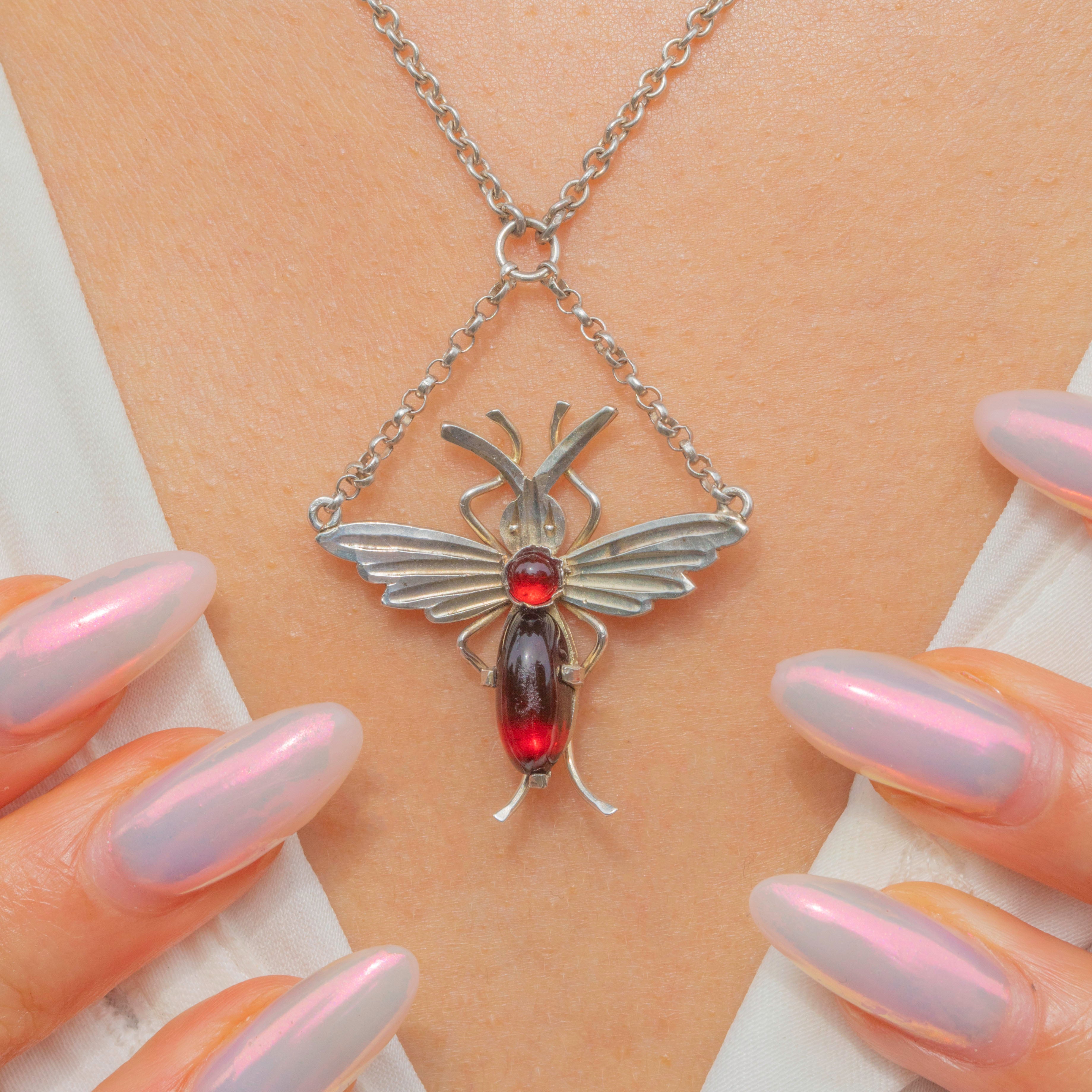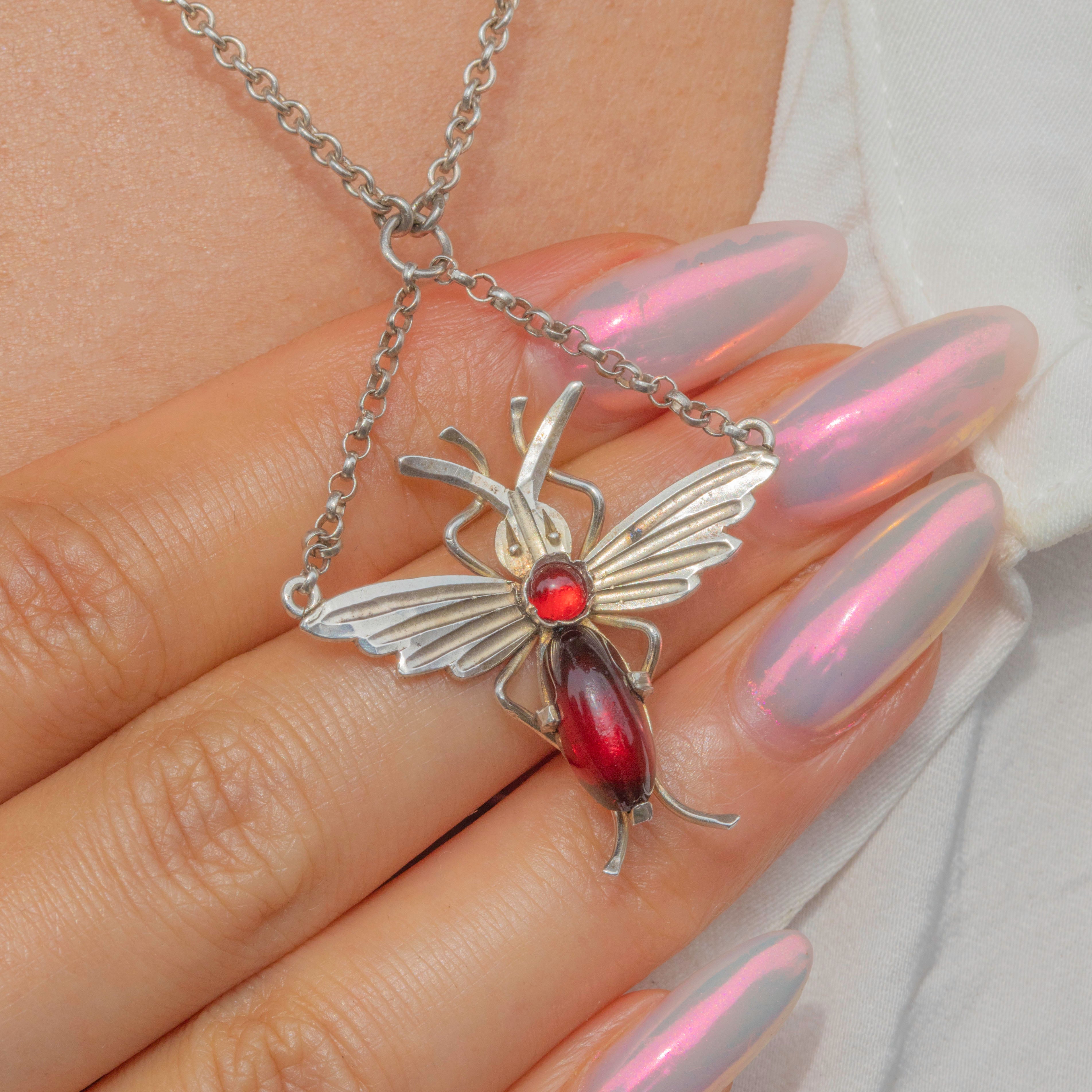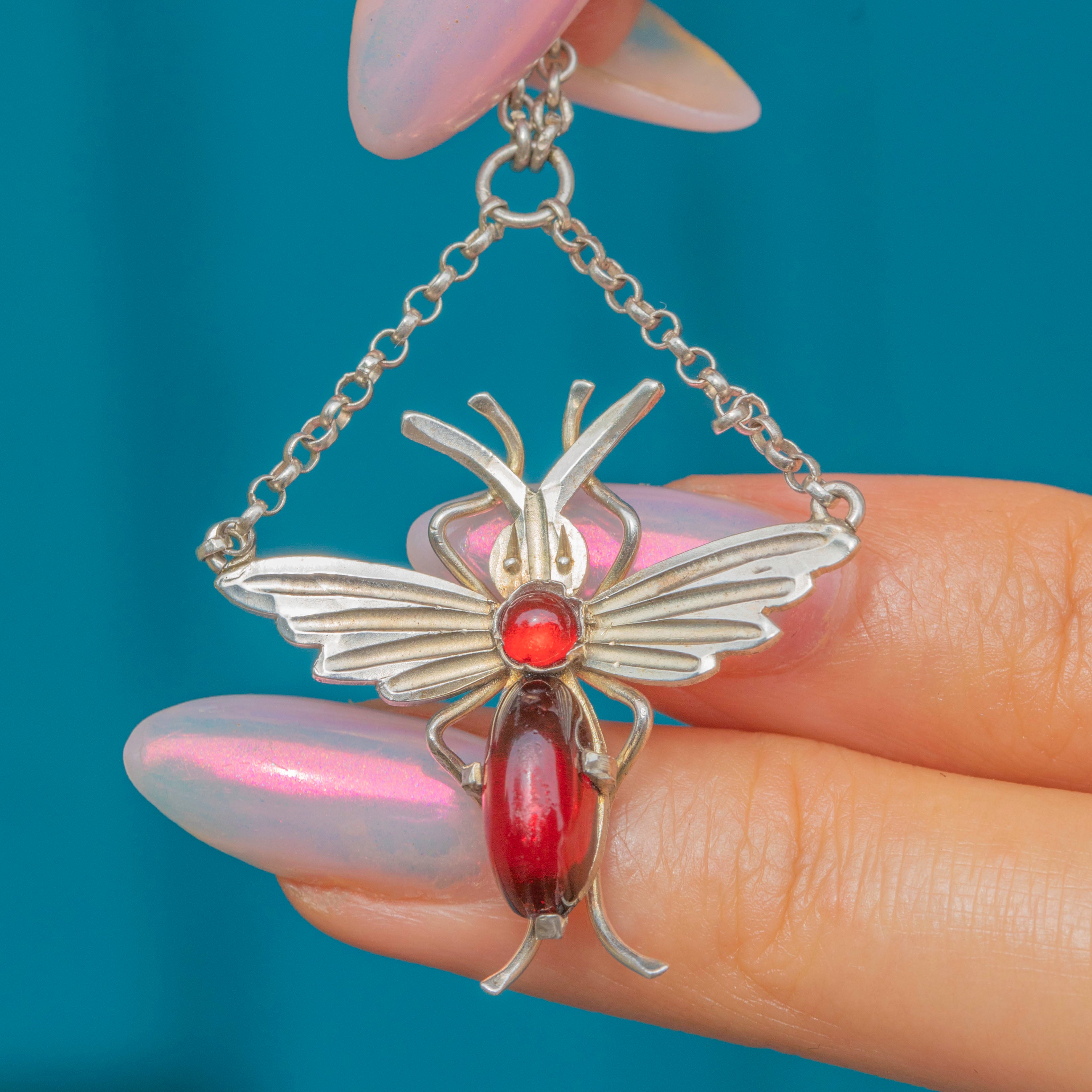 This vintage insect necklace is a unique find! The necklace is crafted from solid Sterling Silver, with the body of the insect highlighted by vibrant Paste cabochons, their crimson hues creating a gorgeous focal point.