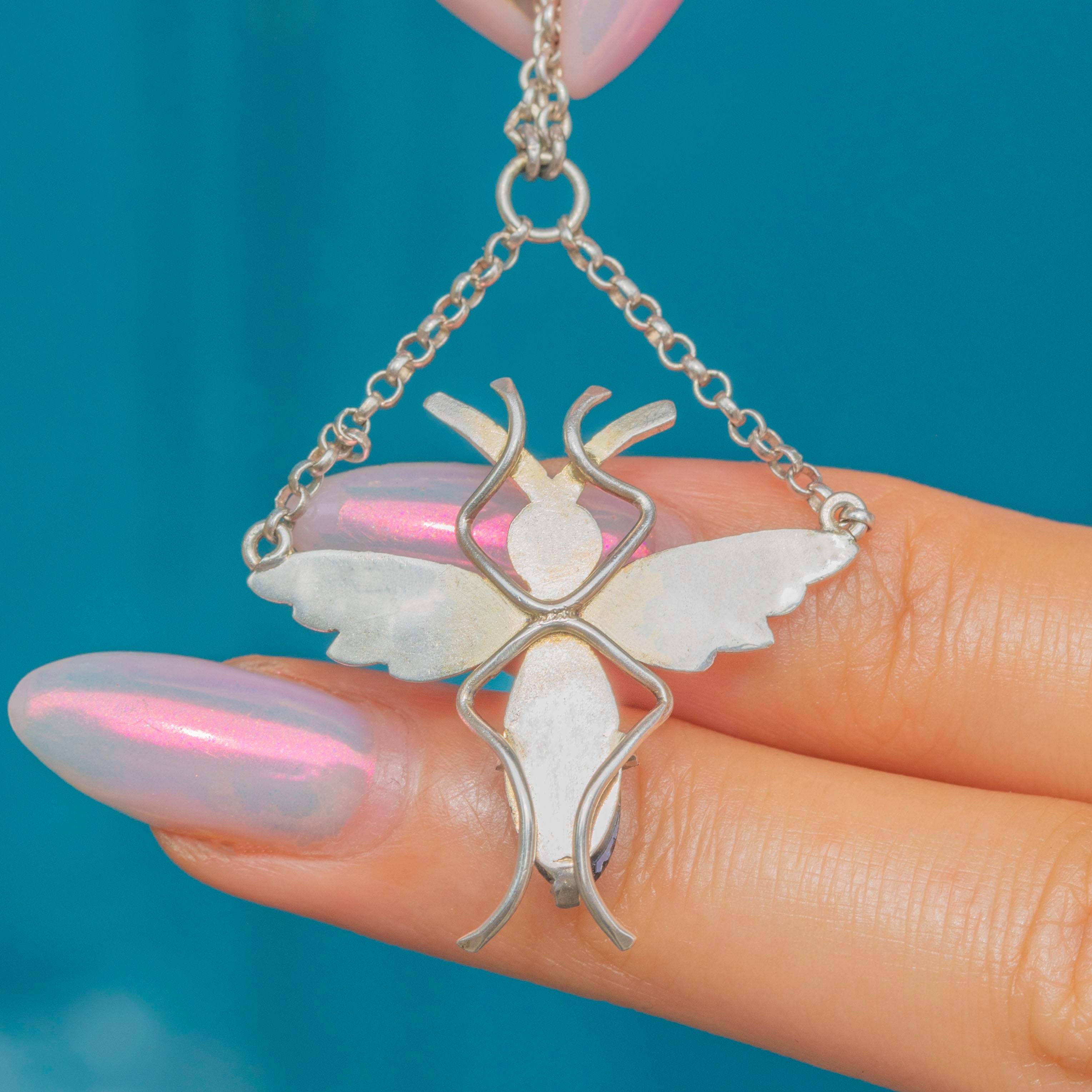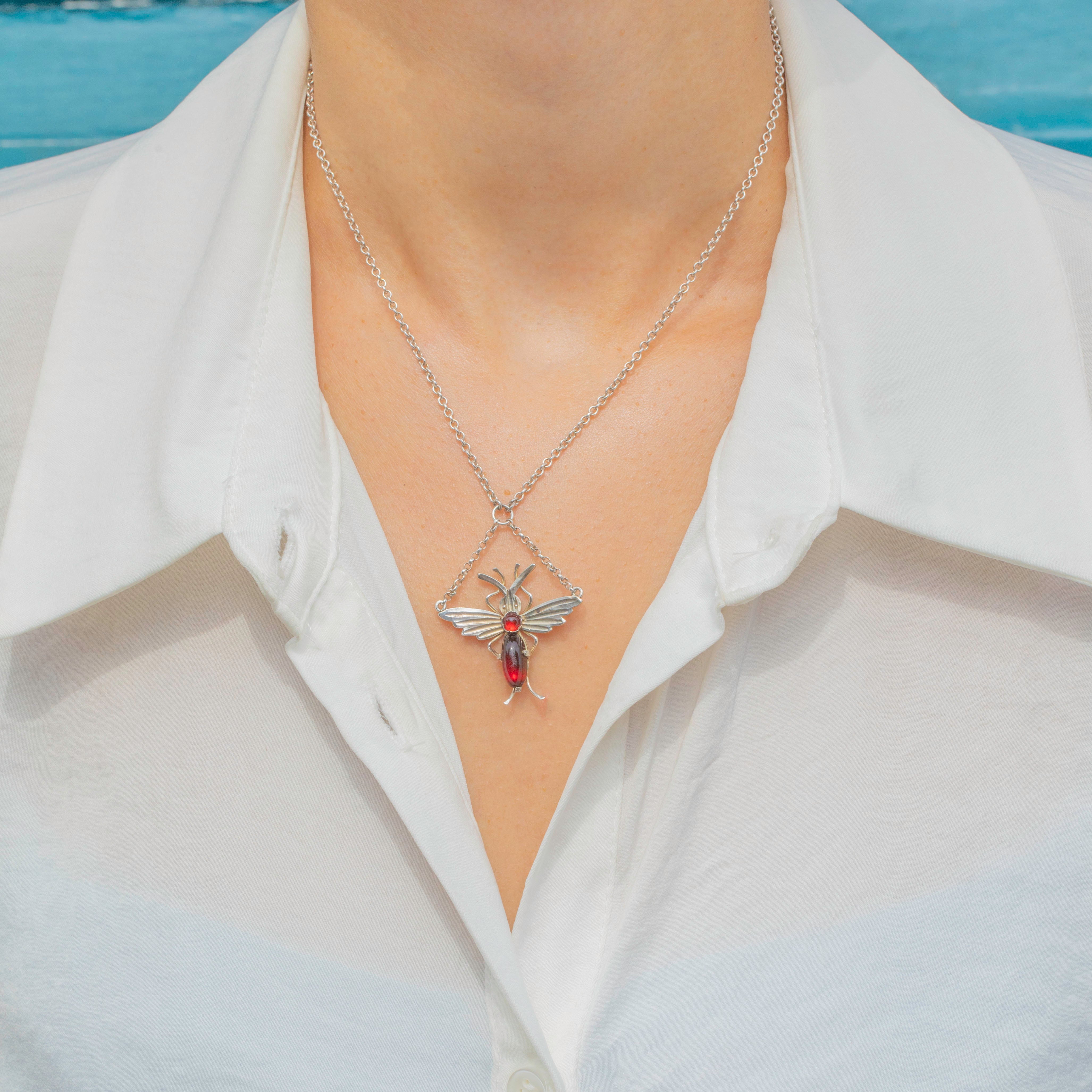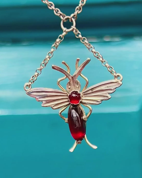 This vintage insect necklace is a unique find! The necklace is crafted from solid Sterling Silver, with the body of the insect highlighted by vibrant Paste cabochons, their crimson hues creating a gorgeous focal point.