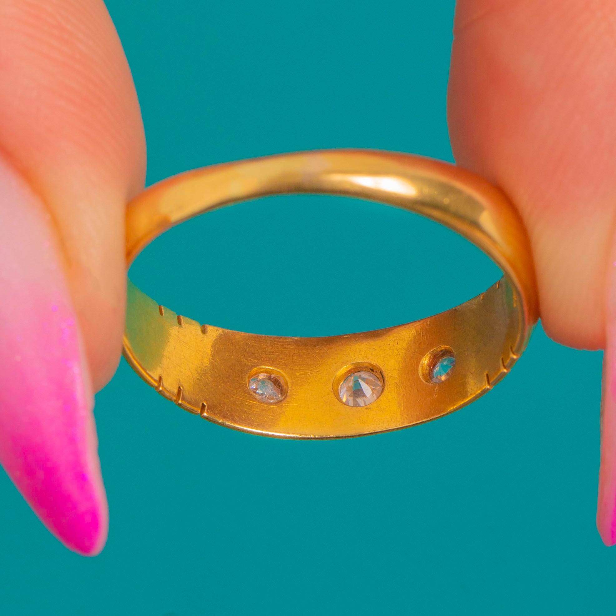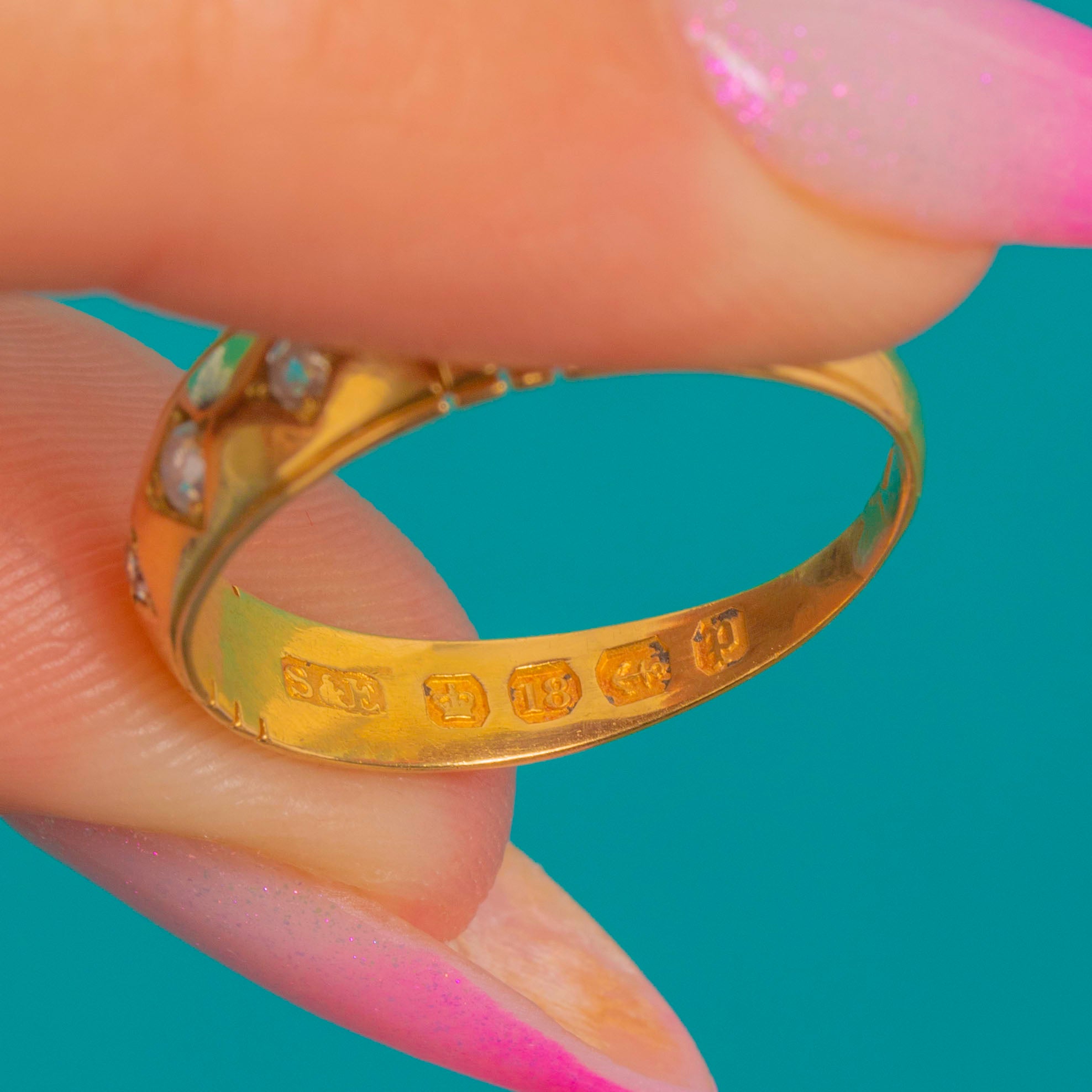 VERY GOOD: Diamonds are securely set with no obvious chips or abrasions visible. The 18ct Gold band shows light surface scratches and gentle wear consistent with age. There is subtle evidence of past resizing to the shank; settings remain crisp and well-preserved.