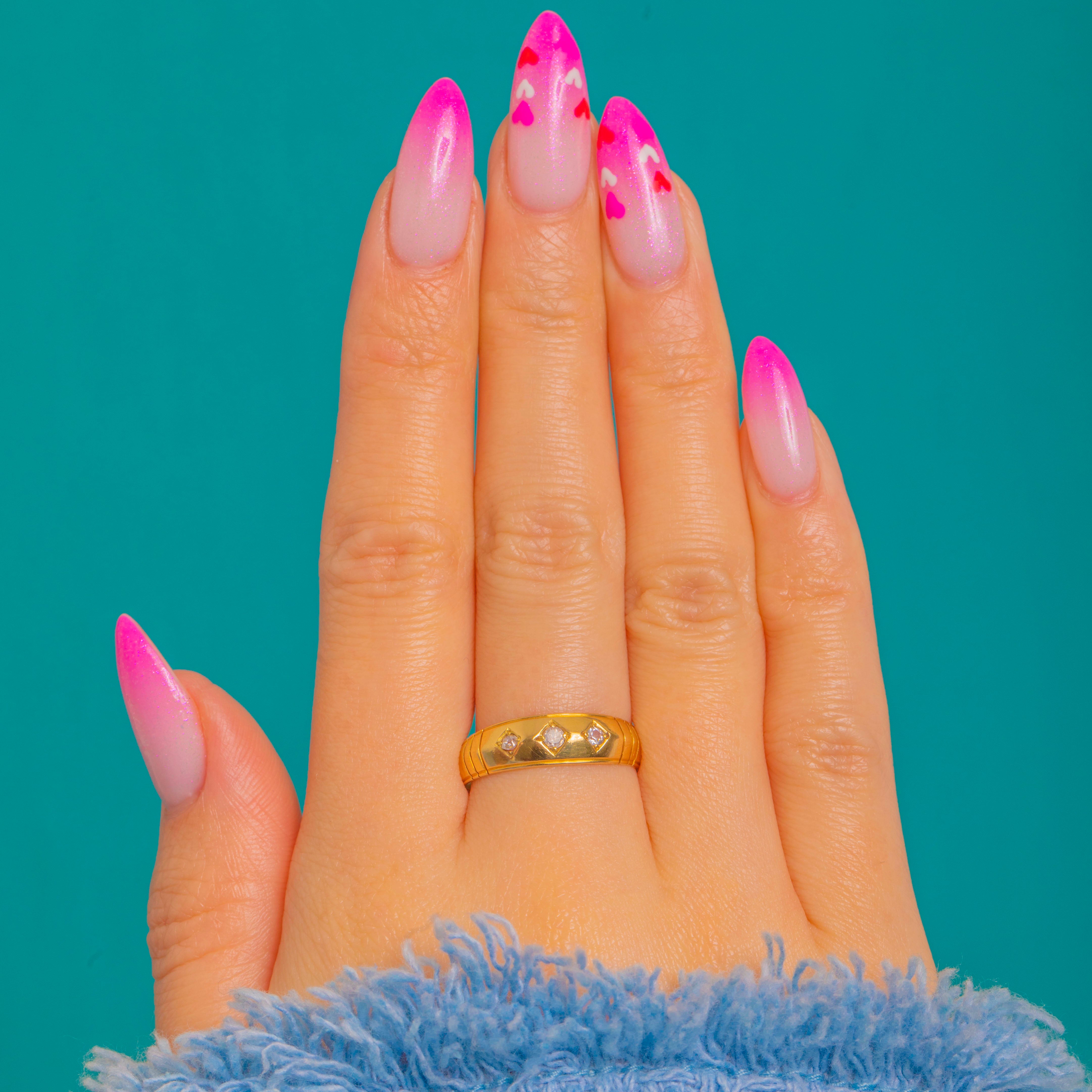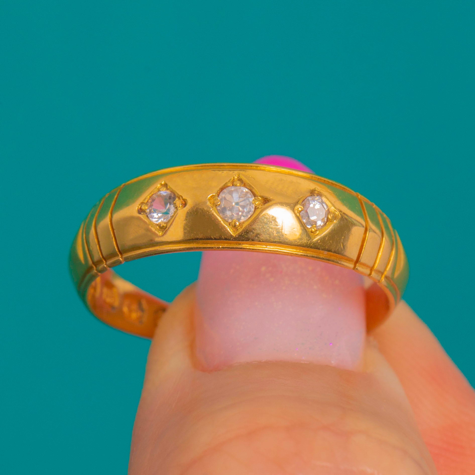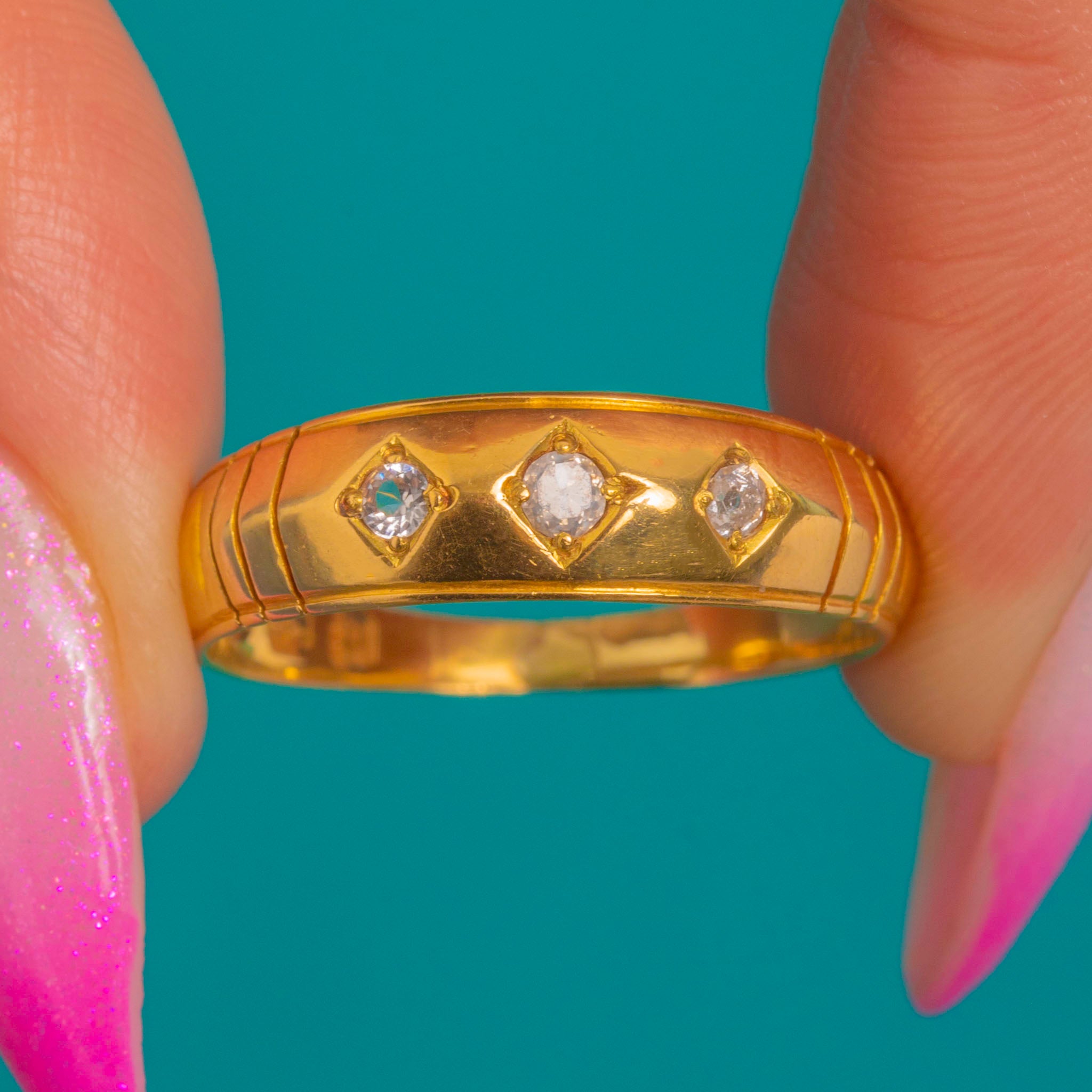 A striking Victorian three-stone gypsy ring in rich 18ct Gold, styled with a sleek knife-edge profile and three petite Diamonds set flush within lozenge-shaped settings. Understated yet architectural, it sits low to the finger for effortless, everyday elegance.