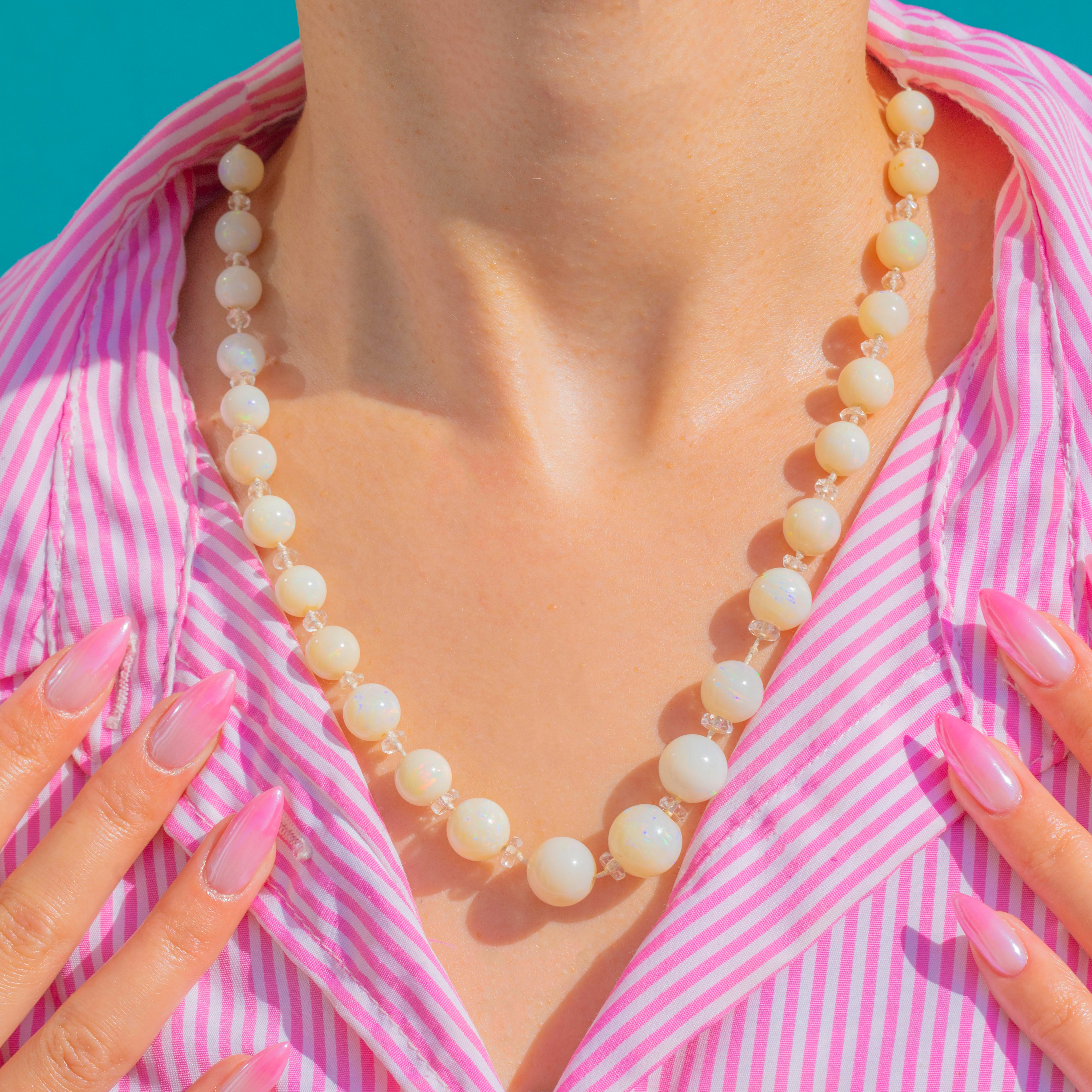With approximately 120.00cts of Opal, this luminous necklace captures the cool glamour of the era. The crisp brilliance of Rock Crystal heightens the opaline glow, giving a pristine, rhythmic sparkle between every bead.