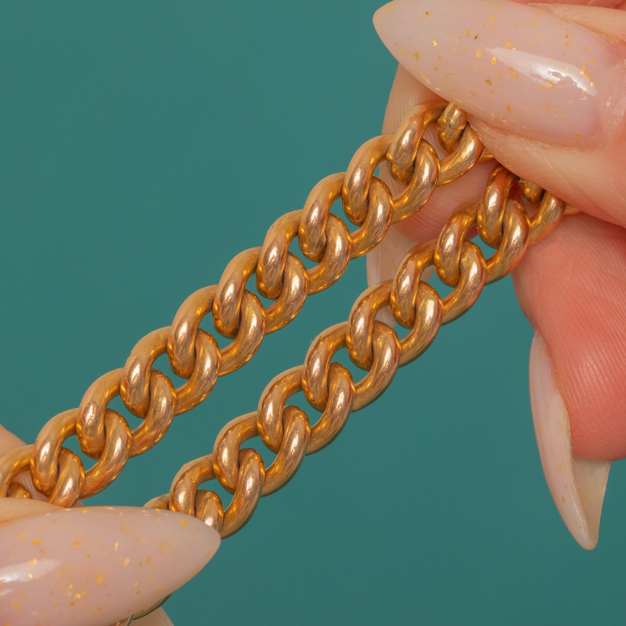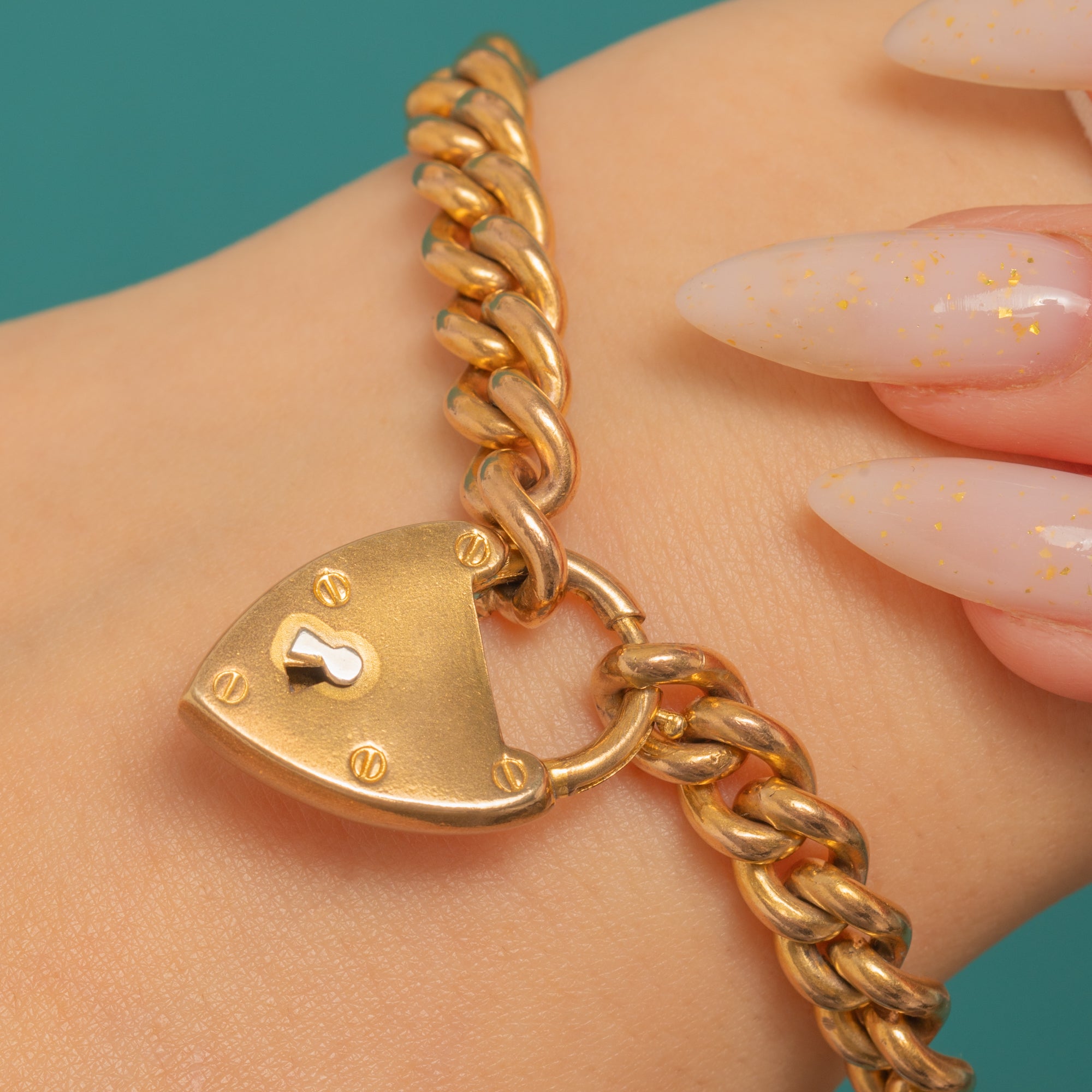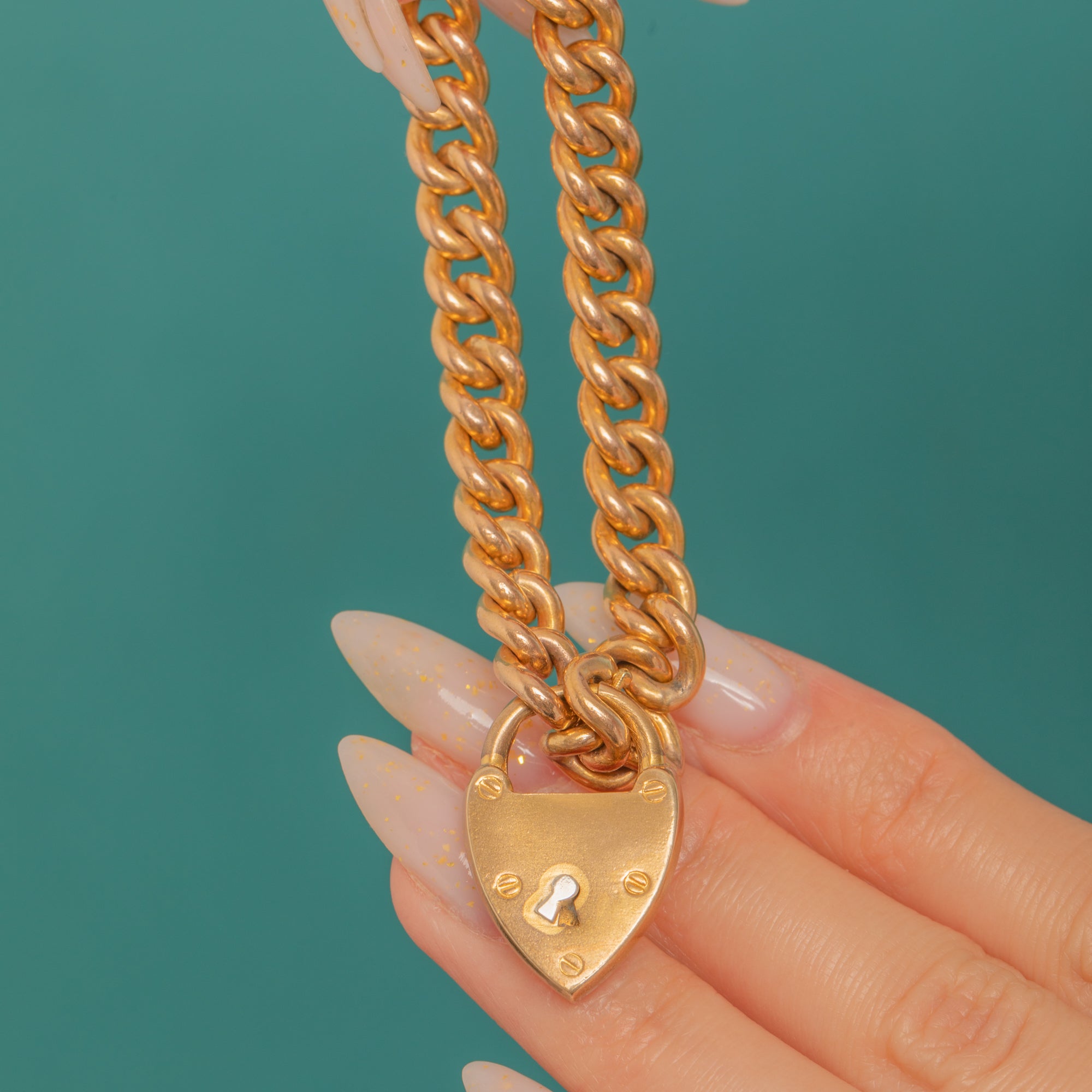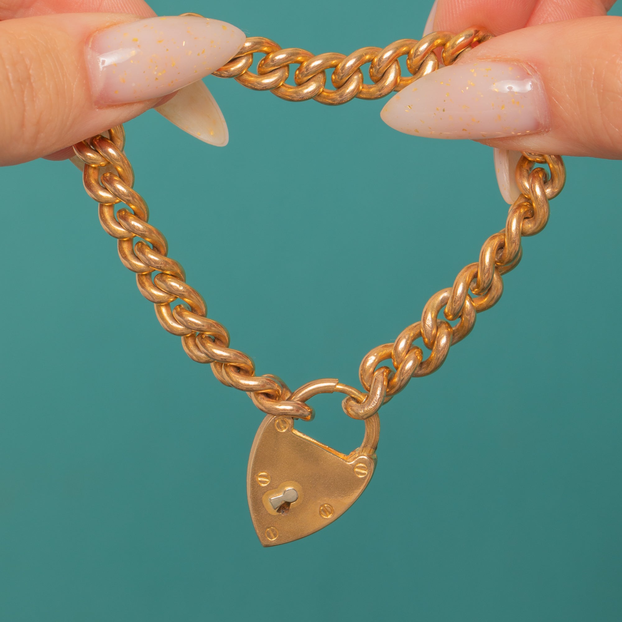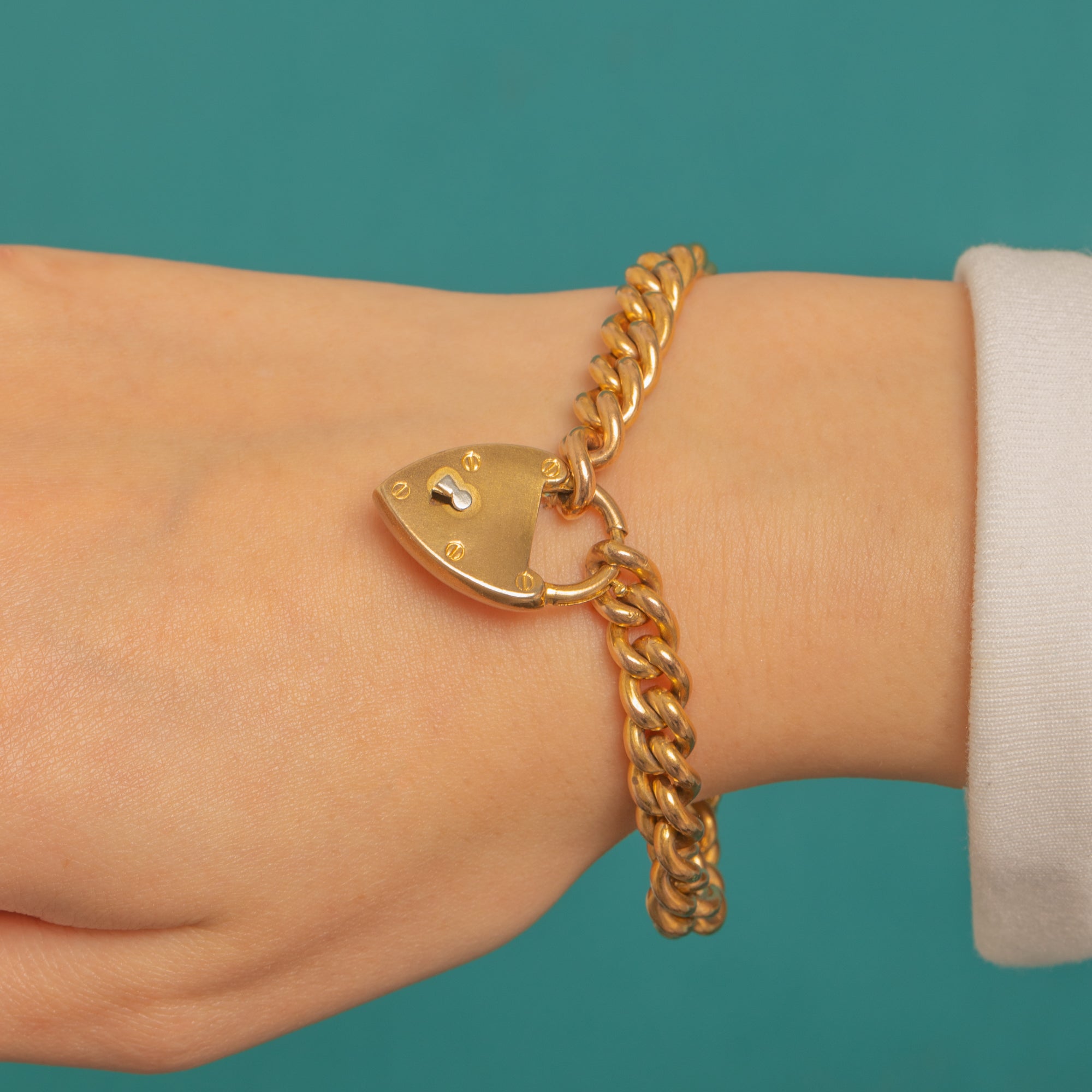 Evoking Edwardian romance with a utilitarian twist, this Gold-cased curb bracelet is finished with a classic heart padlock clasp. The uniform curb links lie sleek and flat, while the padlock showcases a crisp keyhole and four decorative screw-head details that catch the light beautifully. Its warm golden tone and gentle patina add an elegant, timeworn glow.