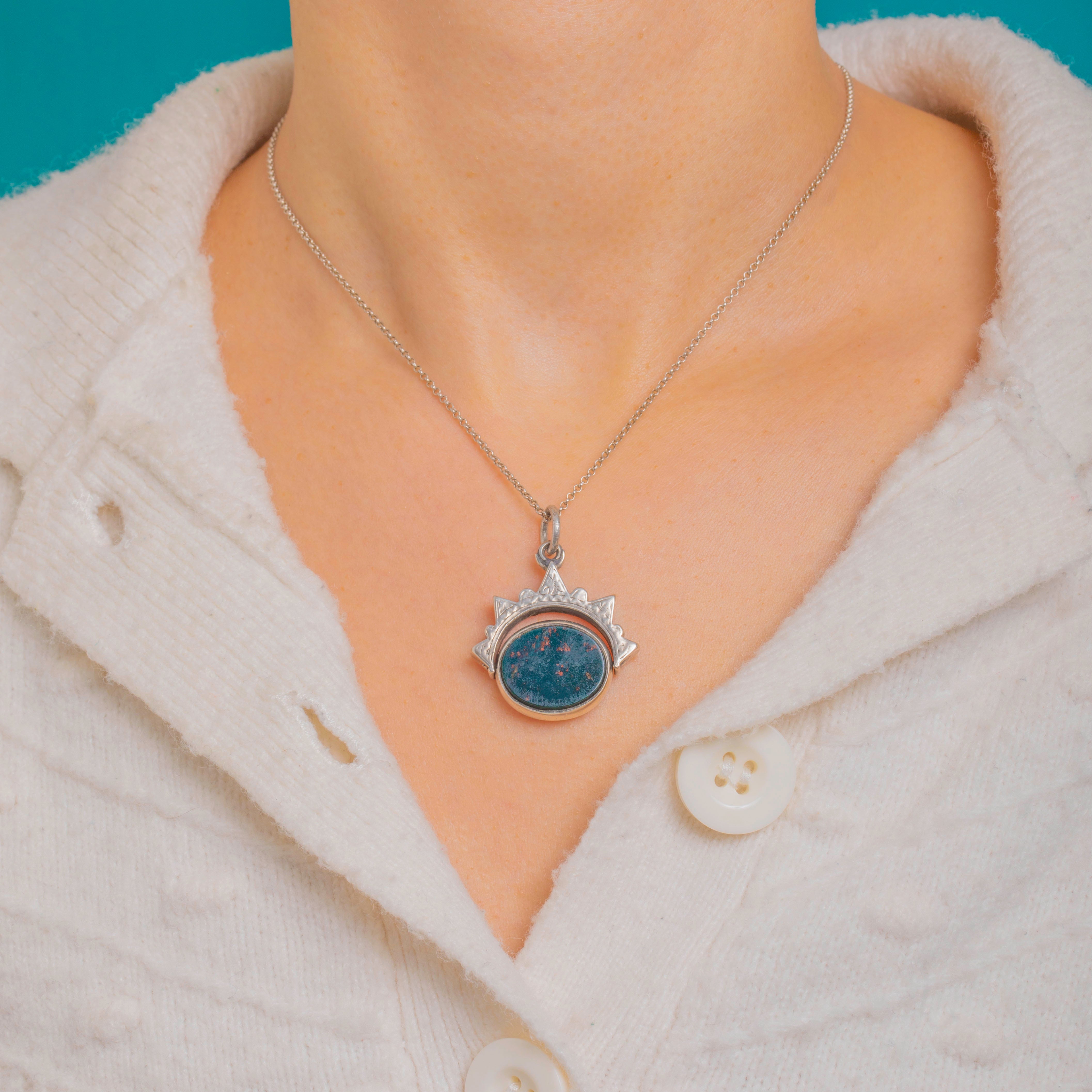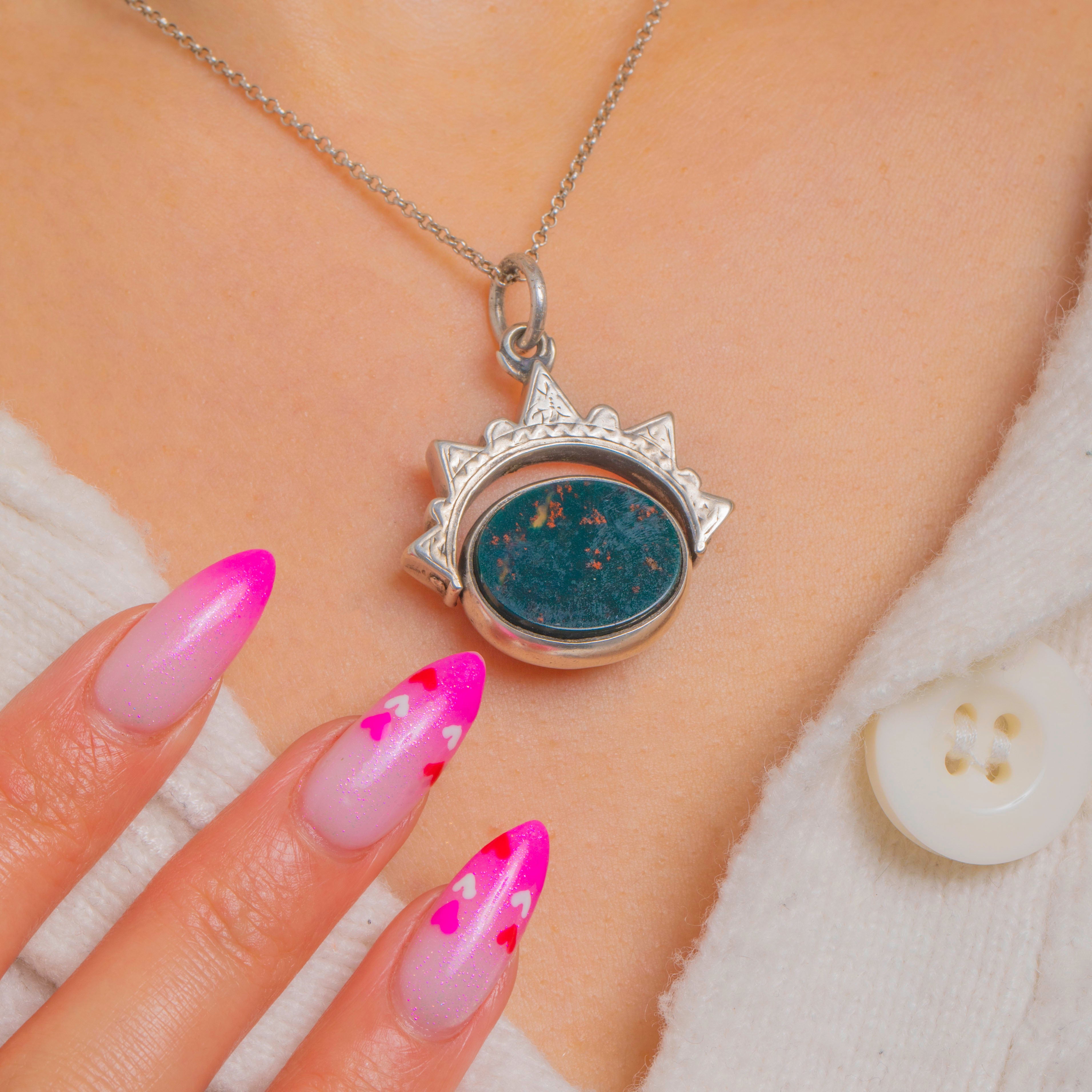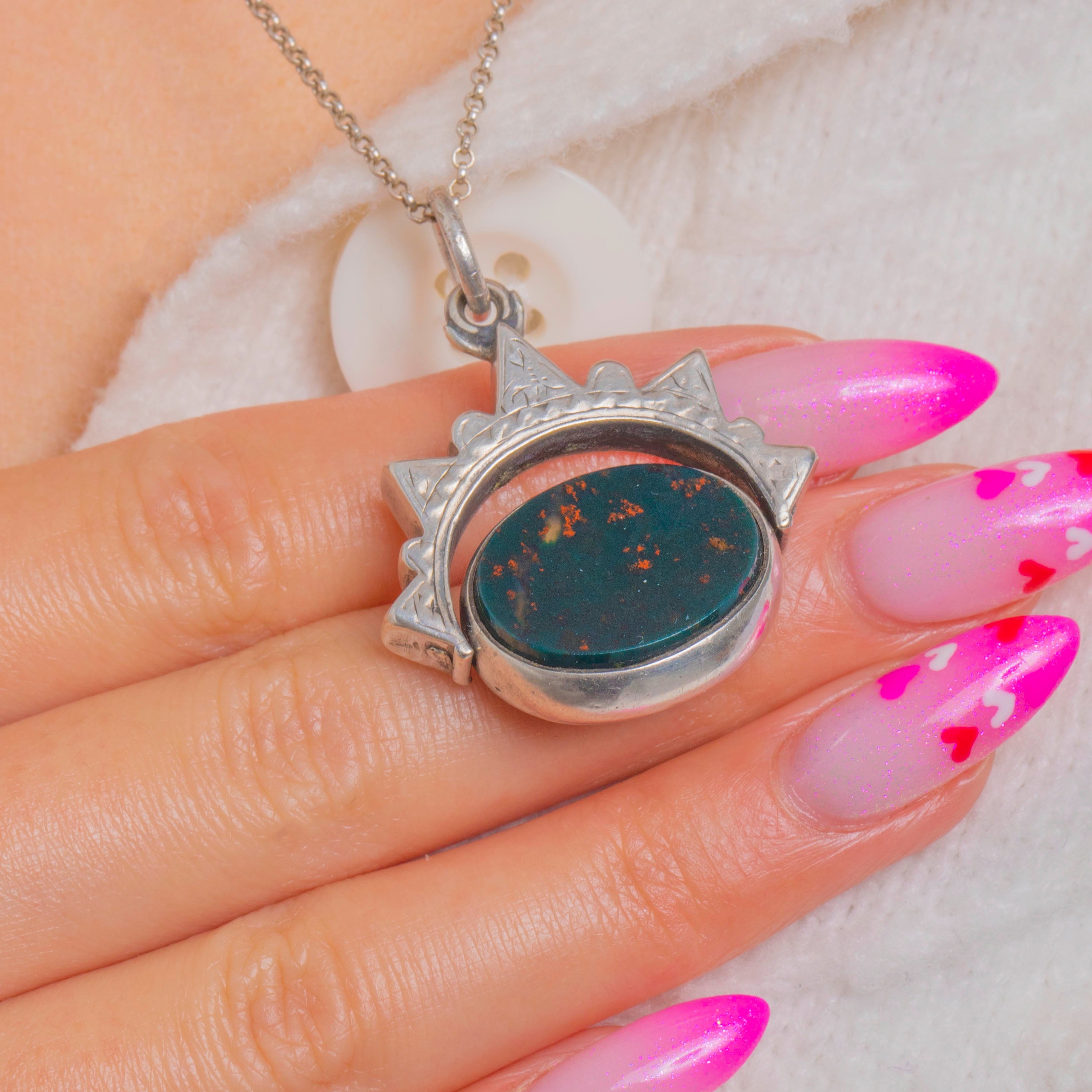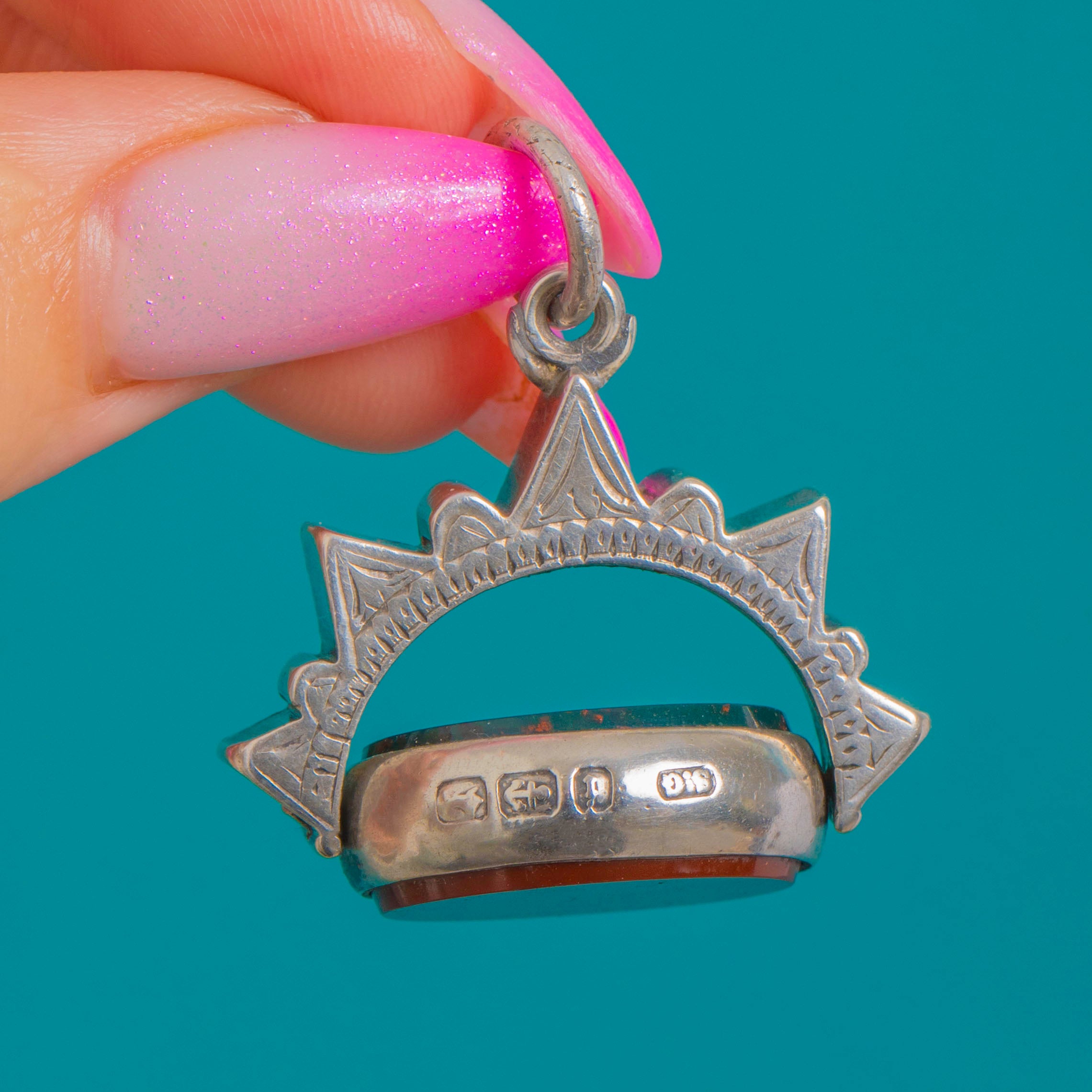 A striking Victorian Sterling Silver swivel fob with a sculptural sunburst “crown”, enriched with fine chevron and foliate engraving. The oval, east–west set cabochon showcases classic Bloodstone on one side and warm Carnelian on the other, offering two distinctive looks framed by a smooth, hand‑finished bezel.