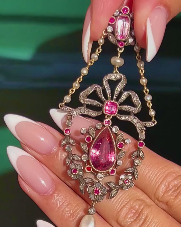 This superb French Belle Époque pendant is a true masterpiece of late 19th-century jewellery design. Crafted in 18ct Gold with Silver settings, it dazzles with vivid Pink Tourmalines, shimmering rose-cut Diamonds and luminous natural Pearls. The feminine bow and garland of flowers reflect the elegance and exquisite craftsmanship of the Belle Époque era, making this a jewel of exceptional beauty and rarity.
