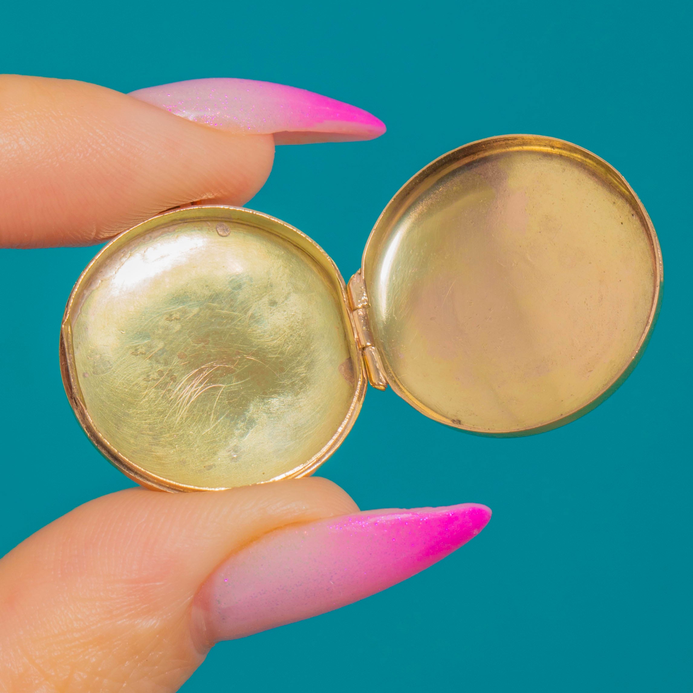 EXCELLENT: Light surface wear consistent with age, with crisp engraving and a bright polish retained. The hinge and bail are secure, and the locket closes neatly. Interiors are clean; no photo frames or glazing are present.