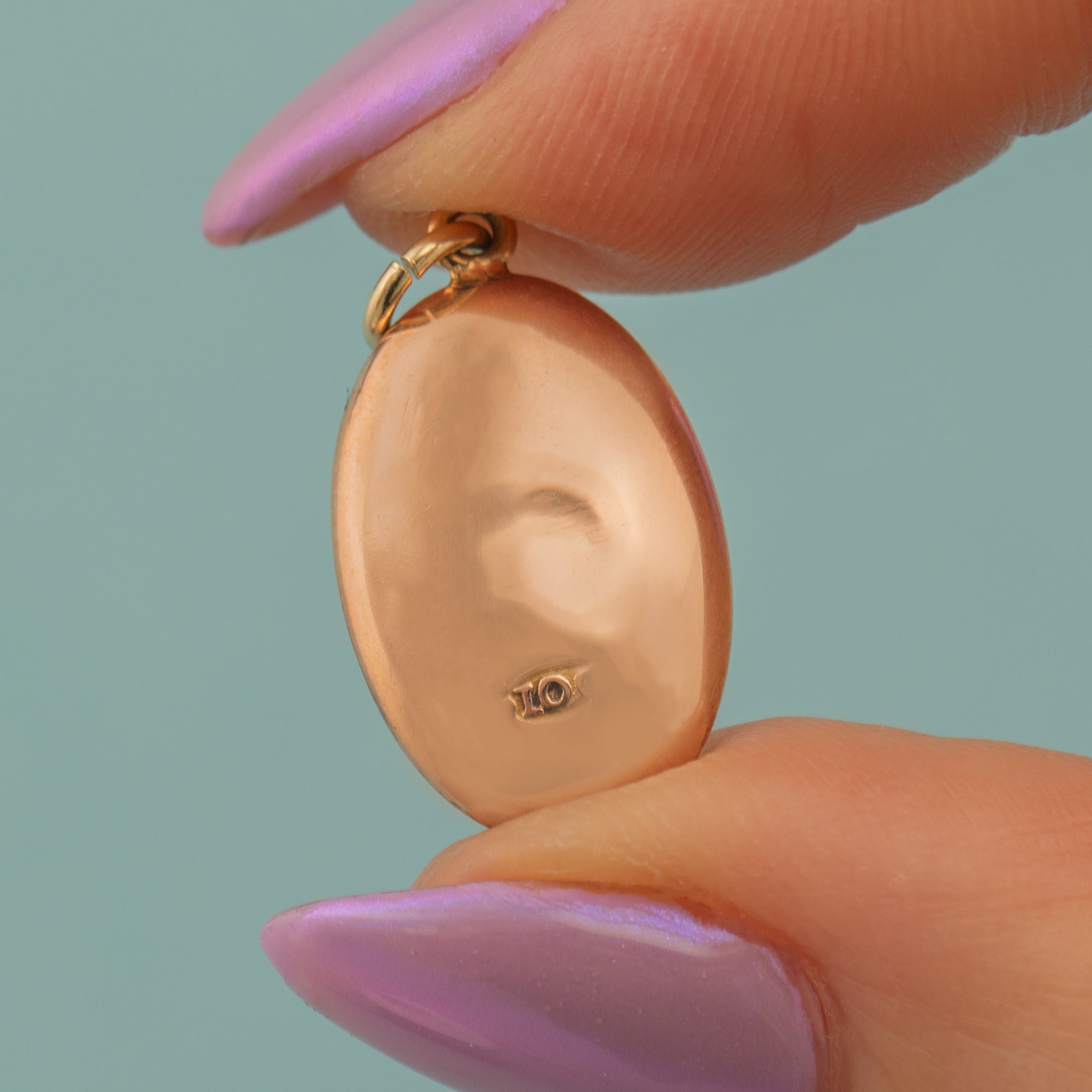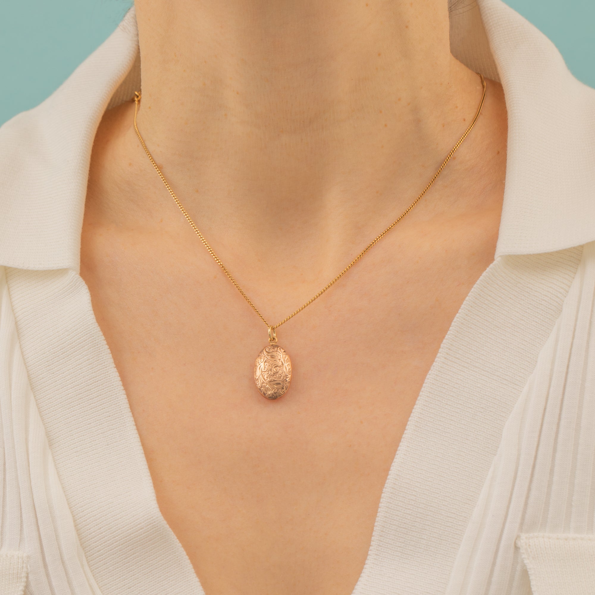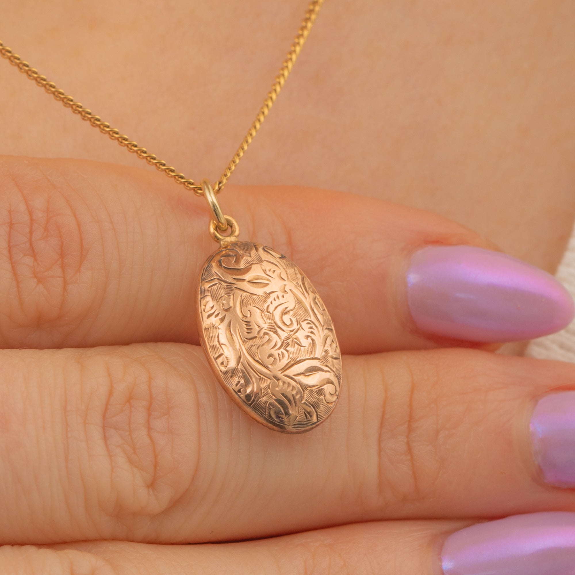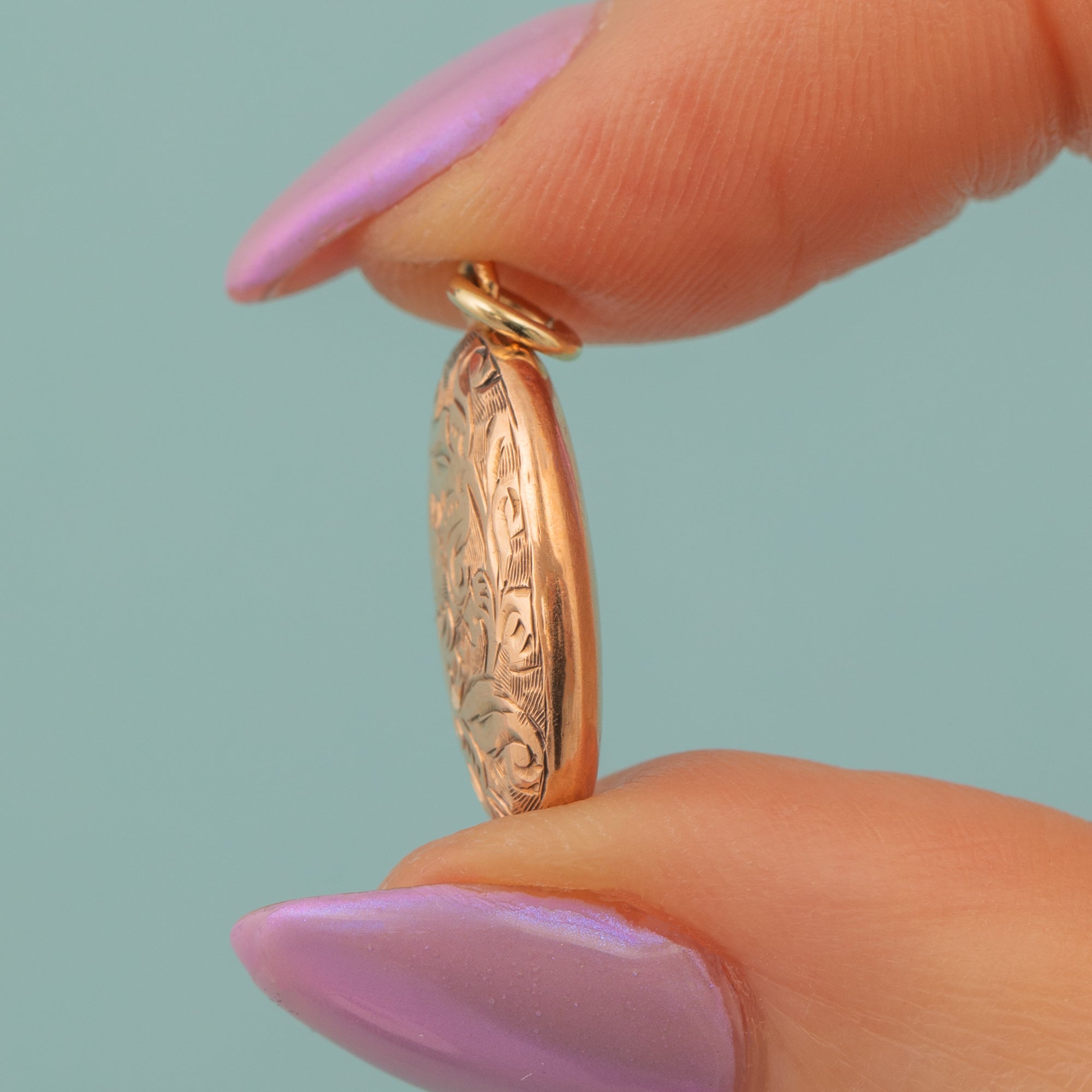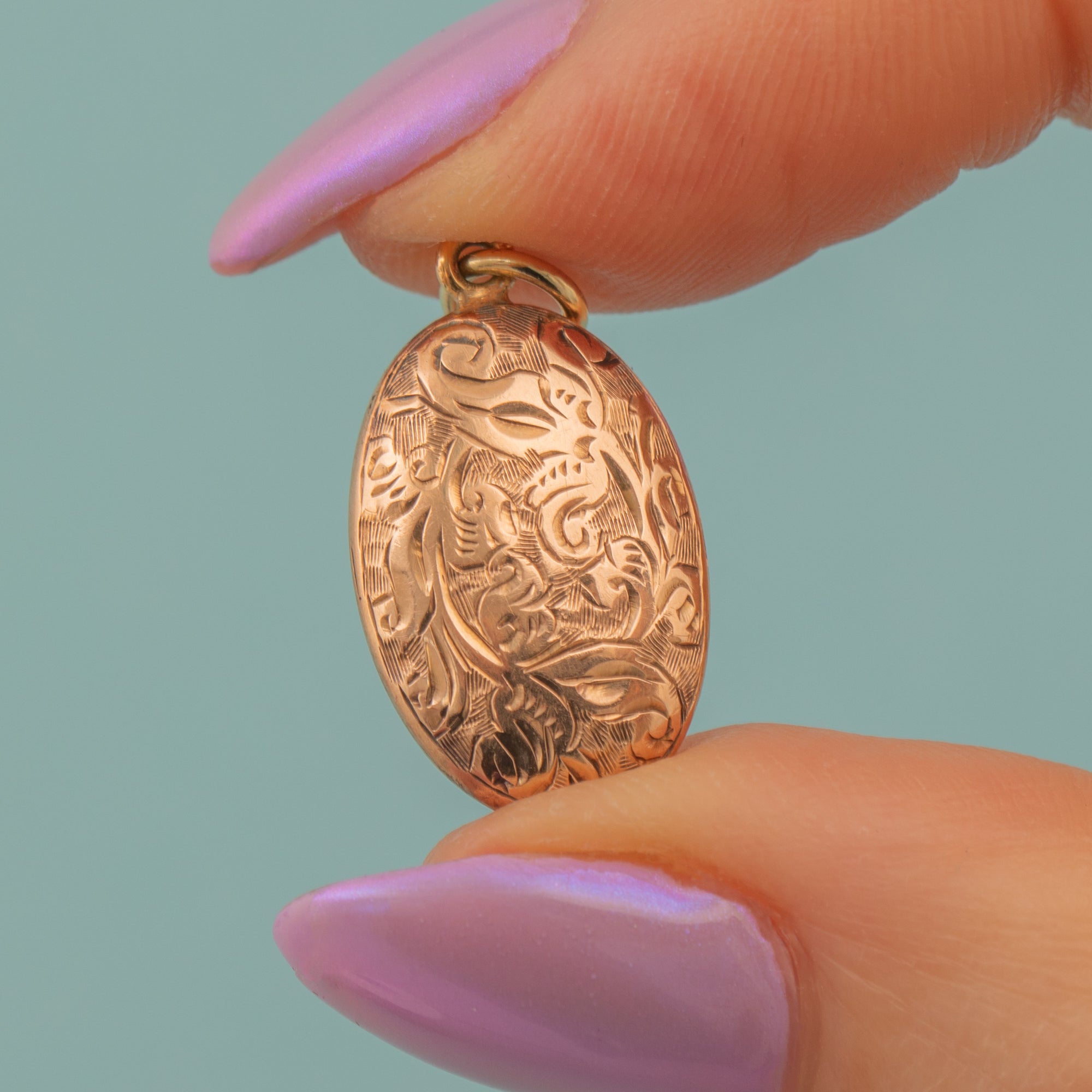 Crafted from warm, rosy-hued 10ct Gold, this oval pendant is lightweight and versatile - perfect for adding to a chain or bracelet. She is adorned with Baroque-style engravings on her front, providing ample texture and depth.