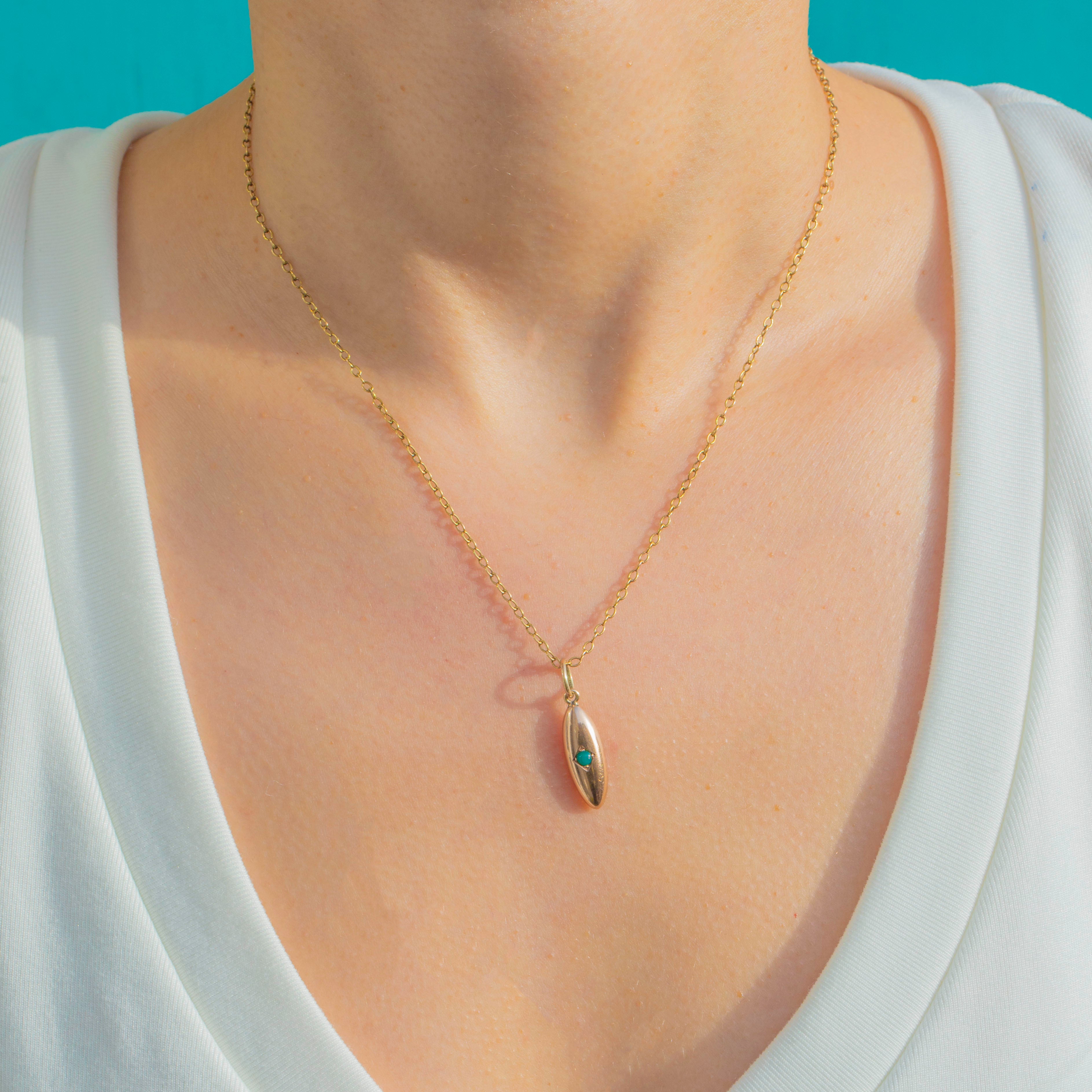 A delicate Victorian pendant crafted in 10ct Gold, styled as a refined navette plaque with a star-like lozenge to the centre, set with a petite Turquoise of serene blue-green. With its smooth, high-polish finish and subtle detailing, it offers a graceful whisper of colour and Gold for everyday elegance.