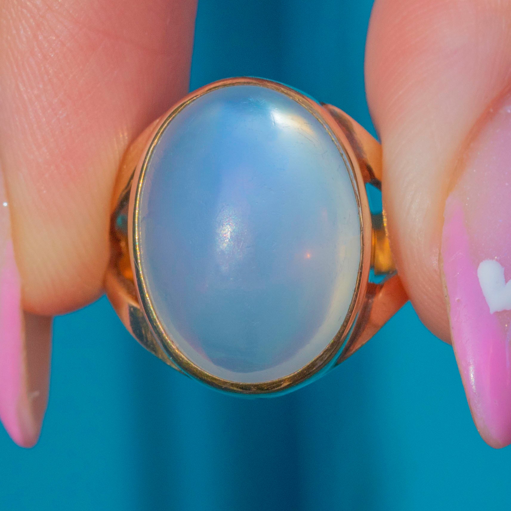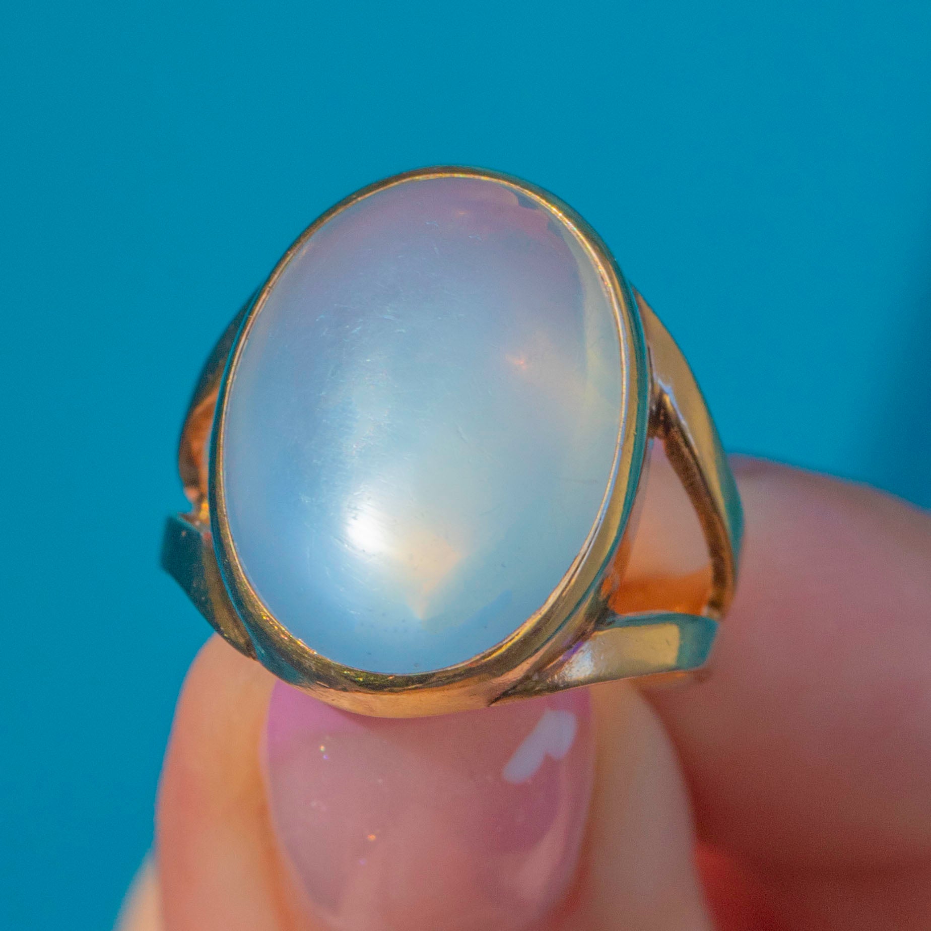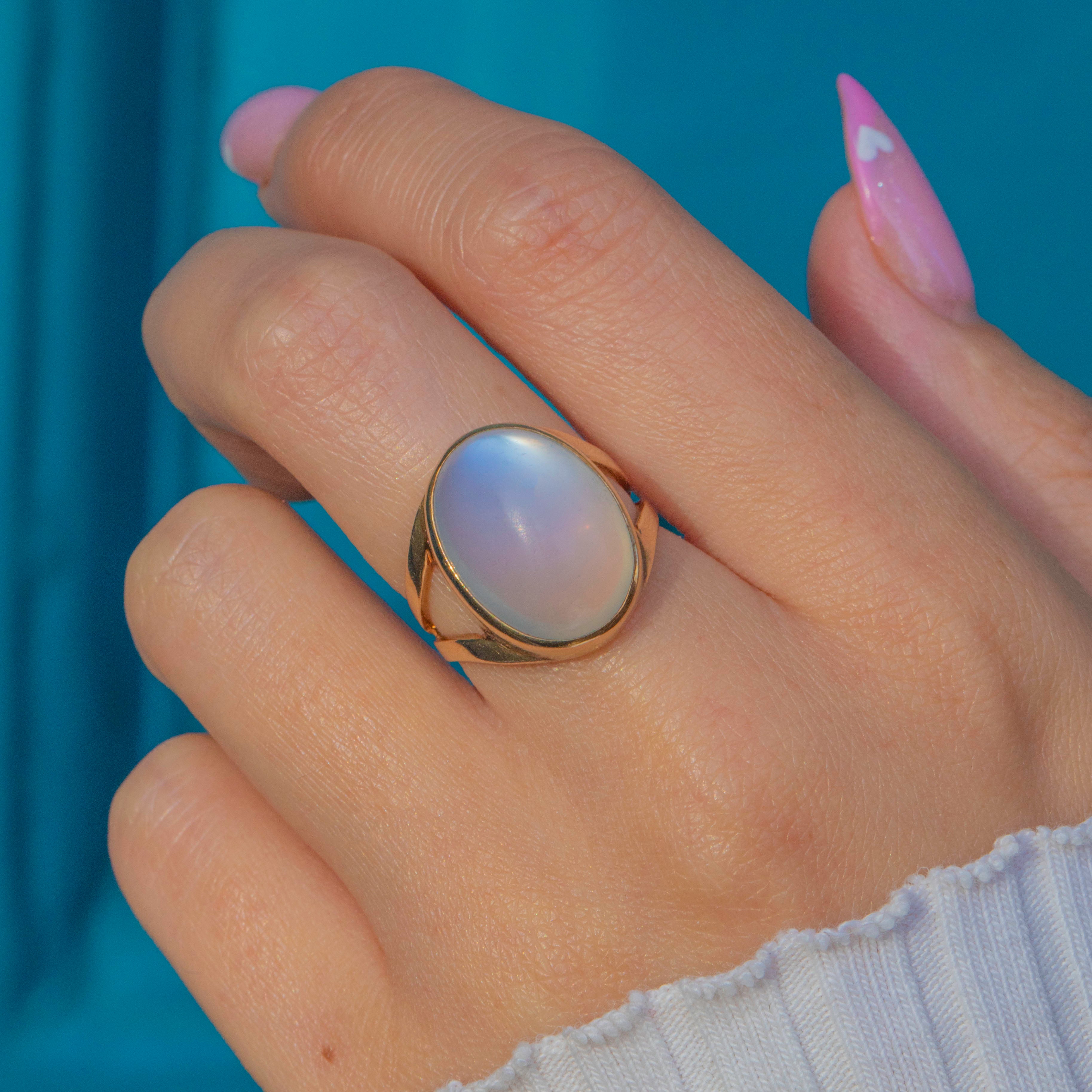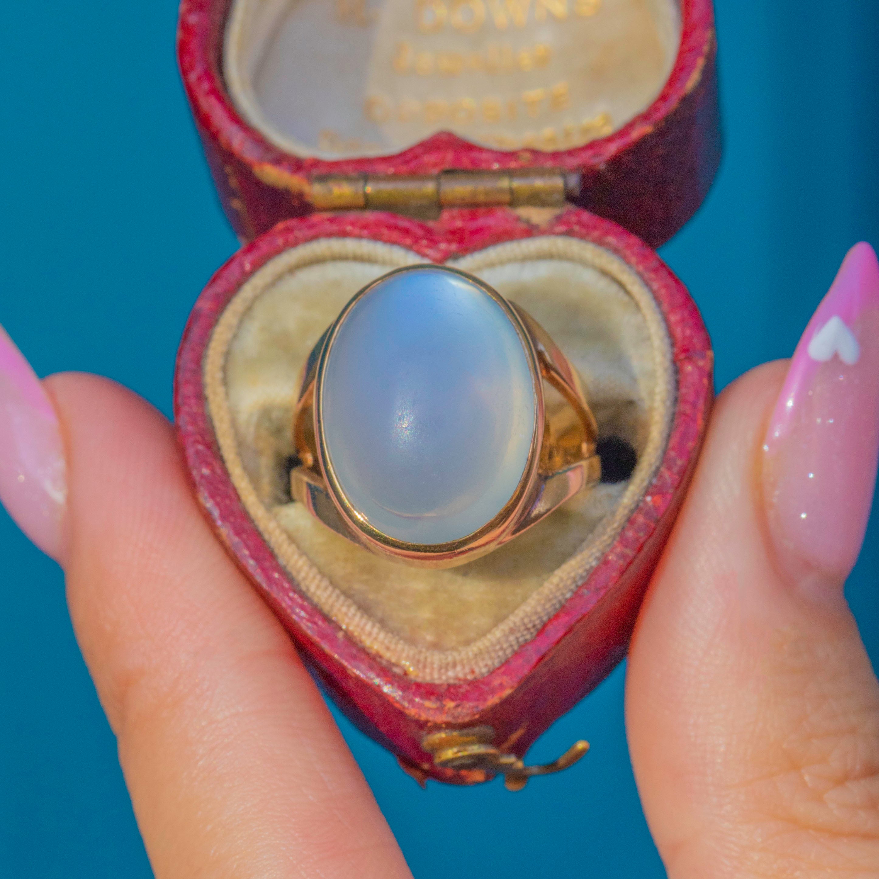 A stunning Victorian Moonstone ring set in a chunky 14ct Gold mount, showcasing an impressive 14.40ct Moonstone cabochon. The stone displays a beautiful billowing adularescence, that magical glow shifting across the surface in shades of soft powder blue.