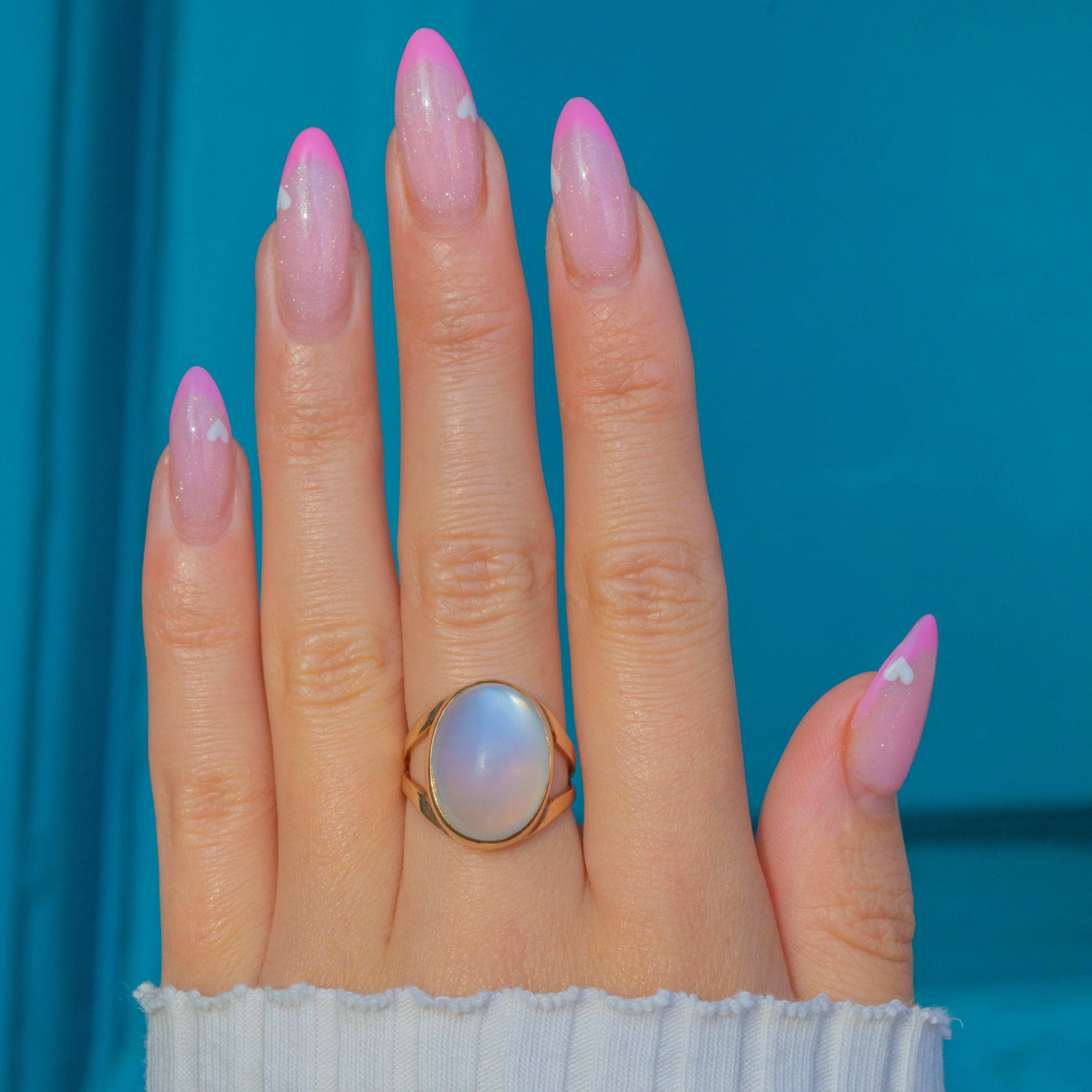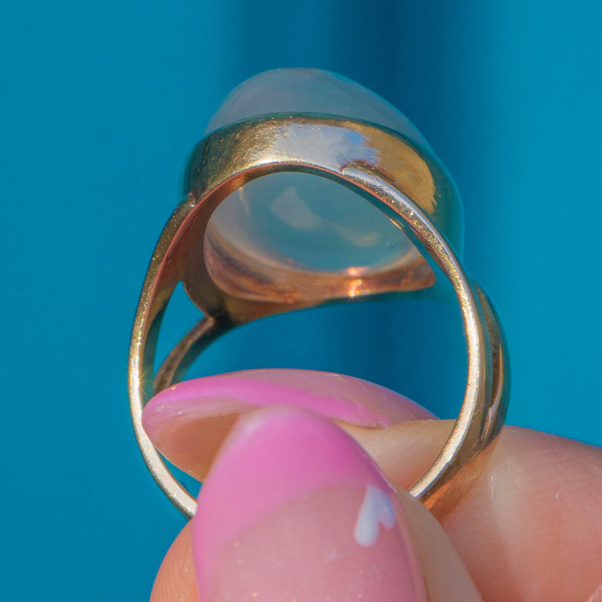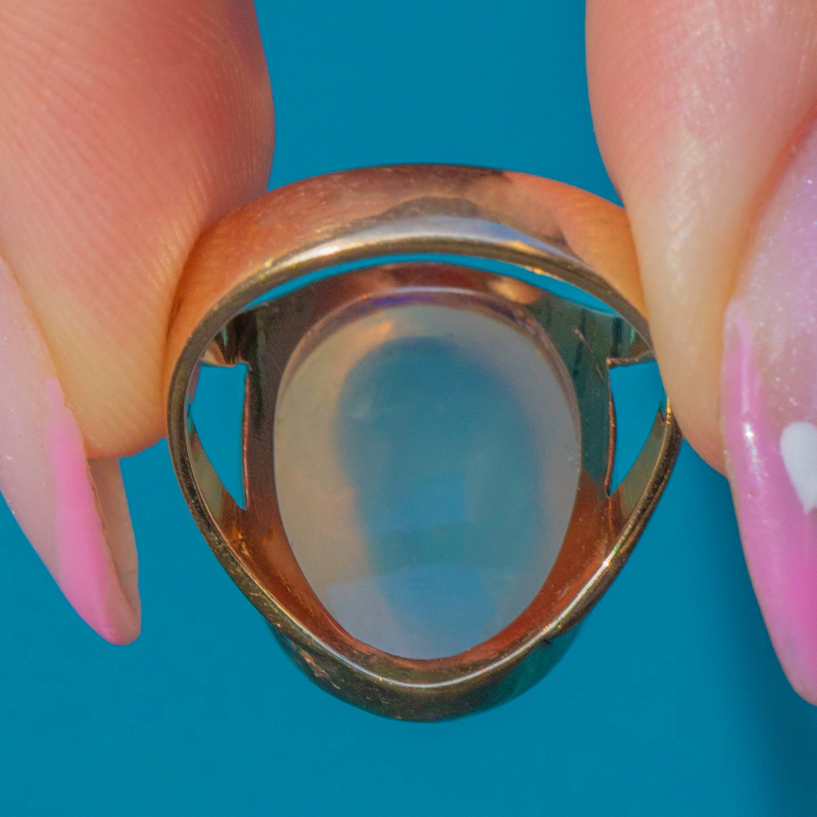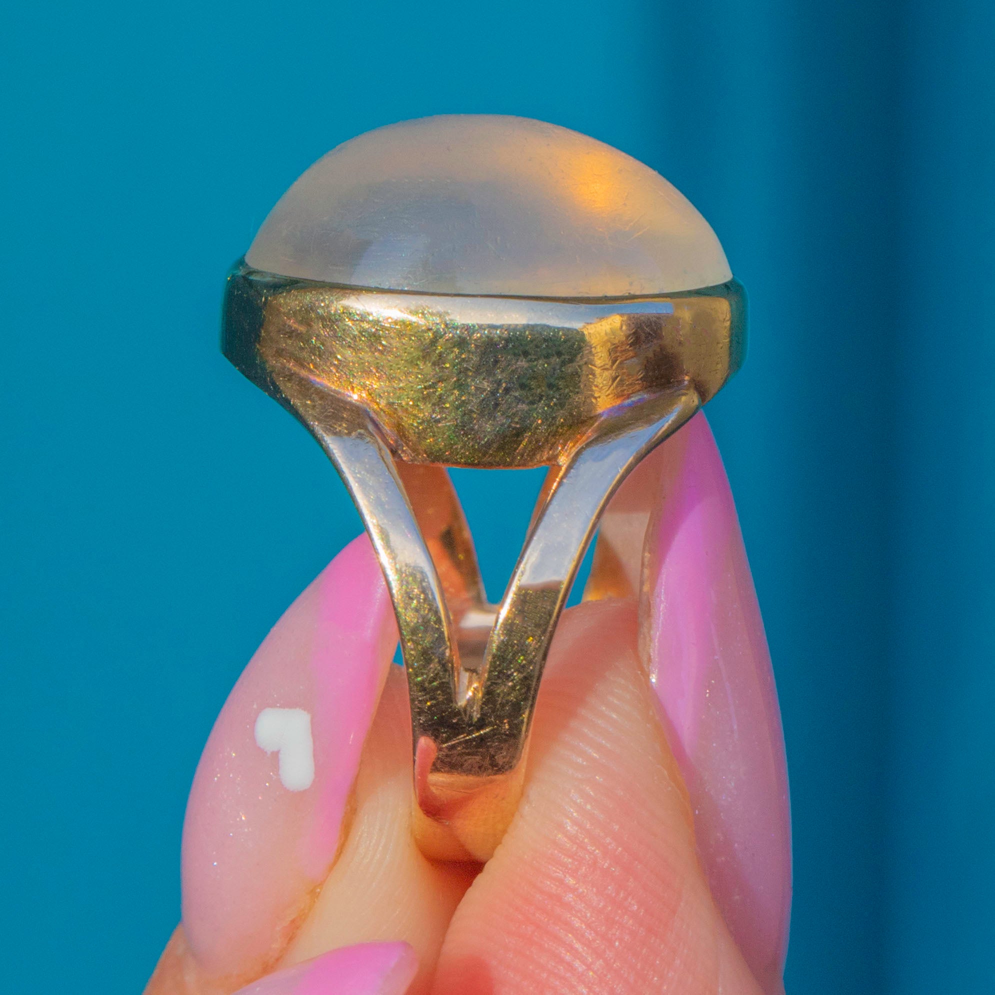 A stunning Victorian Moonstone ring set in a chunky 14ct Gold mount, showcasing an impressive 14.40ct Moonstone cabochon. The stone displays a beautiful billowing adularescence, that magical glow shifting across the surface in shades of soft powder blue.