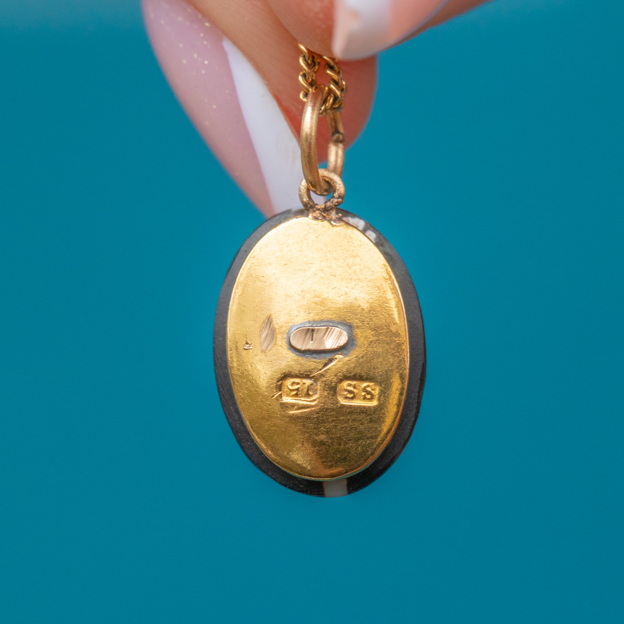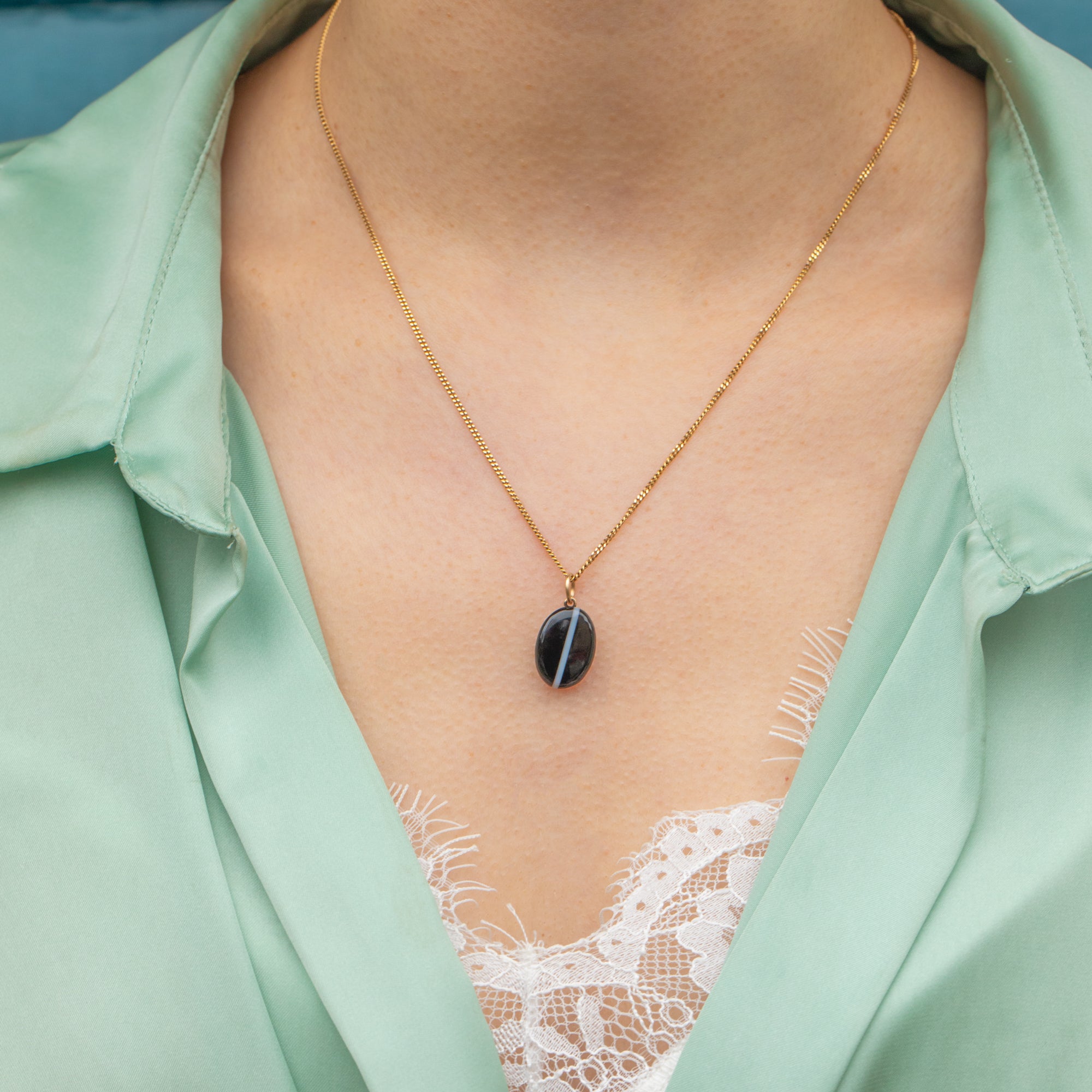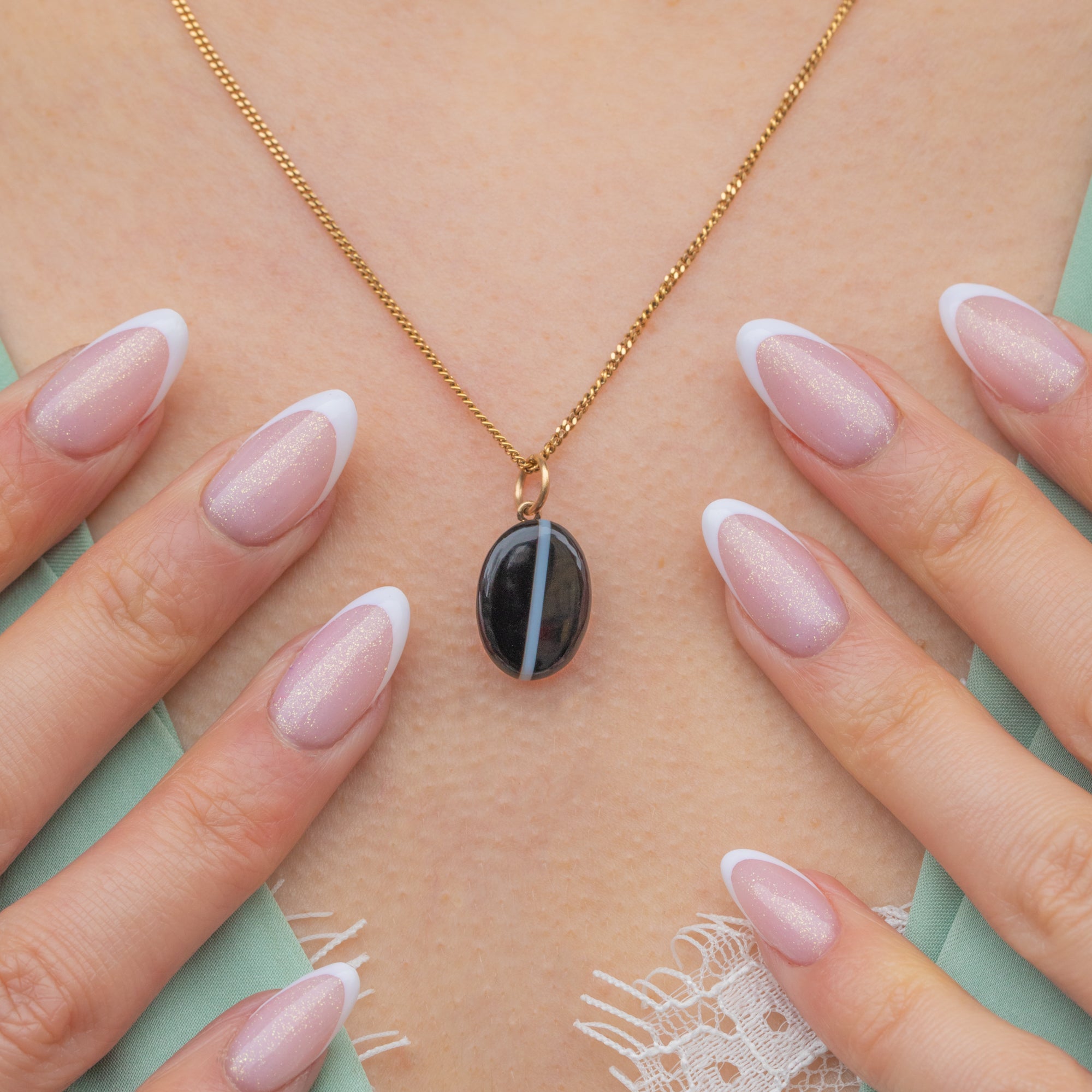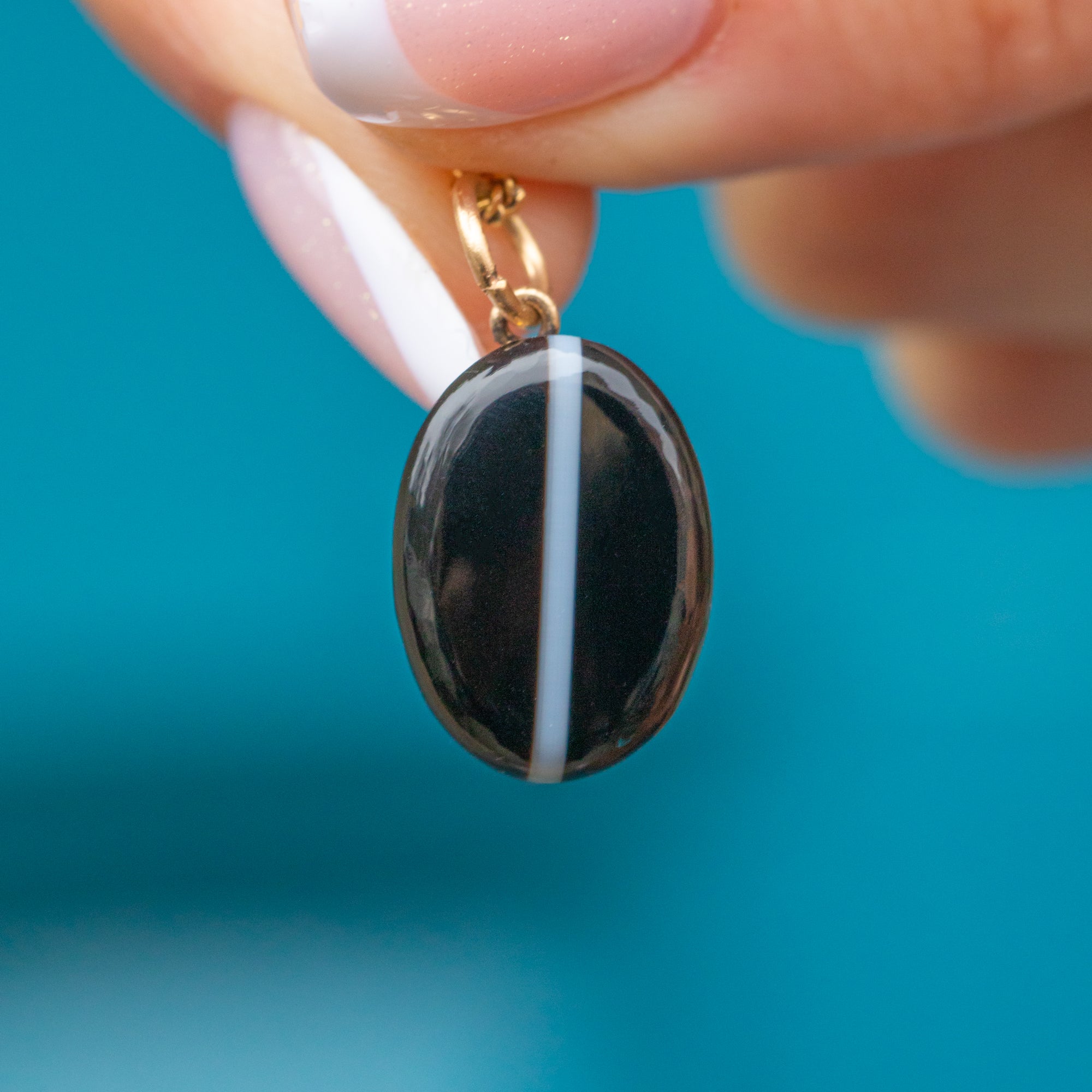 This Victorian 15ct Gold Banded Agate charm will look striking adorning your décolleatge! The smooth inky black Agate displays a contrasting white line down its centre, giving this antique pendant plenty of character.