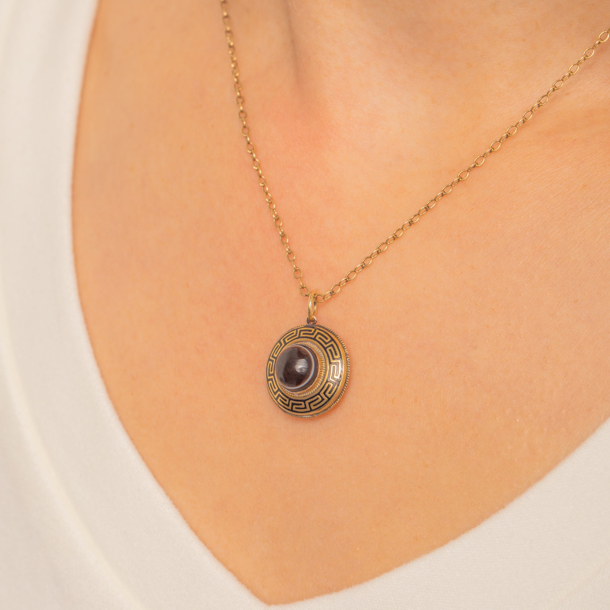 At the centre sits a glossy Banded Agate in a smooth bezel setting, its high domed profile giving wonderful depth and contrast against the inky Enamel. A timeless design with elegant presence, perfect to elevate your favourite chain.