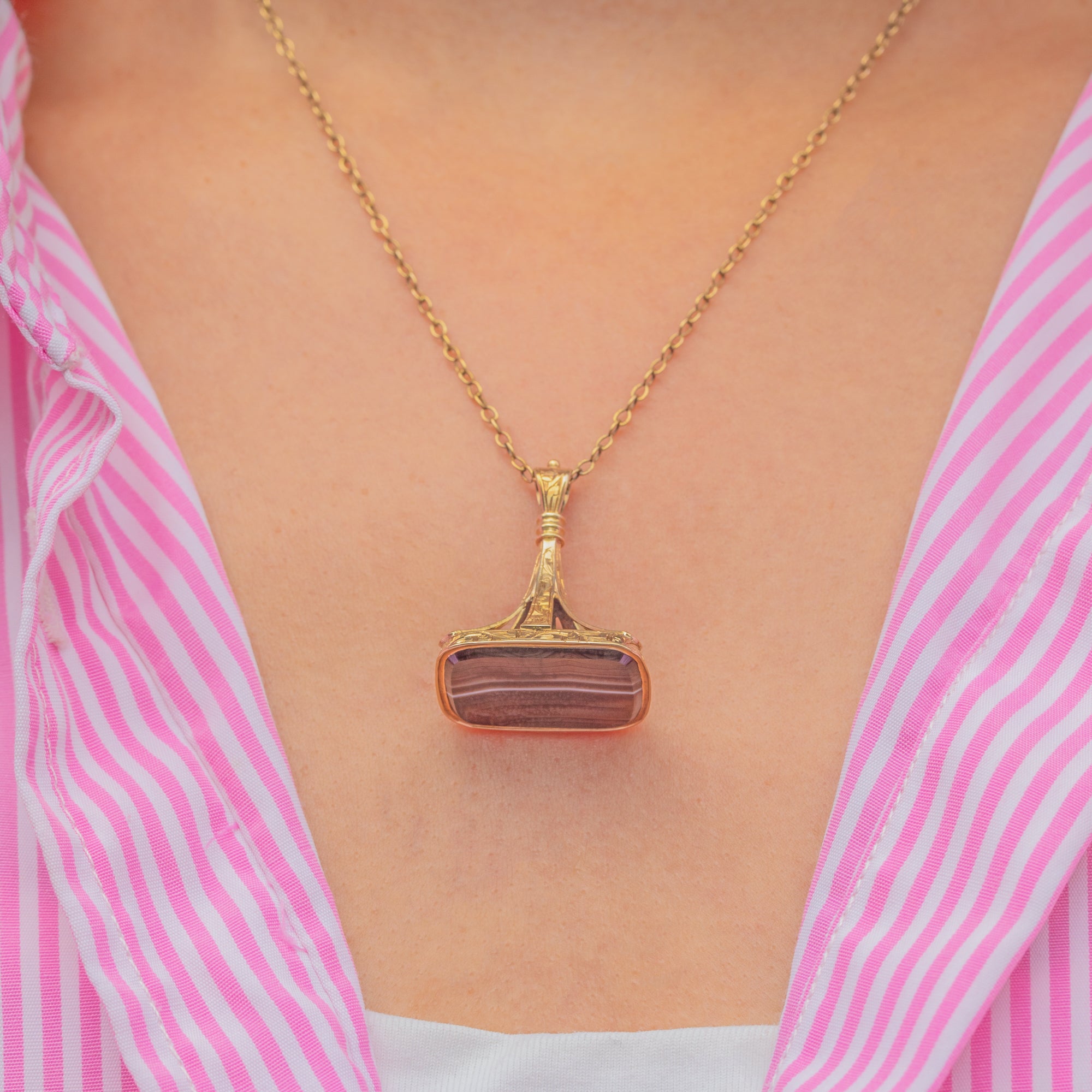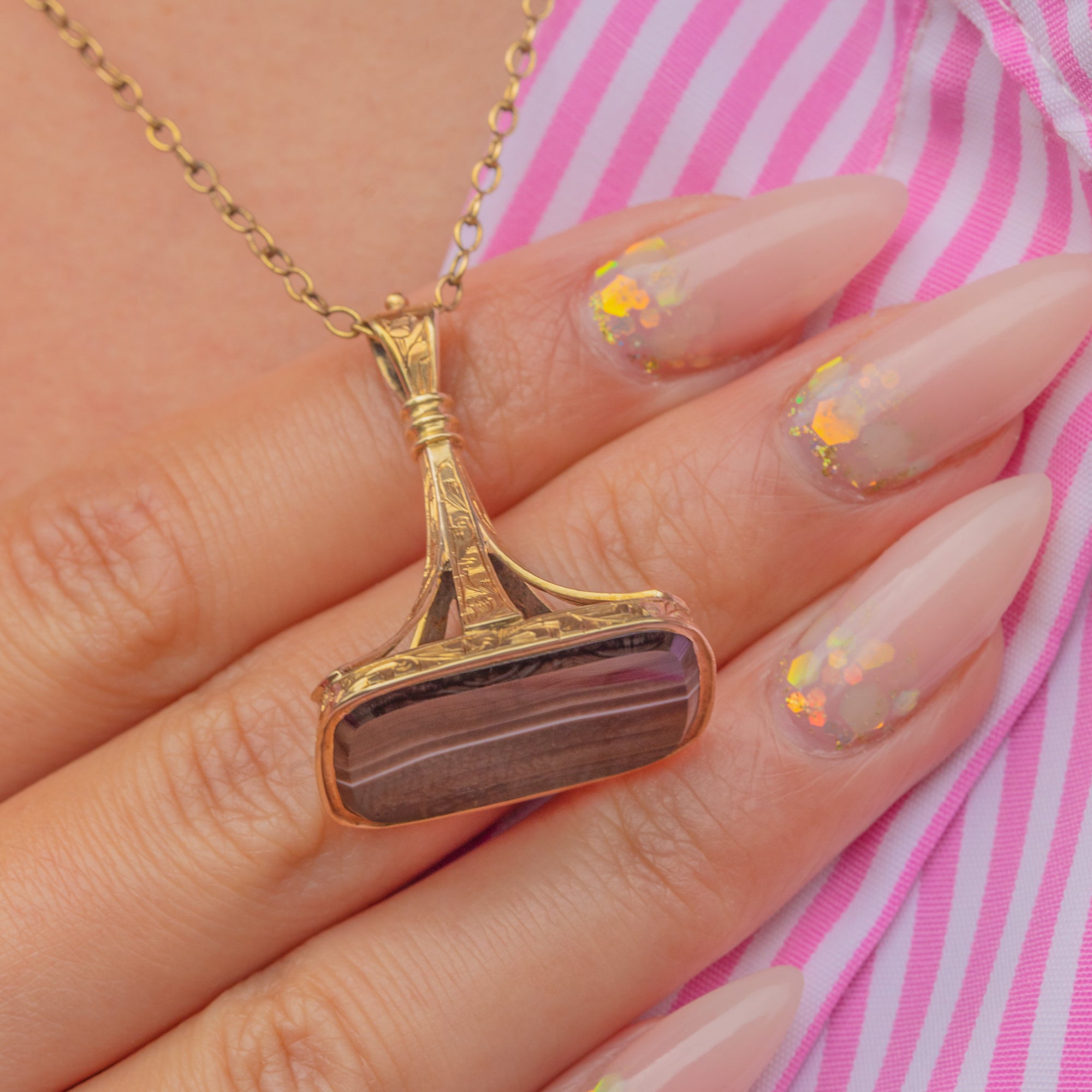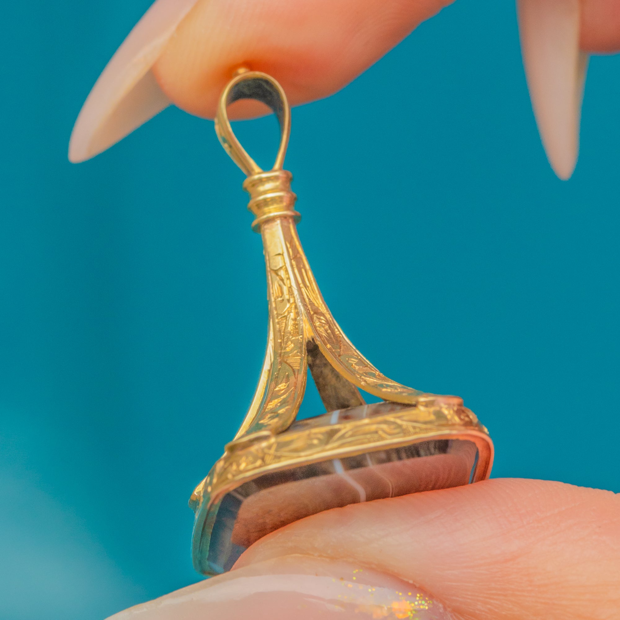 A handsome Victorian fob crafted in solid 15ct Gold, set with a striking Banded Agate. The stone displays natural chocolate, caramel and cream striations, polished to a smooth finish that highlights its depth and patterning. The Gold mount is engraved with delicate foliate motifs, adding refinement and elegance to this antique treasure.