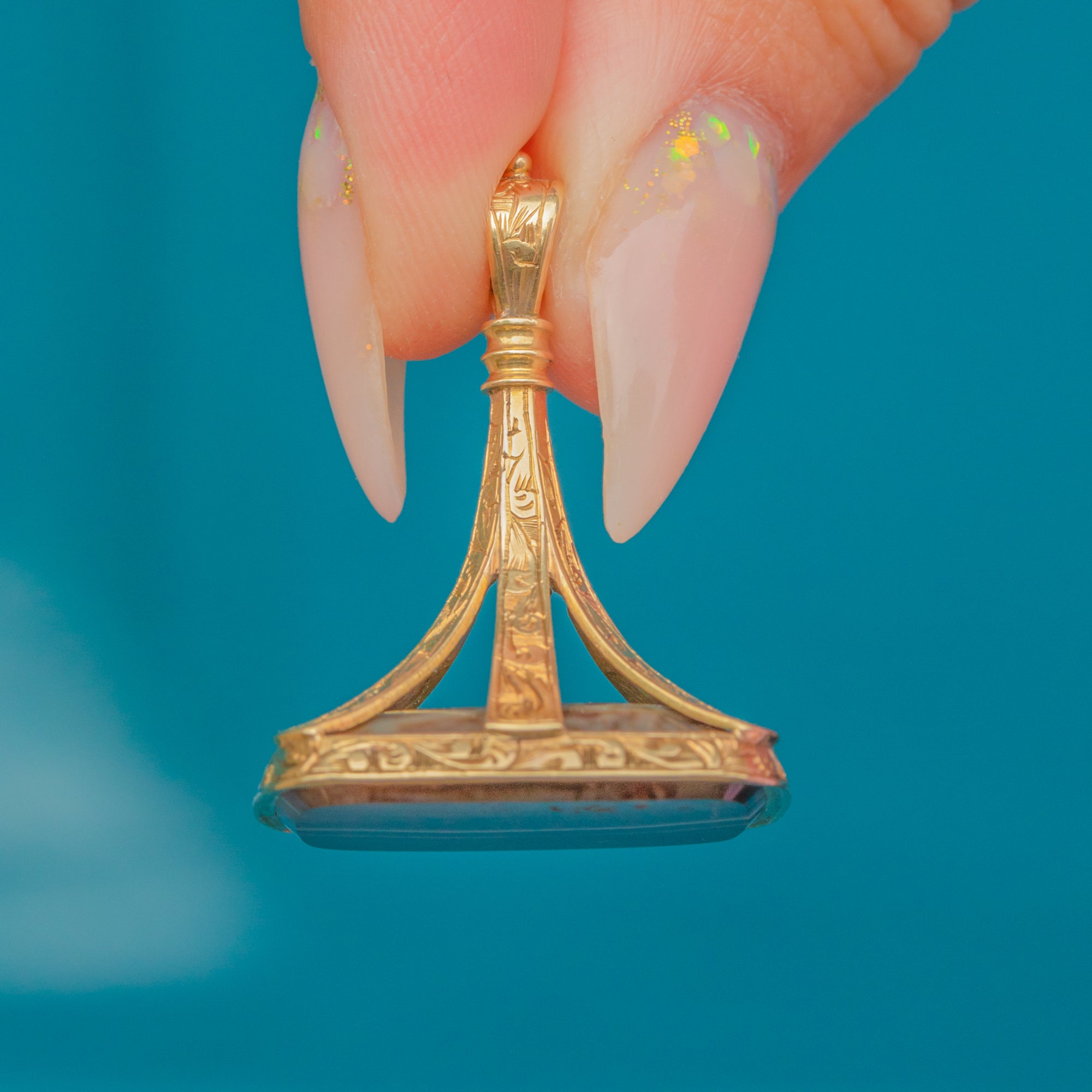 EXCELLENT: The Agate is smooth, secure and displays crisp natural banding. The Gold mount is finely detailed with clear engraving, showing minimal signs of wear. A superbly preserved Victorian fob.