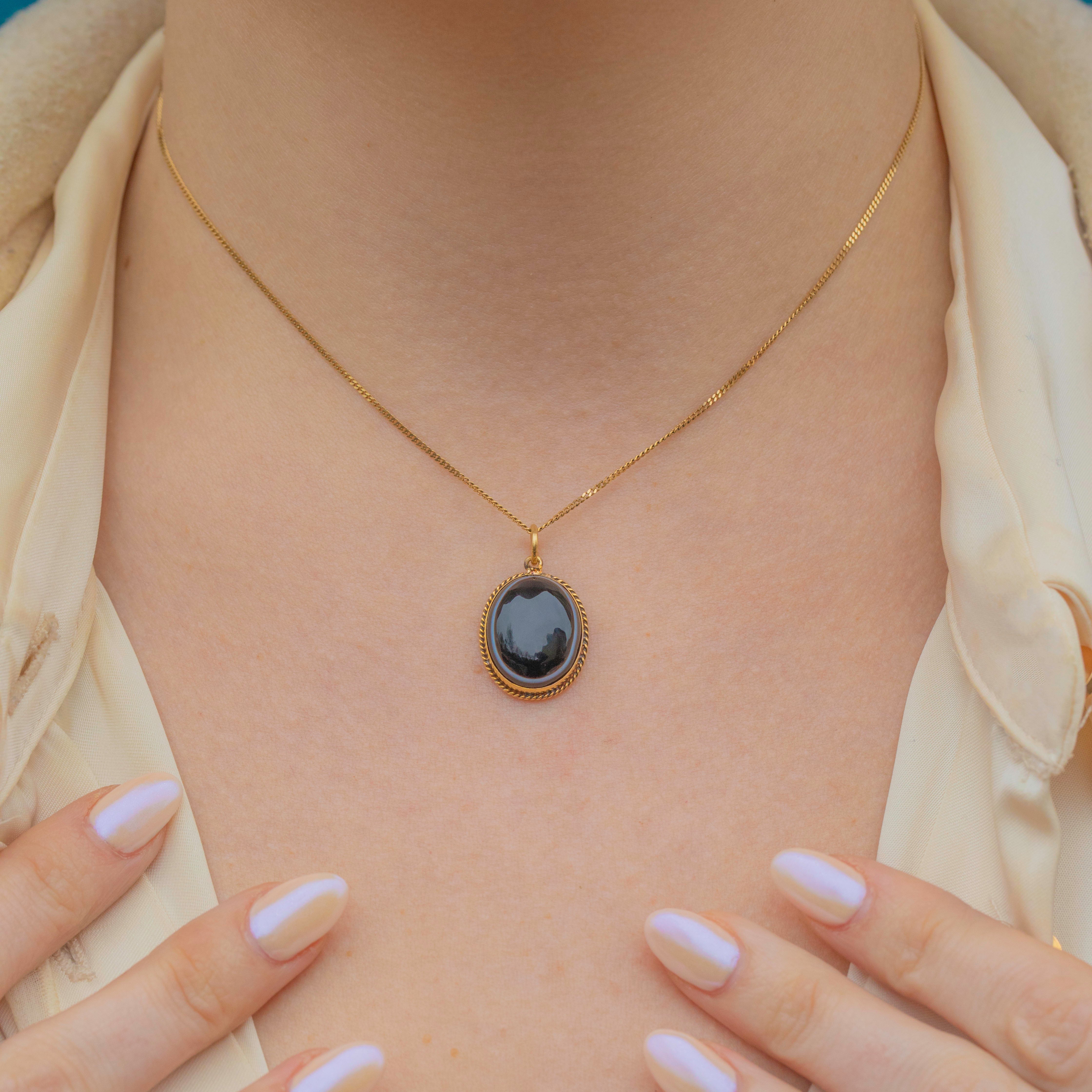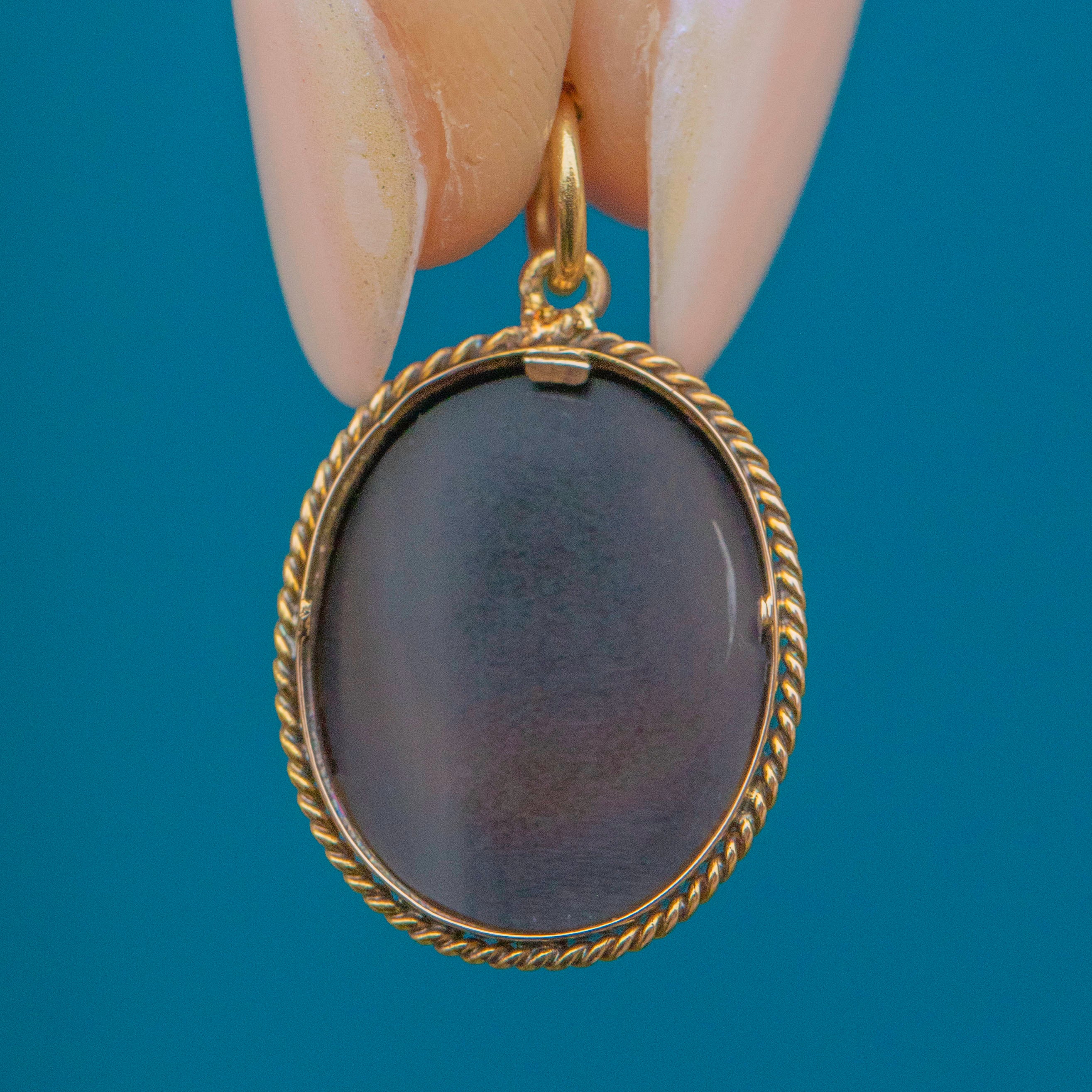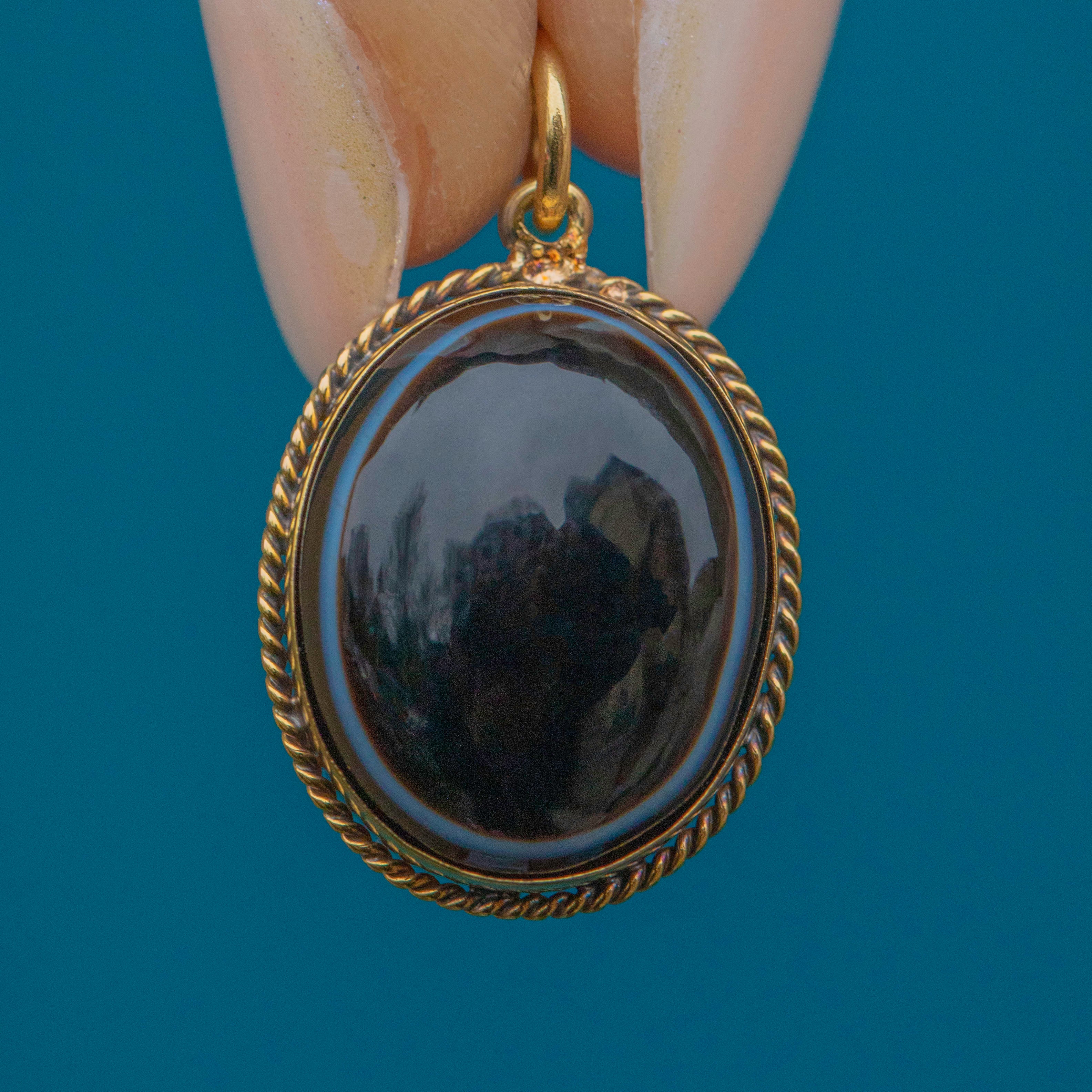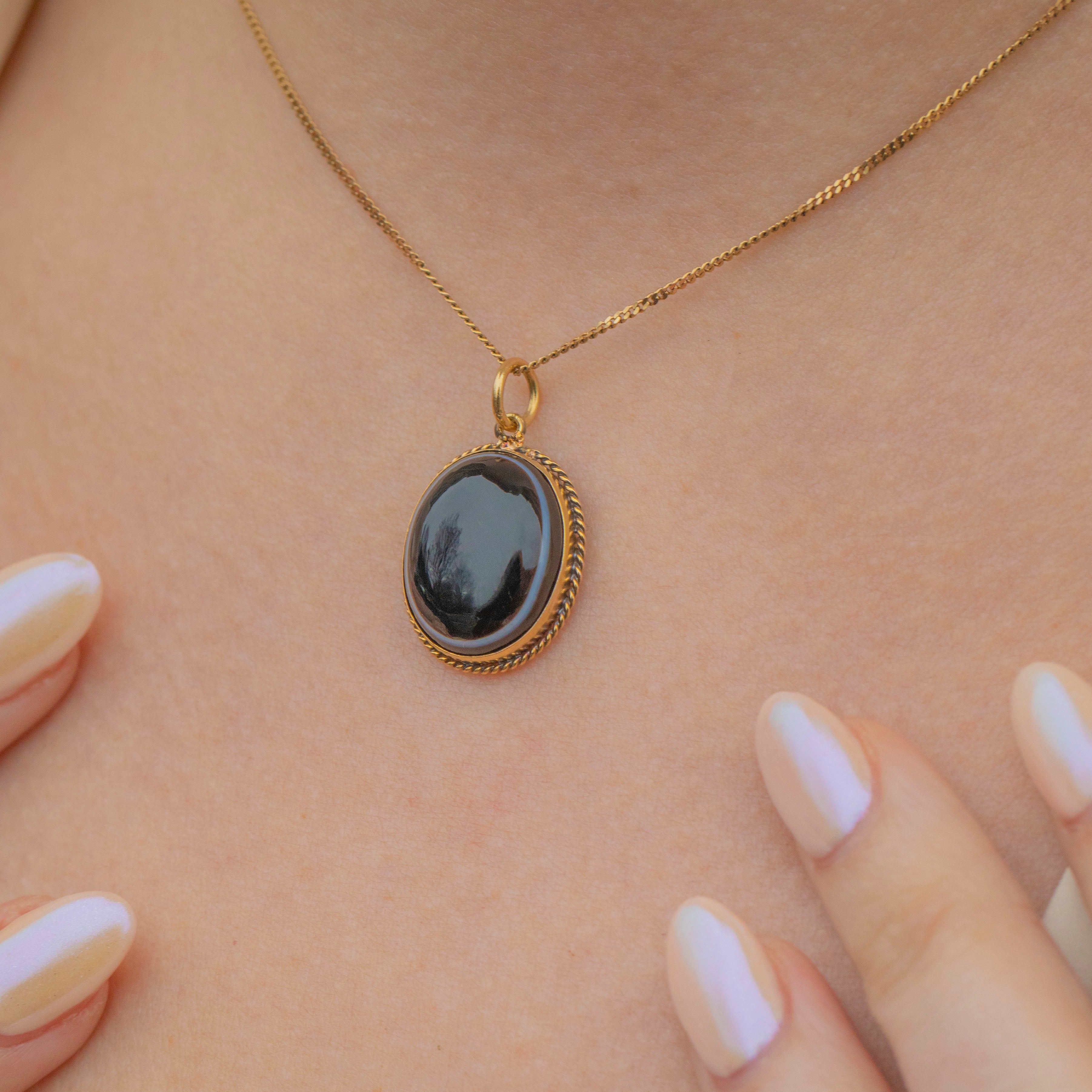 Prepare to lose yourself in this Victorian 15ct Gold Banded Agate pendant! Boasting an inky Agate with a thin white band haloing her circumference, she is complemented by 15ct Gold roped border radiating around her edges.