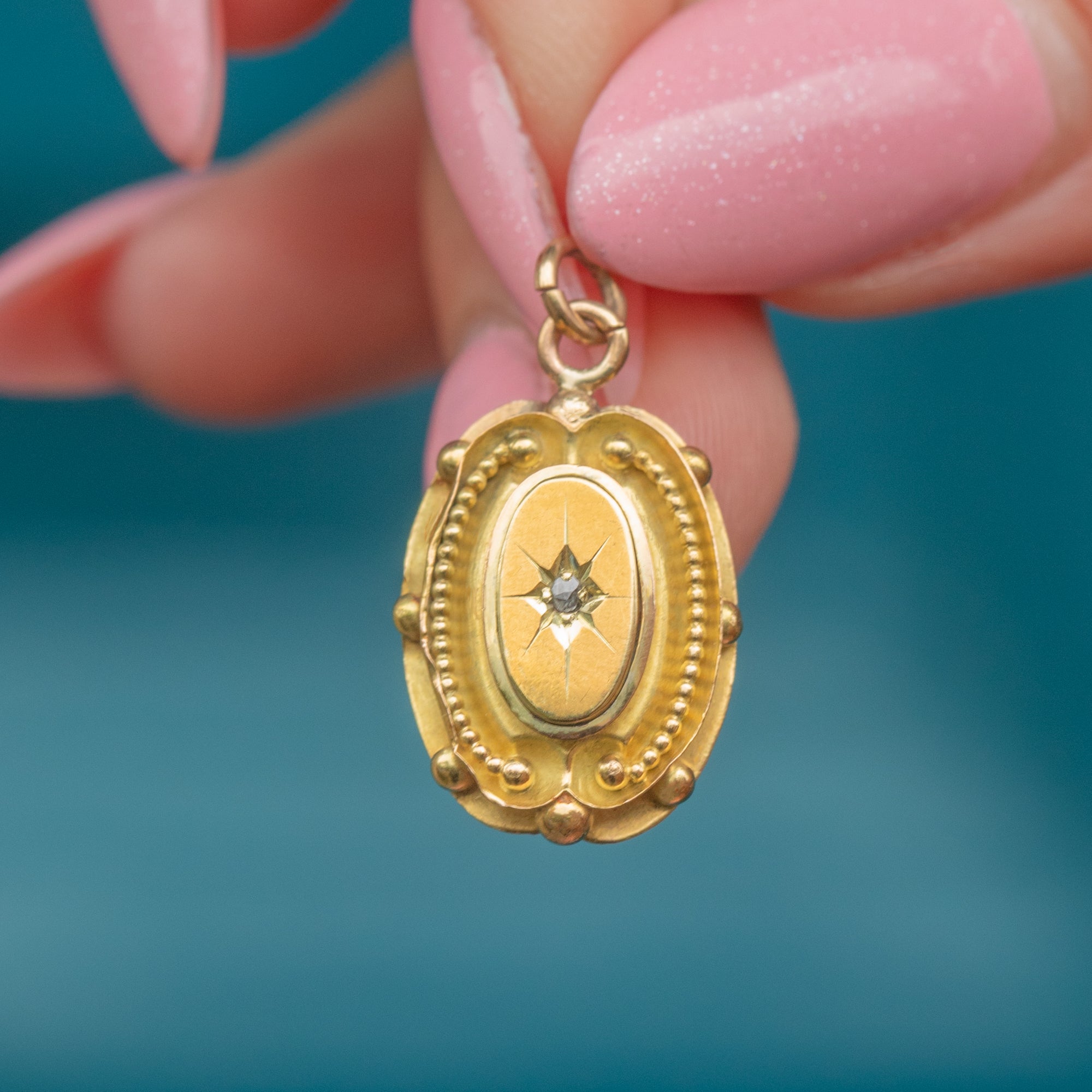 Add a touch of celestial allure to your outfit with this delightful Victorian 15ct Gold Diamond star-set charm! Brimming with Victorian character and centred by a dainty star-set Diamond, this antique pendant is the perfect treasure for everyday wear.