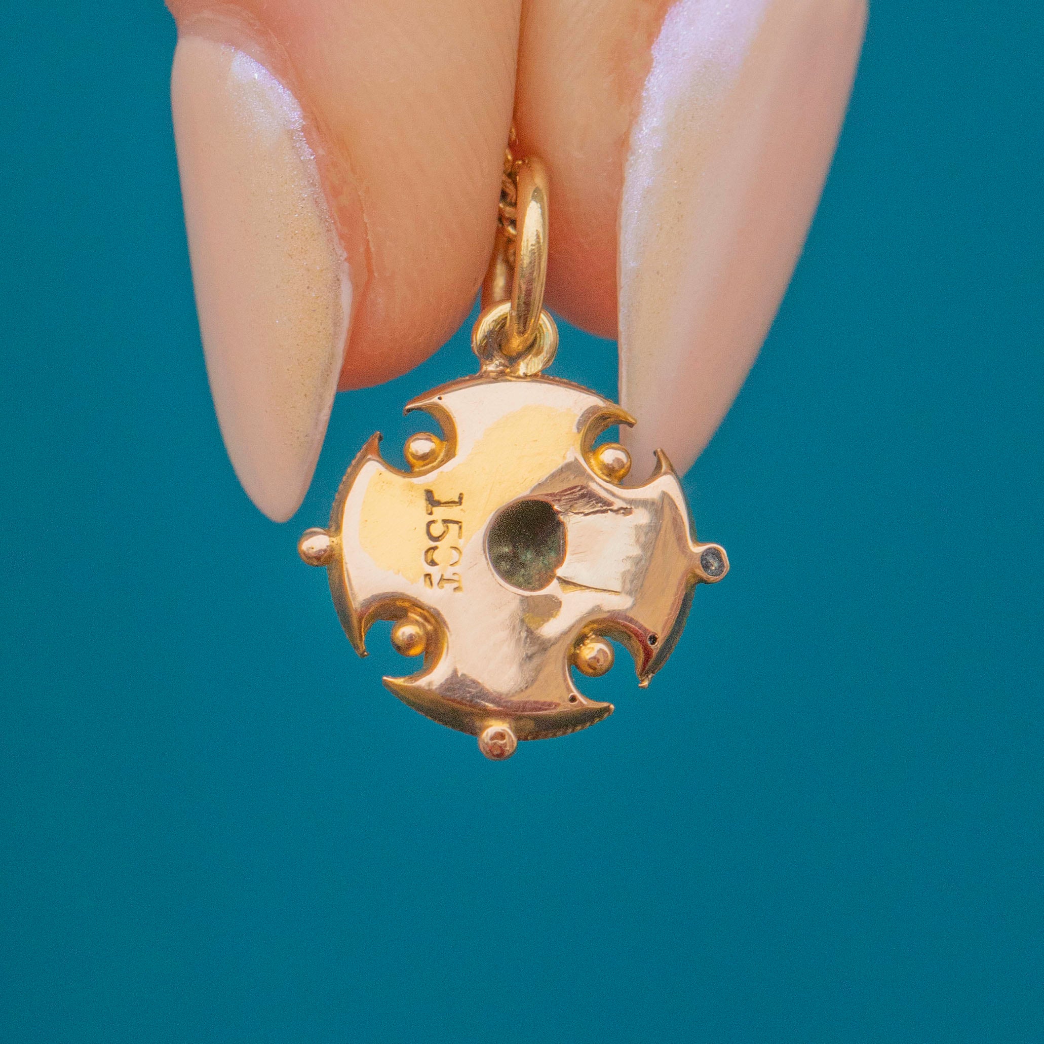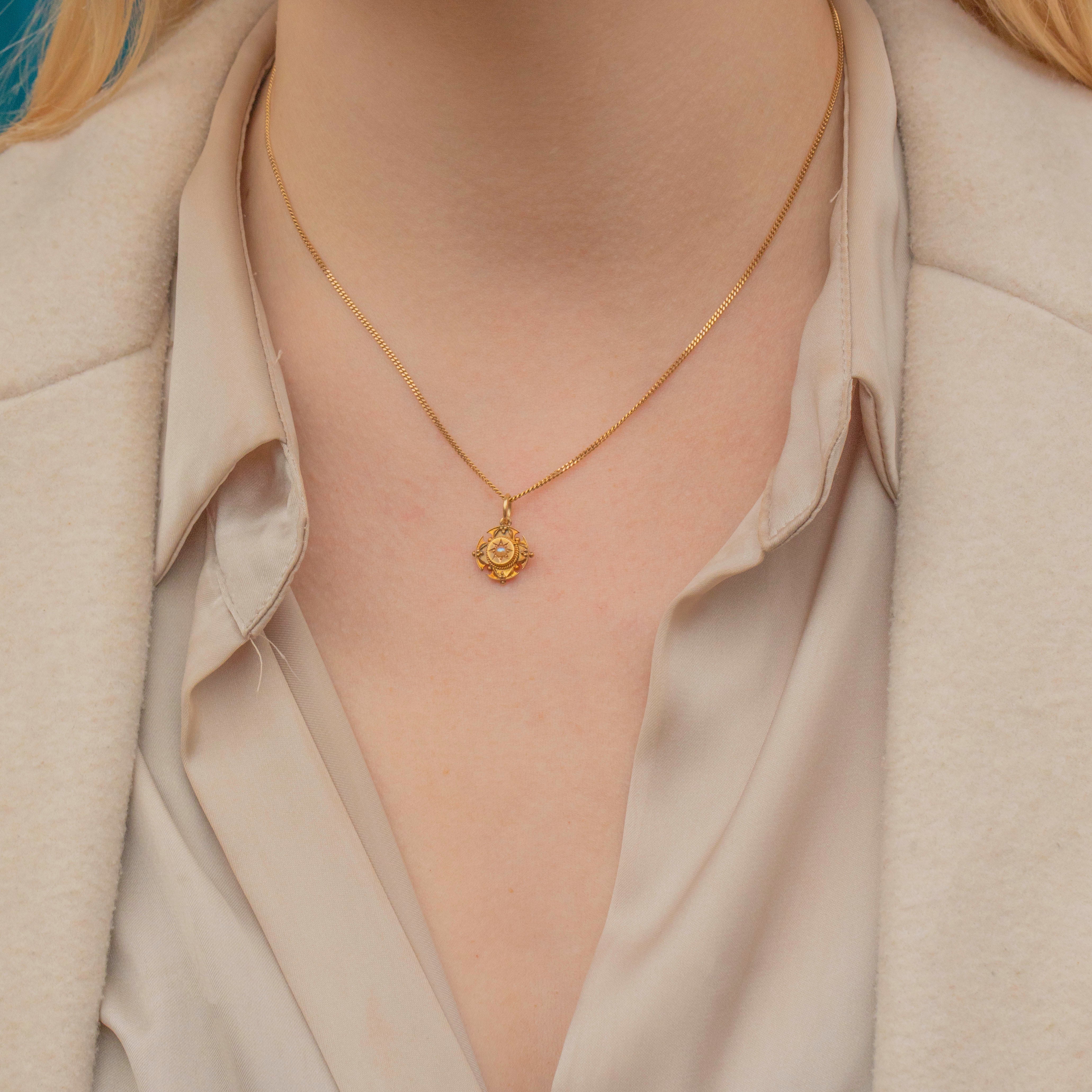 VERY GOOD. This Victorian 15ct Gold Etruscan Pearl charm is in very good condition. The Gold has a lovely saturation and the details on the front have remained defined. There are some signs of a conversion on the back, but this has been carried out well and the pendant wears smoothly against the skin. The Pearl is securely set and free from surface wear. With so much wear potential, don't hesitate to make this Victorian Gold charm the newest addition to your collection!
