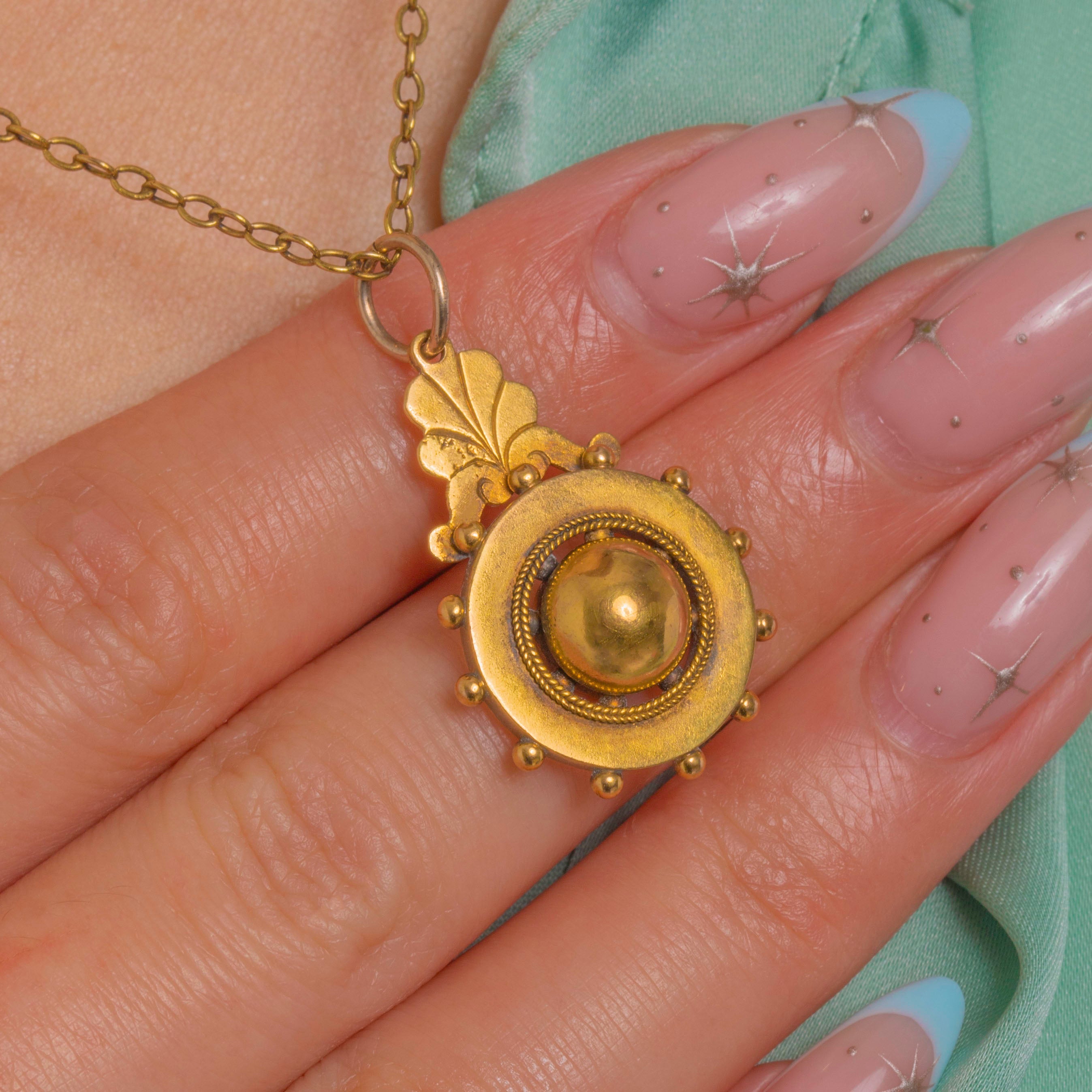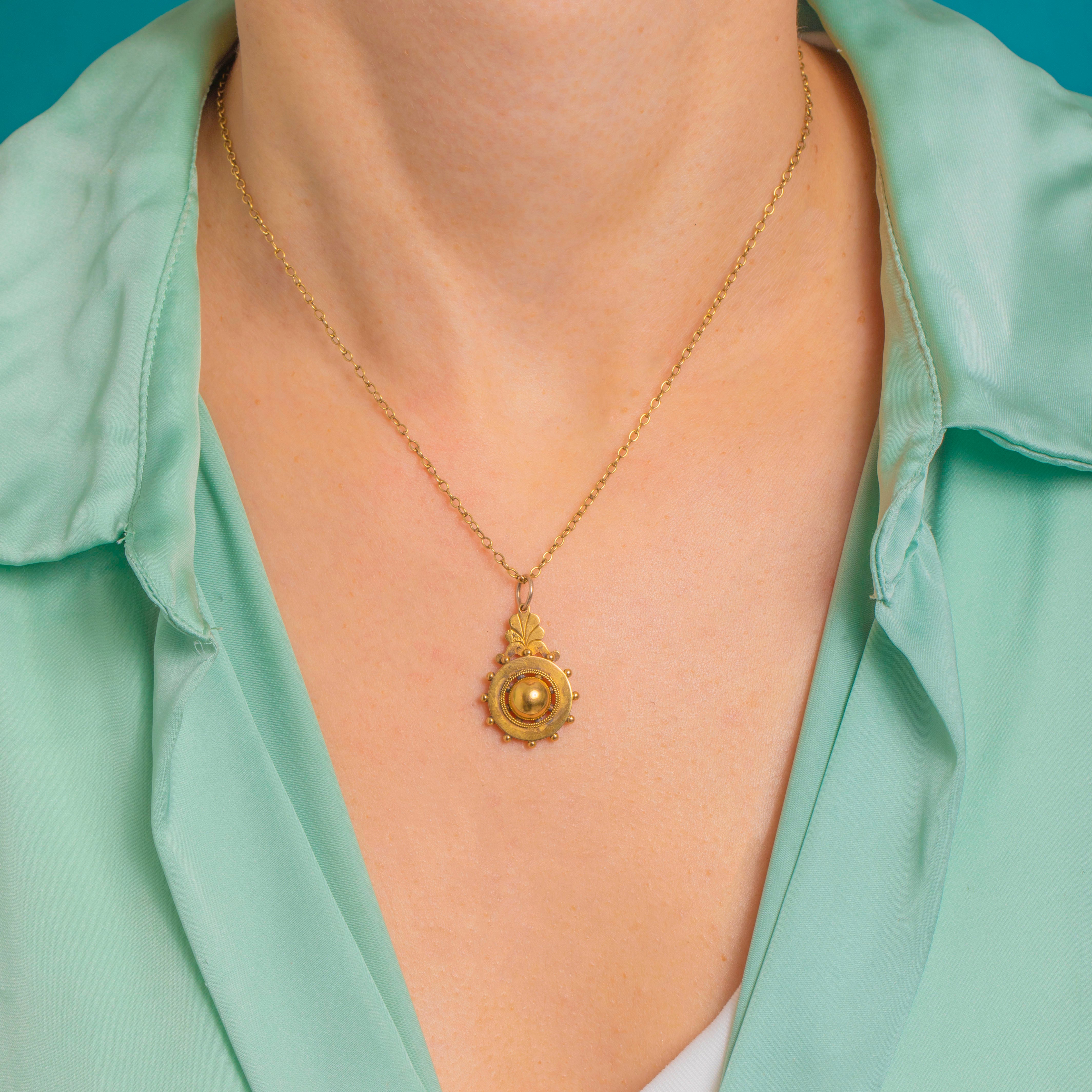 Entirely Gold and wonderfully wearable, it suspends from a fixed hasp with a jump‑ring bail, ready to grace your favourite chain. The refined granulation and wirework add texture and glow, making this a timeless treasure for everyday.