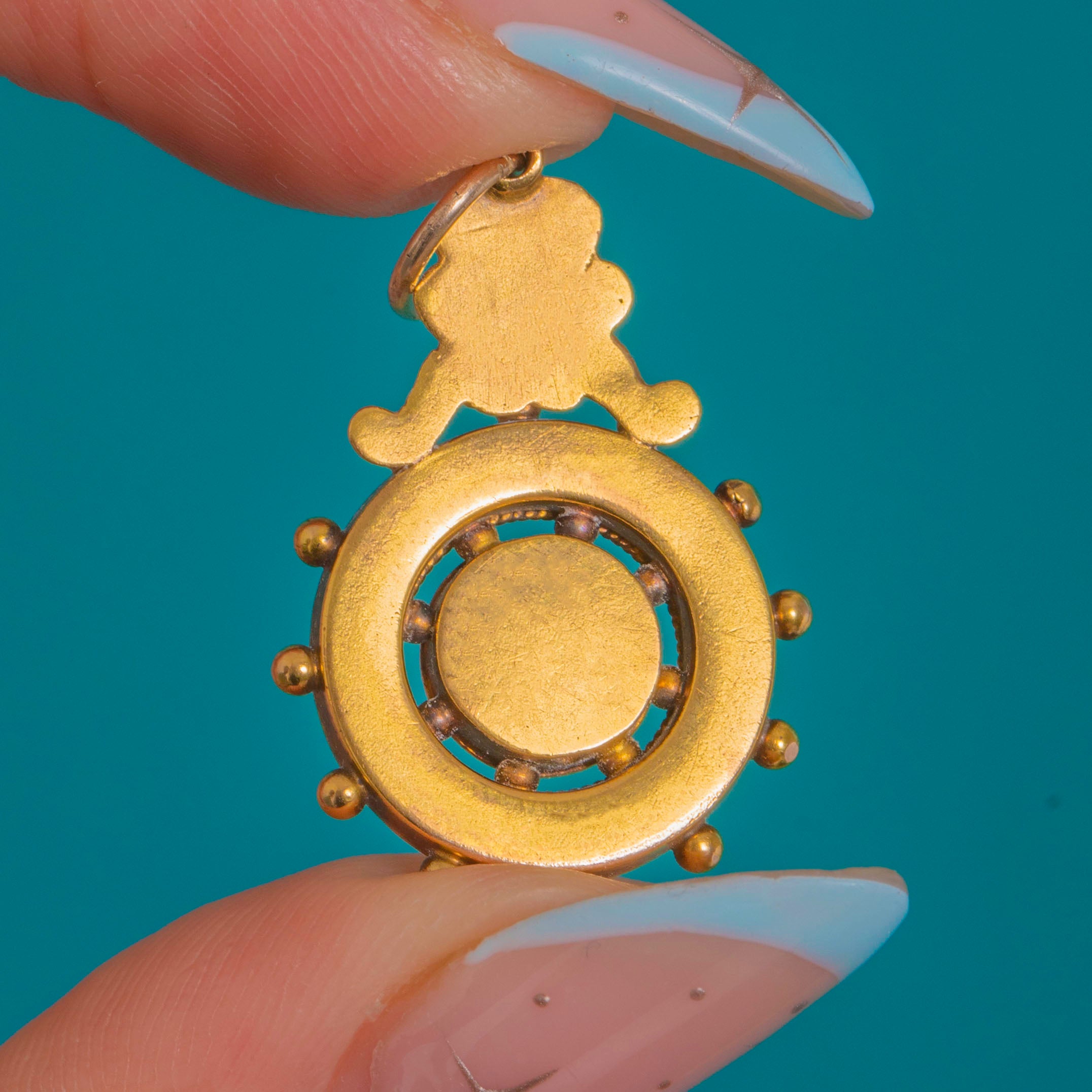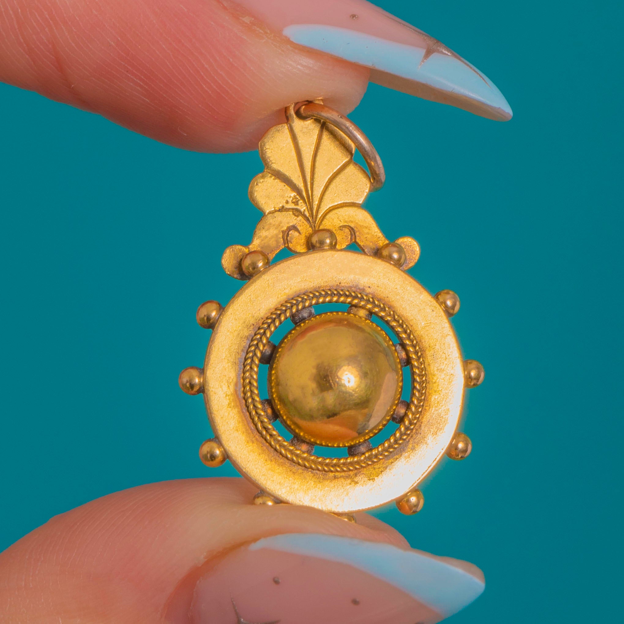 A dainty Victorian Etruscan revival drop charm in rich 15ct Gold, modelled with a raised domed boss within a rope‑twist ring and a neat border of applied granules, crowned by a petite palmette surmount. Elegant and petite, its hand‑finished details and mellow antique patina give it that coveted Archaeological revival allure.