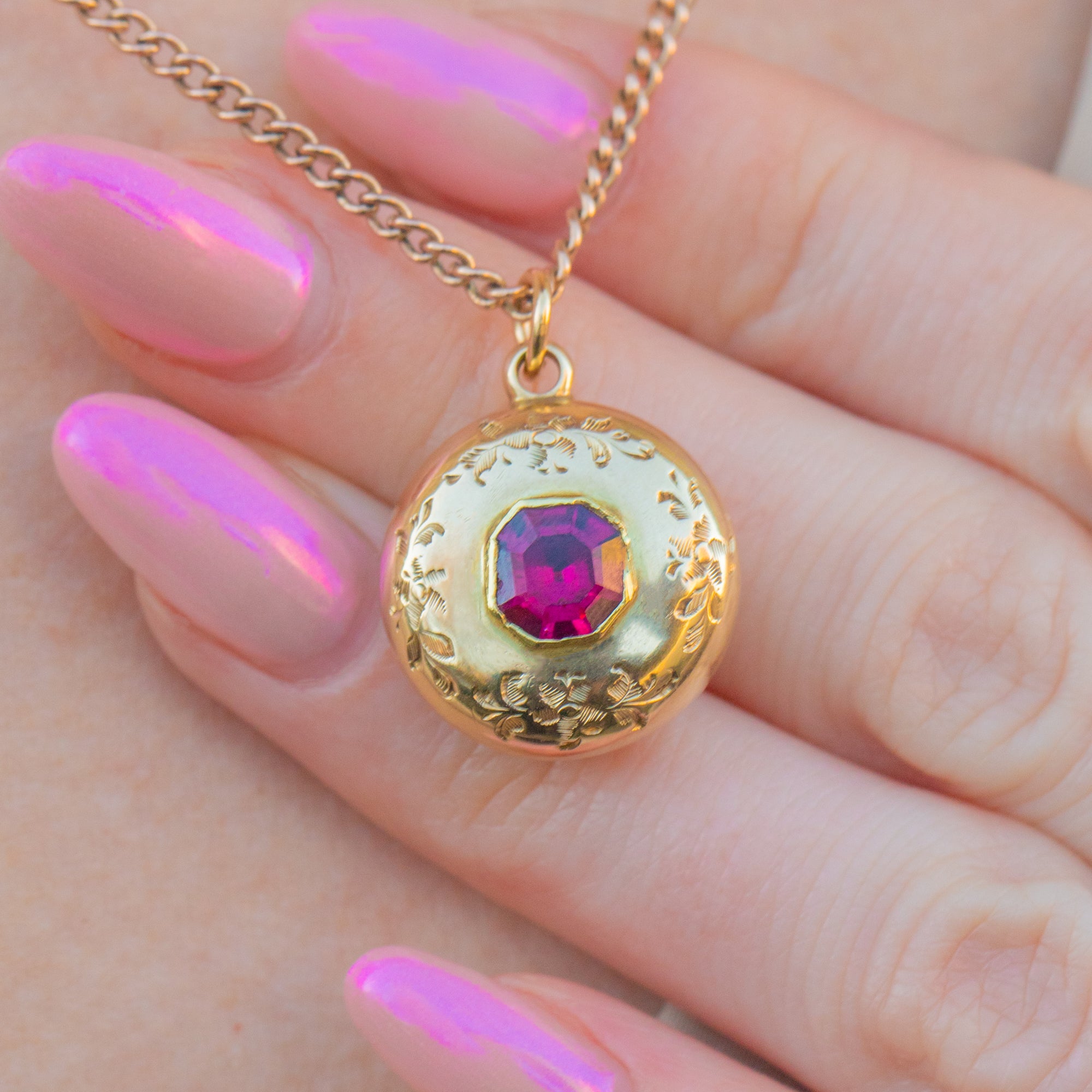 Fall in love with this Victorian 15ct Gold floral engraved Garnet pendant. This characterful pendant is a satisfying dome shape, engraved with floral motifs and a cherry red Garnet.