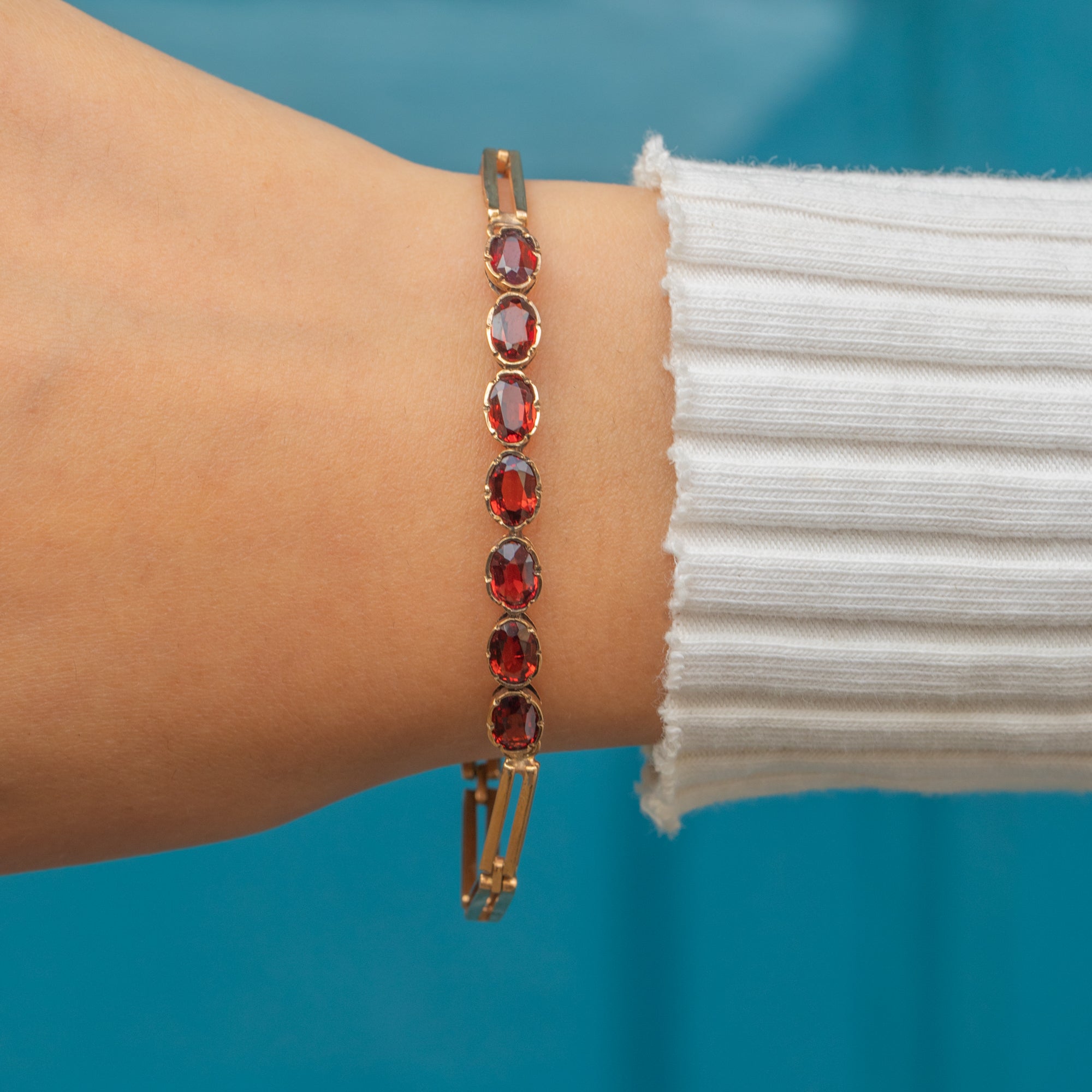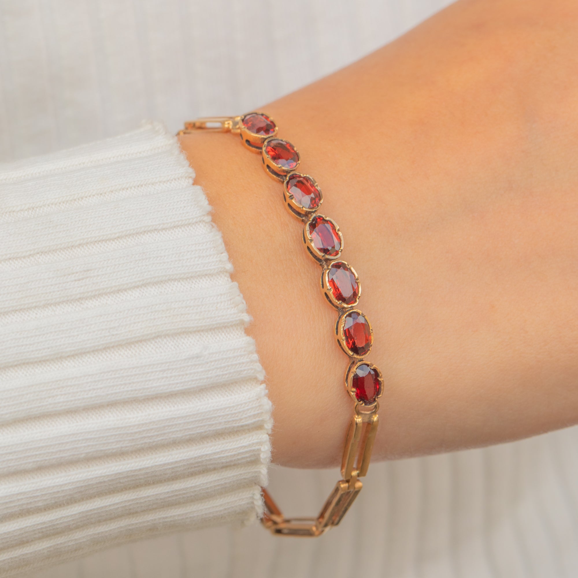 This Victorian bracelet is crafted in 15ct Gold and set with seven glowing Garnets. The stones, with their deep claret hue, are oval faceted and mounted in scalloped collet settings that catch the light beautifully.