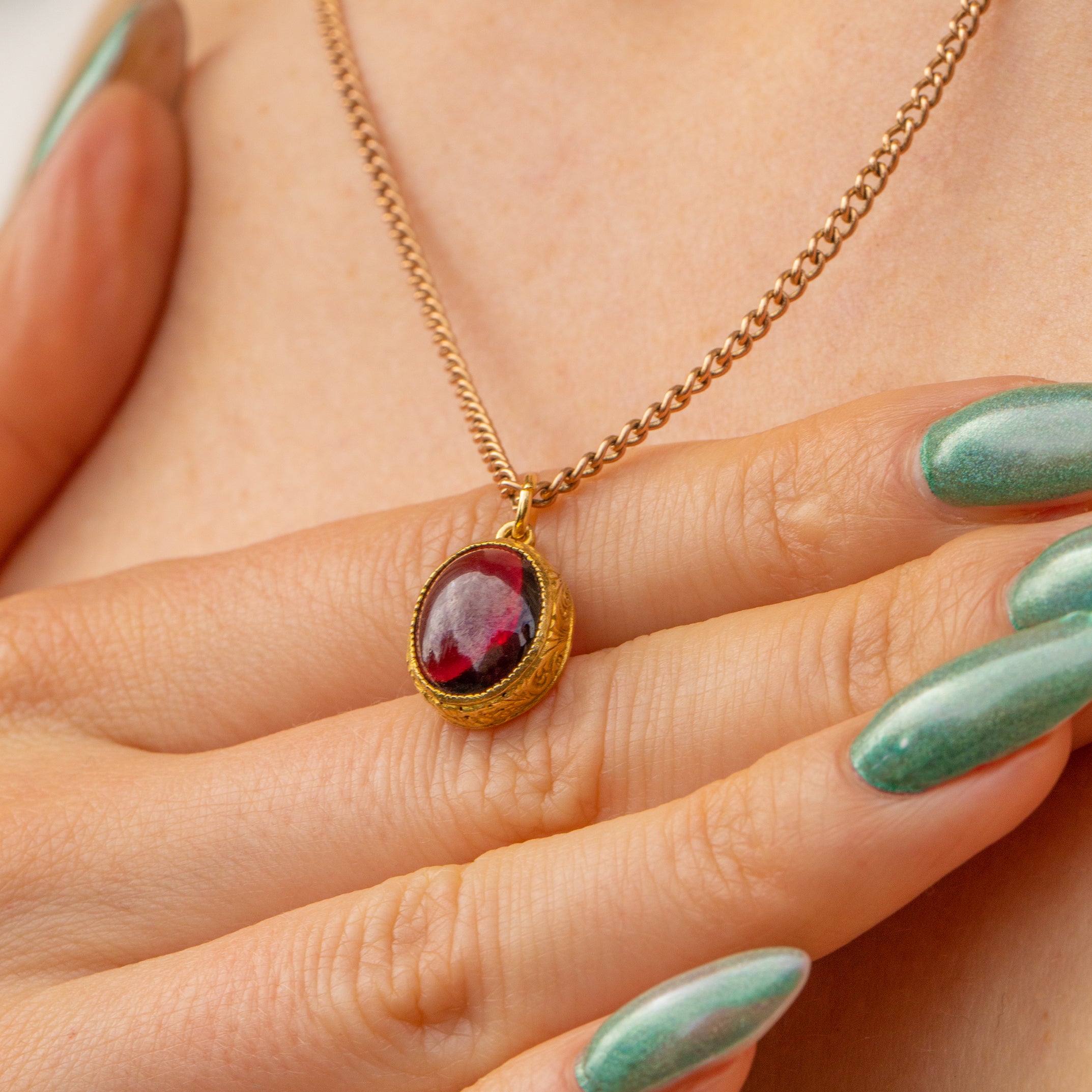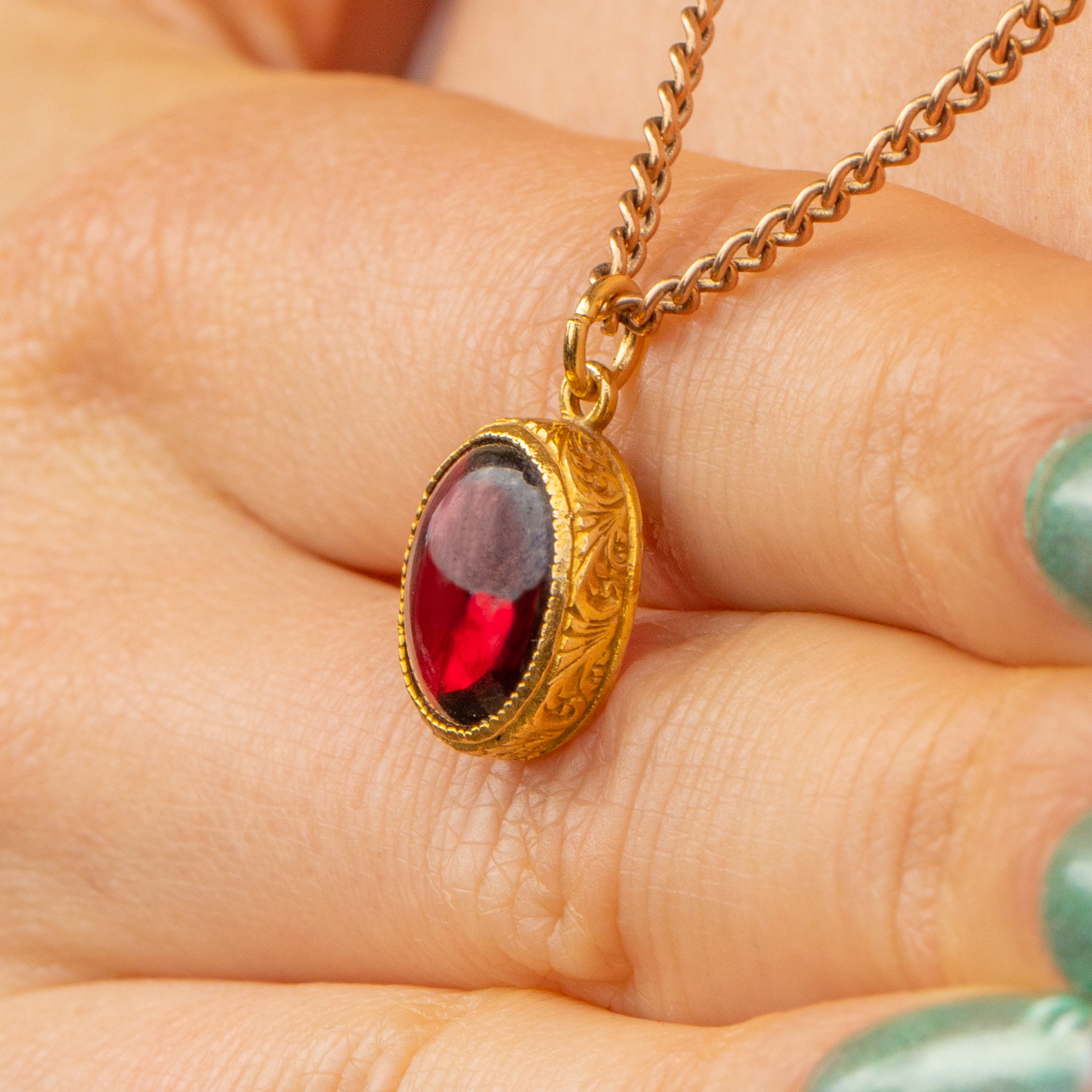 EXCELLENT. This Victorian 15ct Gold Garnet cabochon pendant is in excellent condition. The Garnet cabochon is smooth to the touch, with colours changing as she's held beneath the light. The engravings are crisp and the bezel setting perfectly forms around the Garnet. Bringing glamour in abundance, you will never want to take this antique Garnet pendant off!