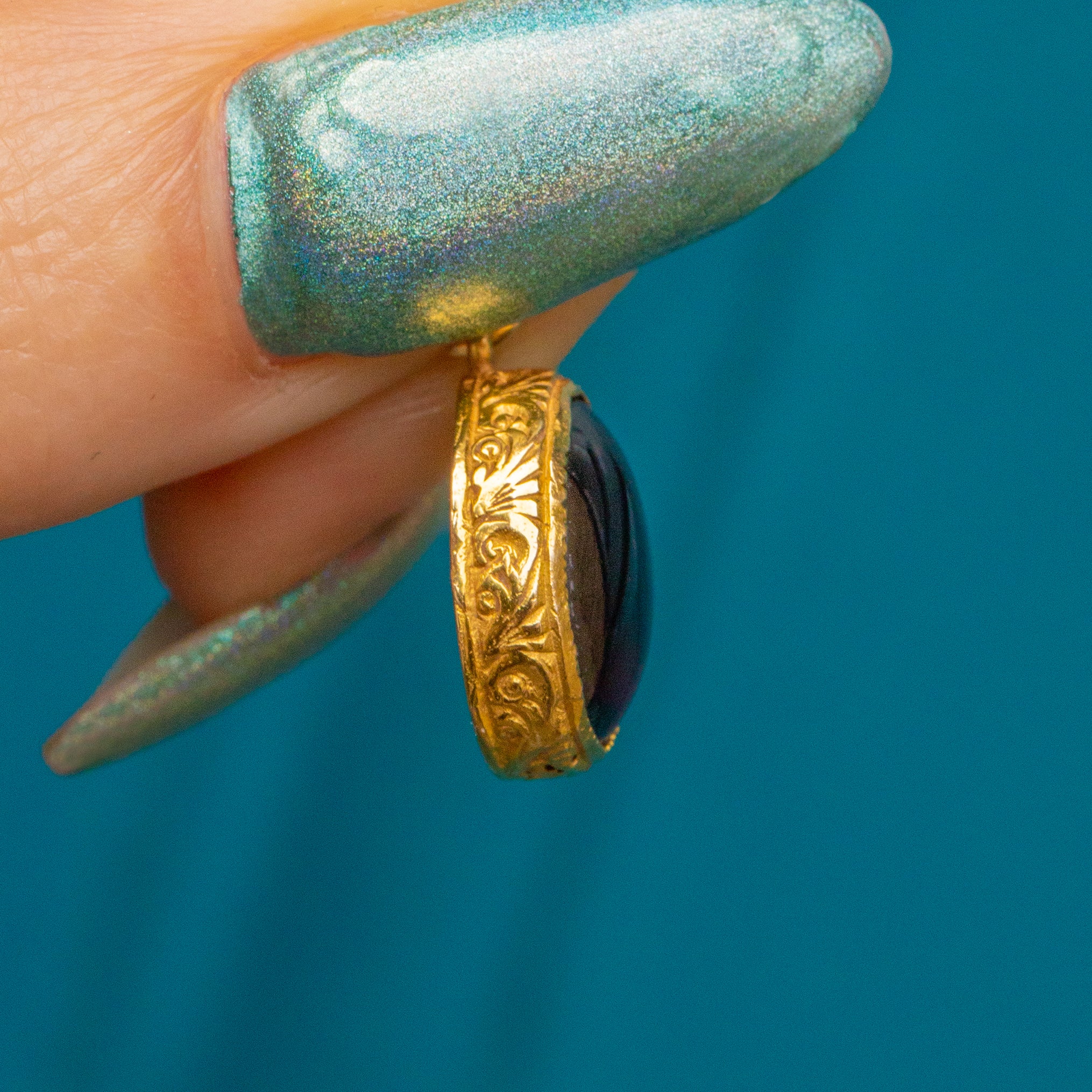 As well as securely holding her Garnet in place, her bezel setting offers an eye catching display of acanthus leaf engravings, a common design feature within a lot of Victorian jewellery. Crafted from highly saturated 15ct Gold, we can't get enough of her!