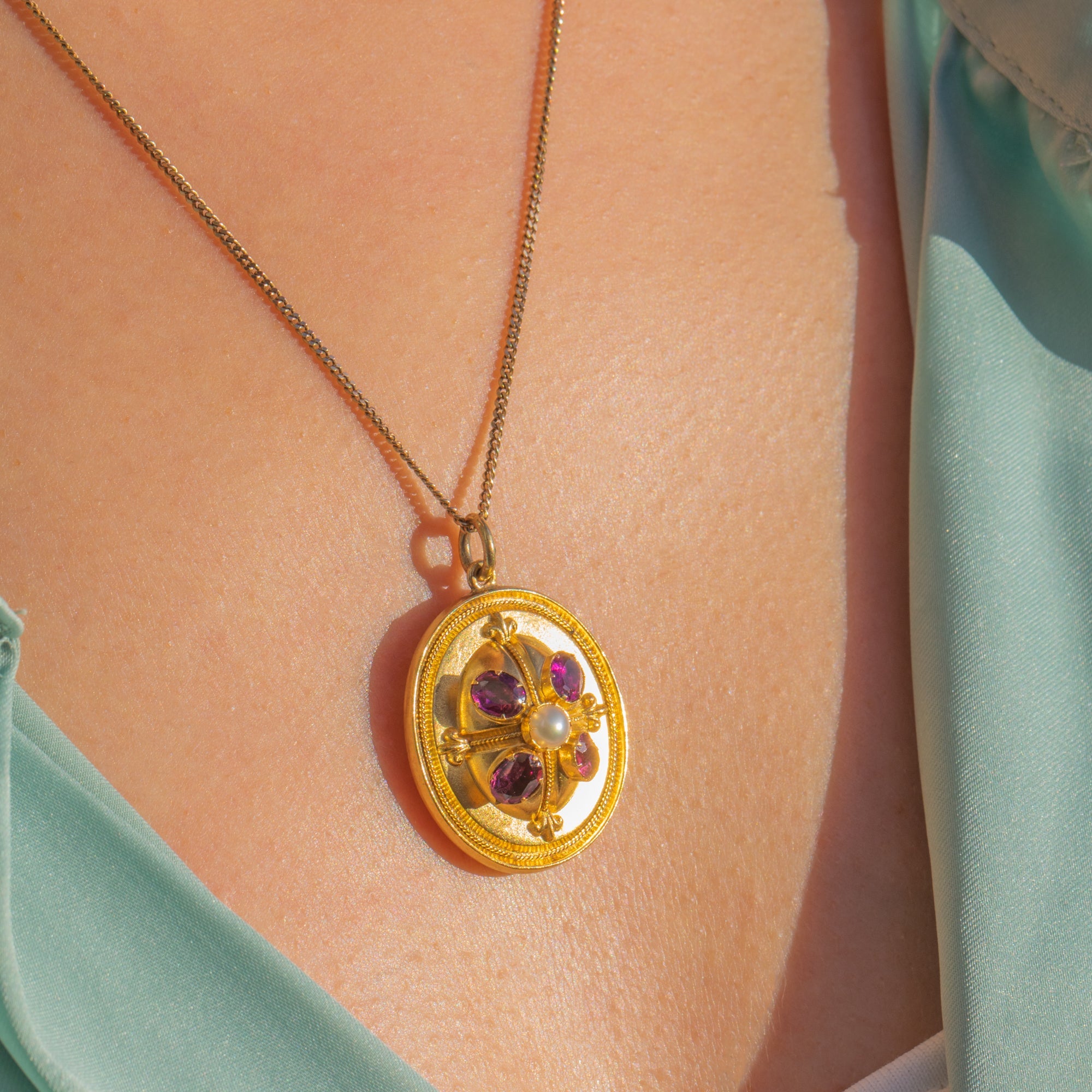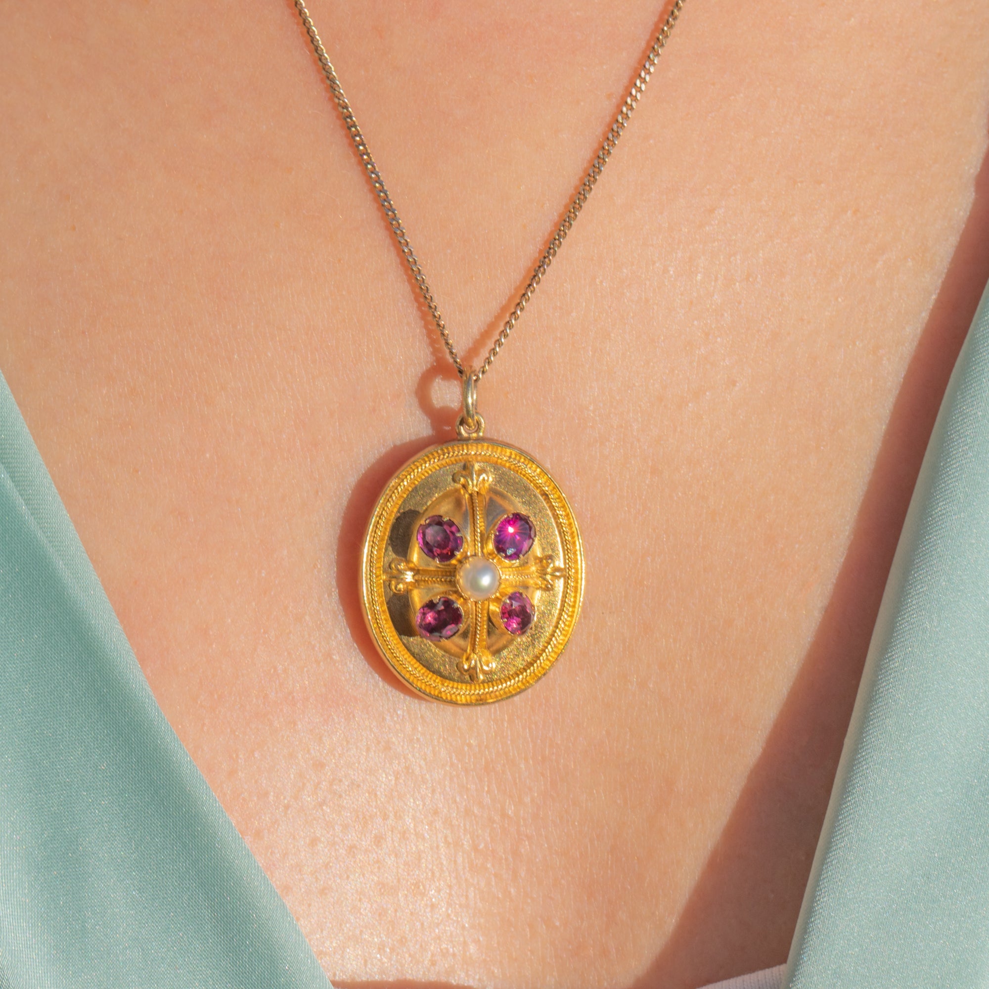 This glorious Victorian Garnet and Pearl pendant is a beautiful example of high Victorian design. Crafted in sumptuous 15ct Gold, the front is set with four vivid purple Garnets arranged in a cross motif around a single luminous Pearl, framed by fine textured Gold details.