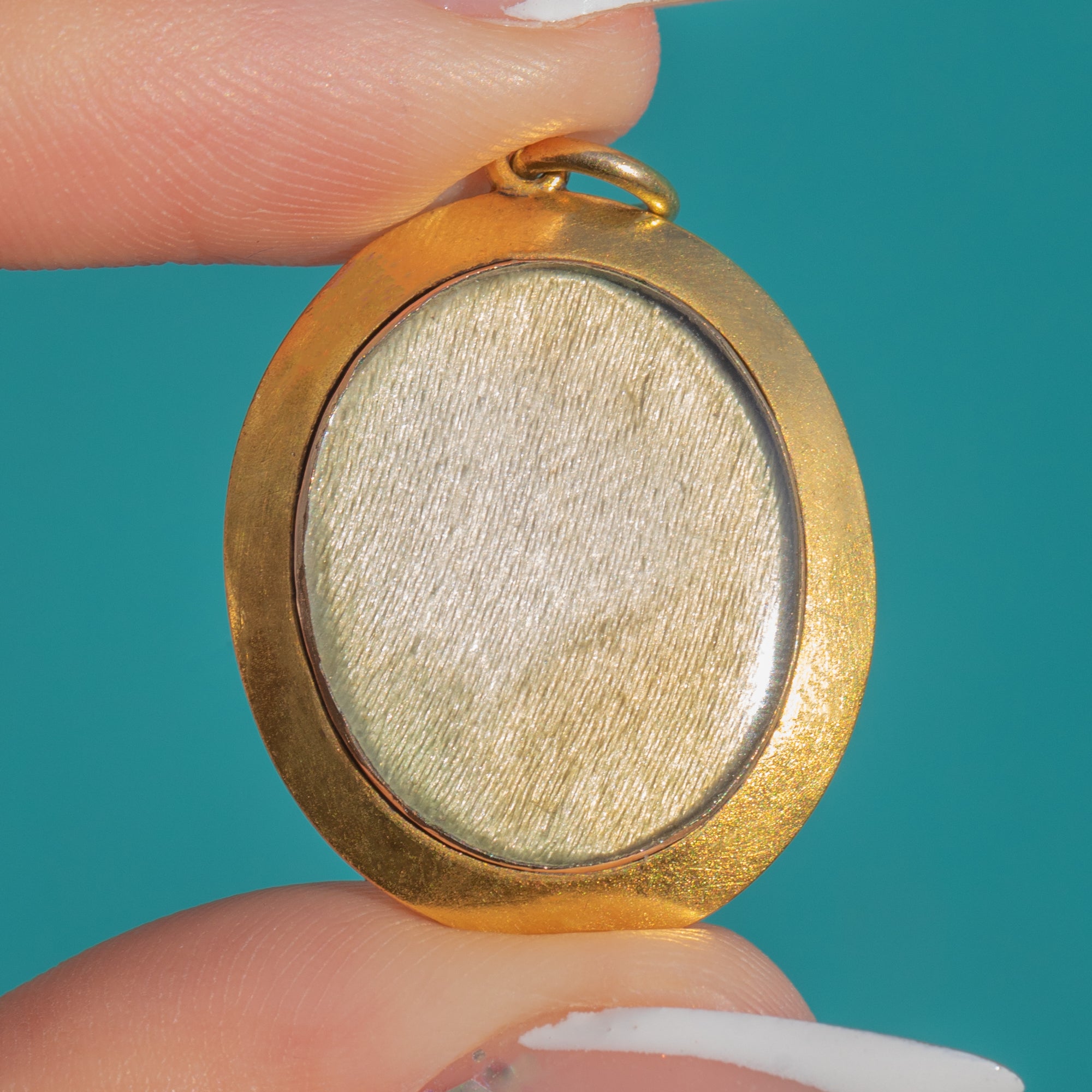 The oval pendant has a wonderfully rich, glowing colour and a softly domed profile that catches the light beautifully when worn. To the reverse is a locket back compartment, perfect for tucking away a tiny photograph or sentimental memento close to your heart.