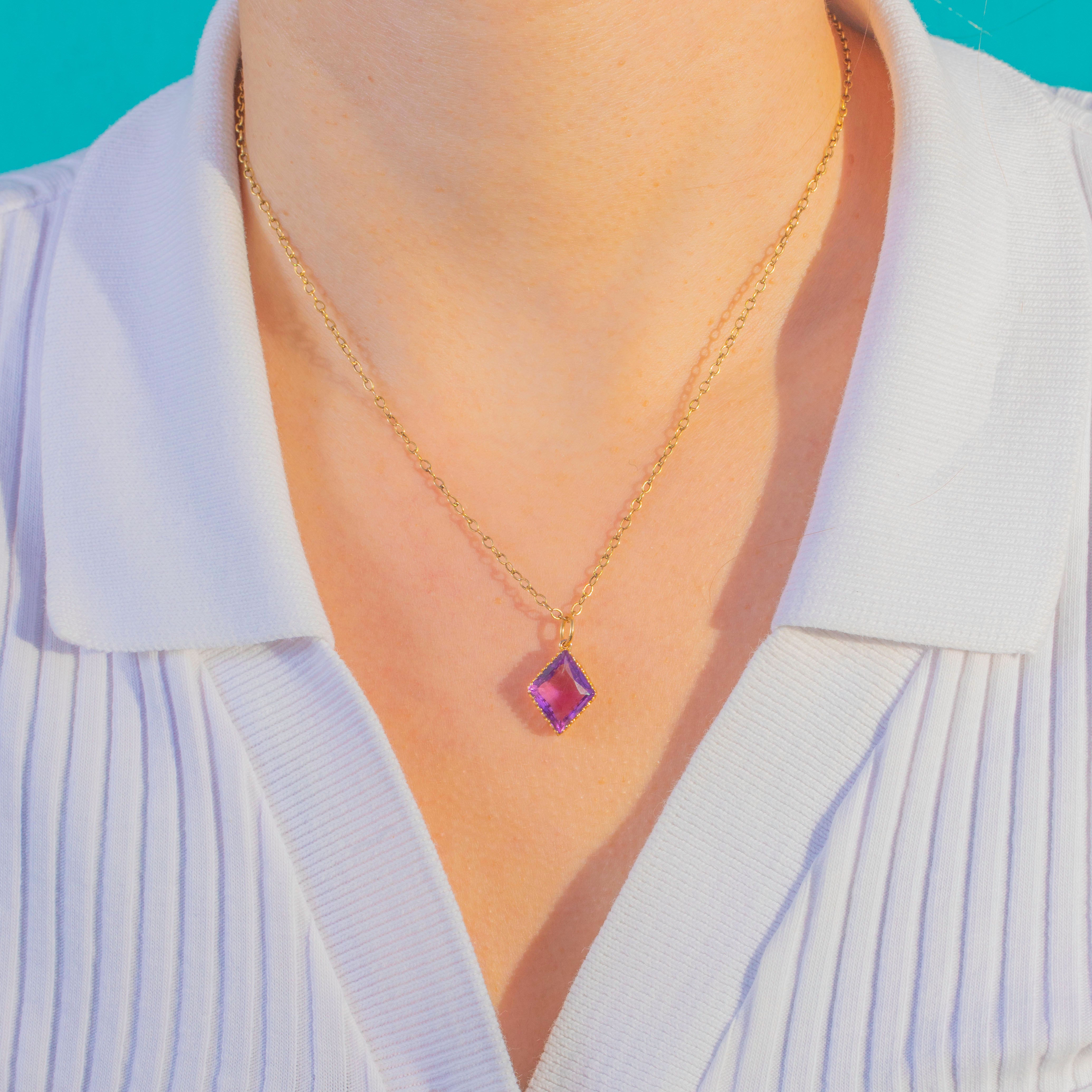 A luminous Victorian Amethyst pendant crafted in rich 15ct Gold. The marquise-cut Amethyst, oriented on the diagonal for a striking lozenge silhouette, is cradled in a striking coronet setting. Its medium–deep purple hue catches the light beautifully, offering flashes across the crisp table and facets.