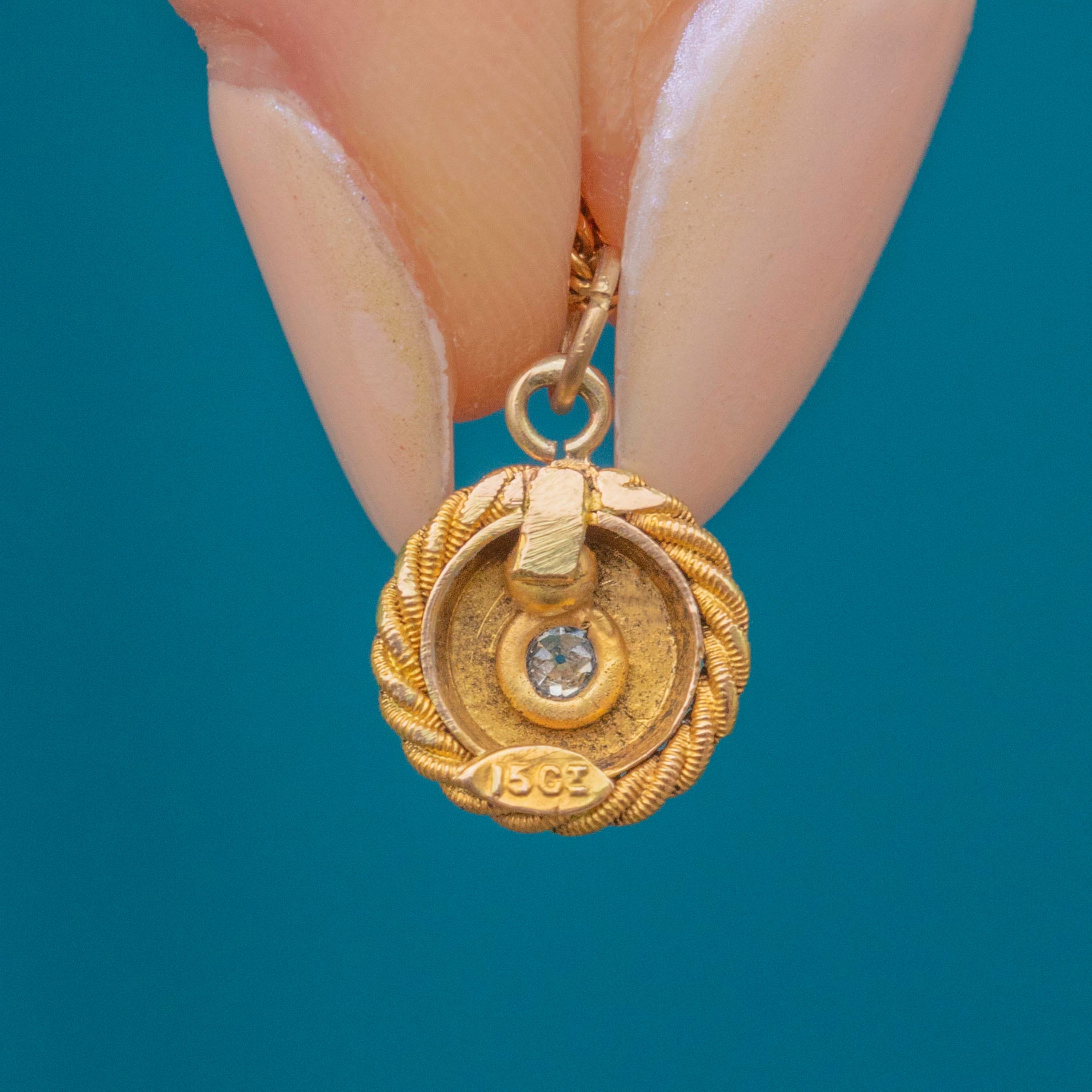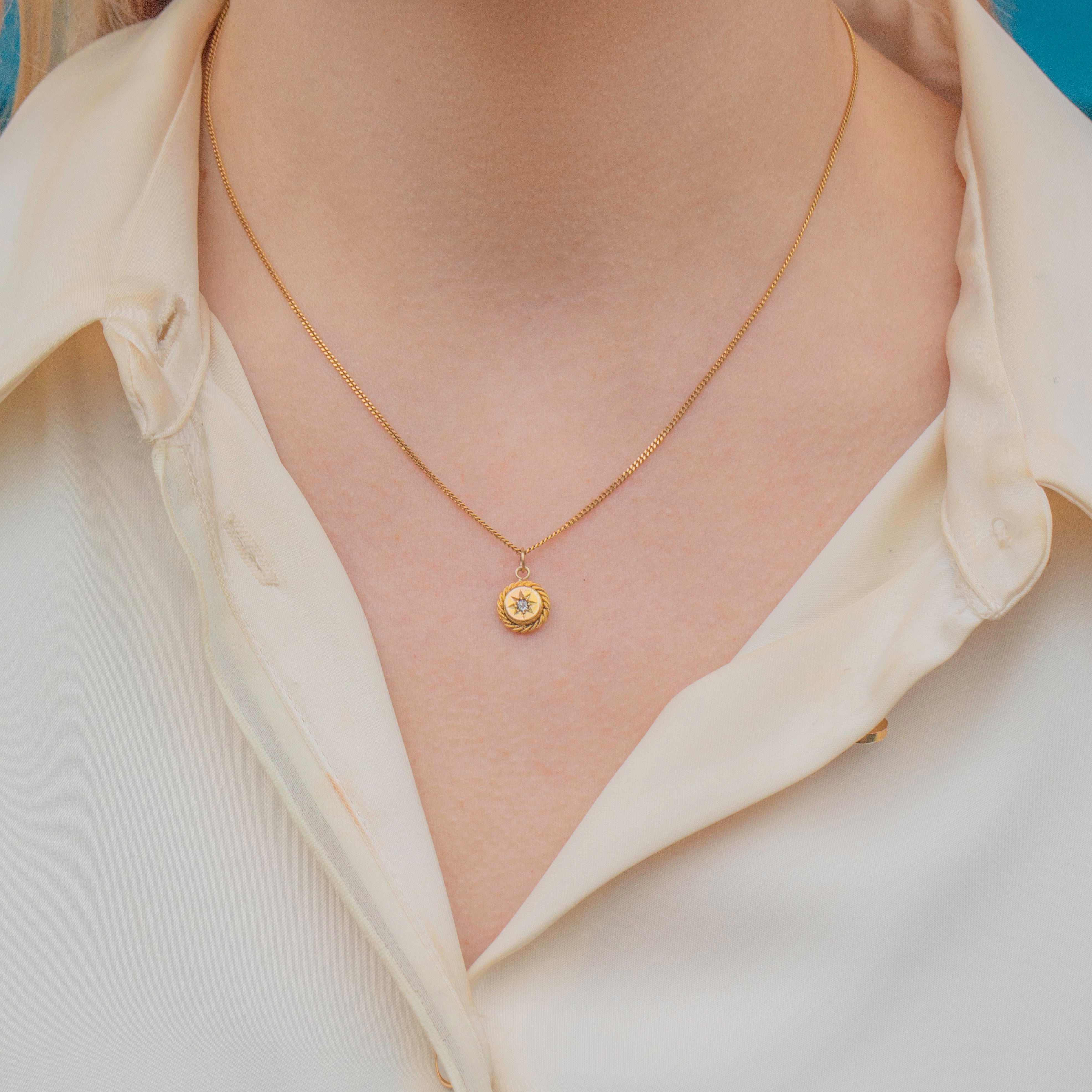 Crafted from buttery 15ct Gold, this Victorian charm showcases a star-set twinkling rose-cut Diamond at her centre, surrounded by an intricate rope border. This Etruscan beauty will look ethereal suspended from a dainty Gold chain adorning your décolletage!