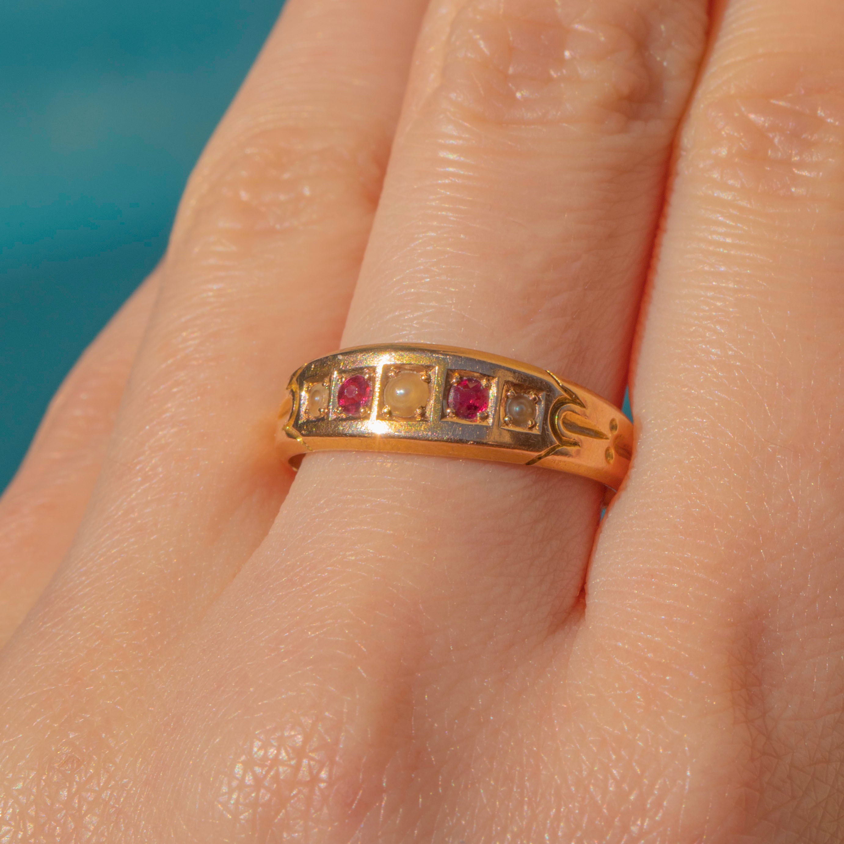 Crafted from saturated 15ct Gold, this five stone gypsy ring features a mix of iridescent Pearls and saturated fuchsia Rubies. Her gemmy ring face is flanked by engraved shoulders, giving this Victorian ring a lovely decorative finish.
