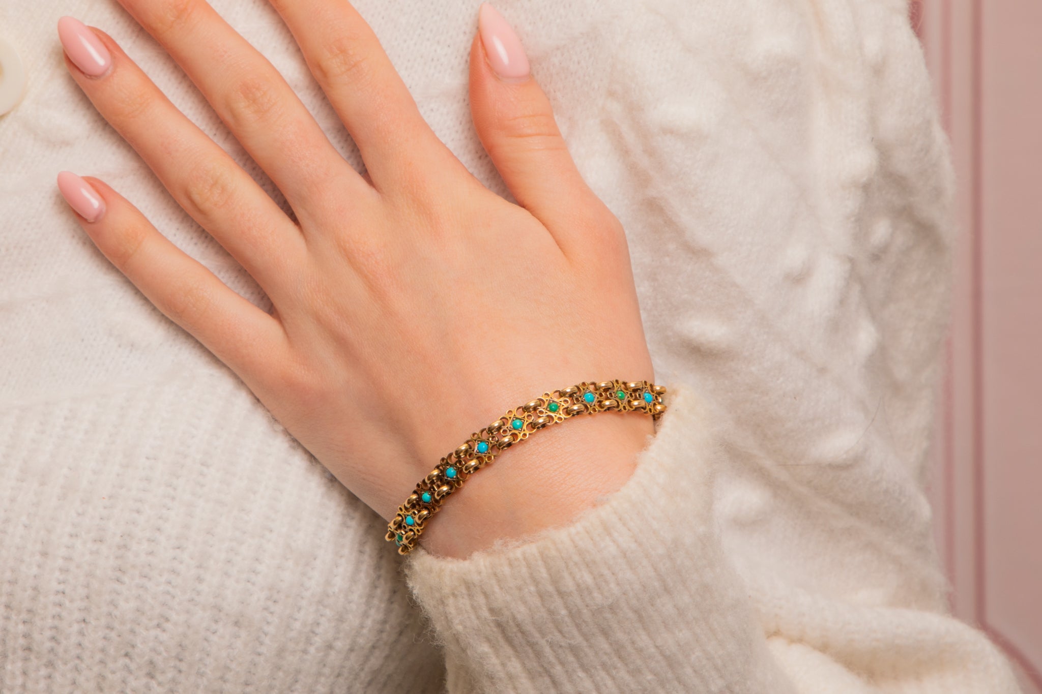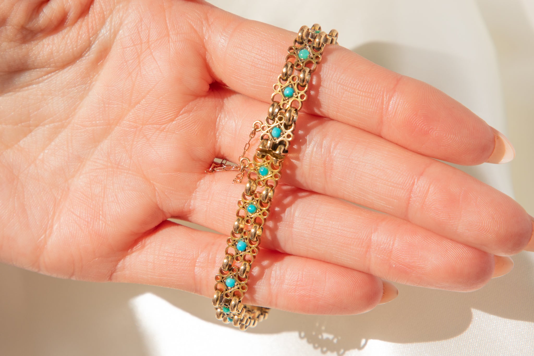 How delightful is this Victorian 15ct Gold Turquoise bracelet! Each geometric link is formed of filigree-inspired wirework crafted from honey-hued 18ct Gold. At the centre of each link sits a Turquoise cabochon flaunting a spectrum of blues between them, they stand out from afar contrasting against the glossy Gold.
