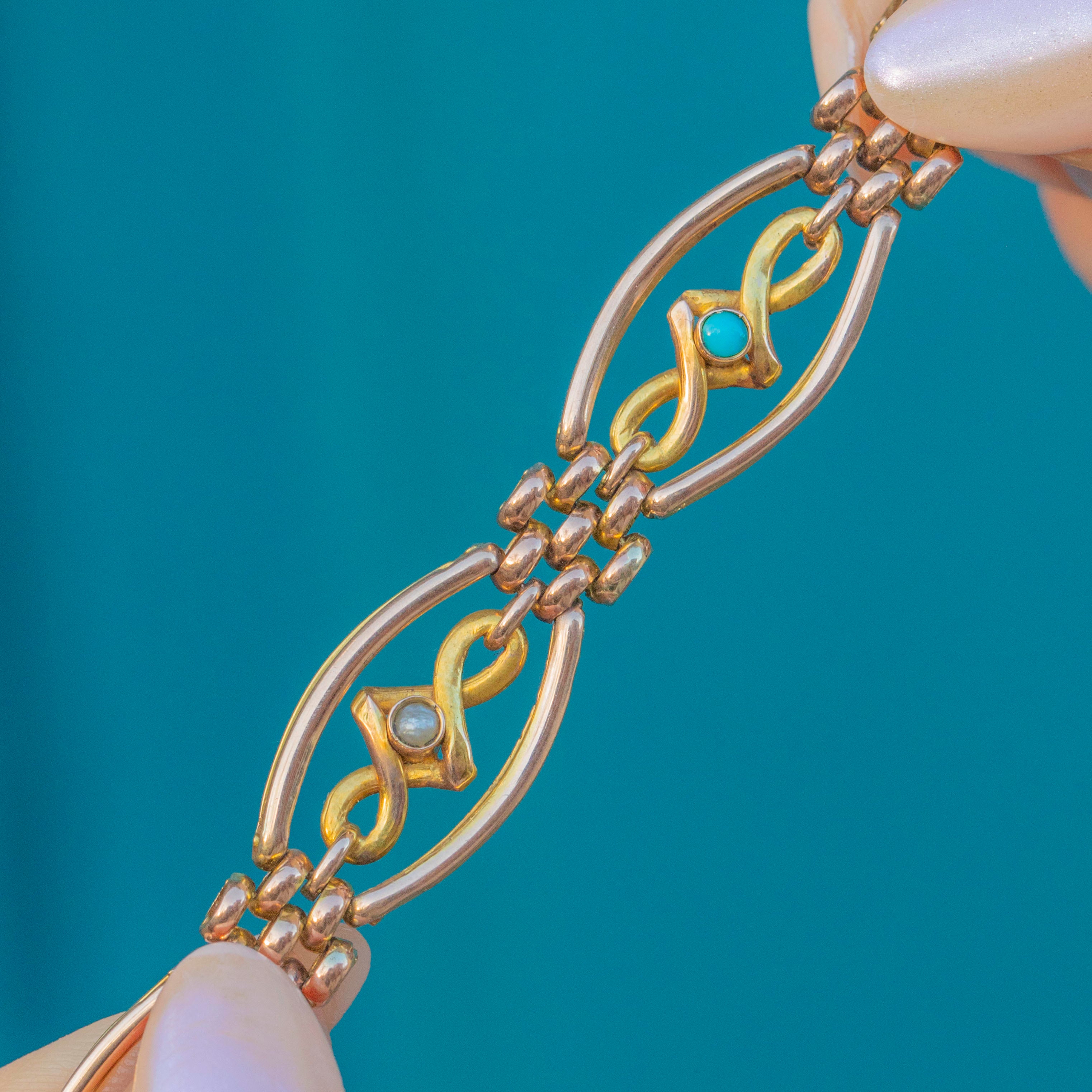 EXCELLENT. This Victorian 9ct Gold Turquoise Pearl gate bracelet is in excellent condition throughout. Each gemstone is securely set and retains a brilliance of hue, whilst the links are all securely connected and are free from any damage to note. Her clasp fastens securely shut and she is complete with a safety chain. Accruing a gorgeous saturation over its lifetime, her 9ct Gold remains as bright as ever! Allow her to lovingly wrap herself around your wrist for years to come.