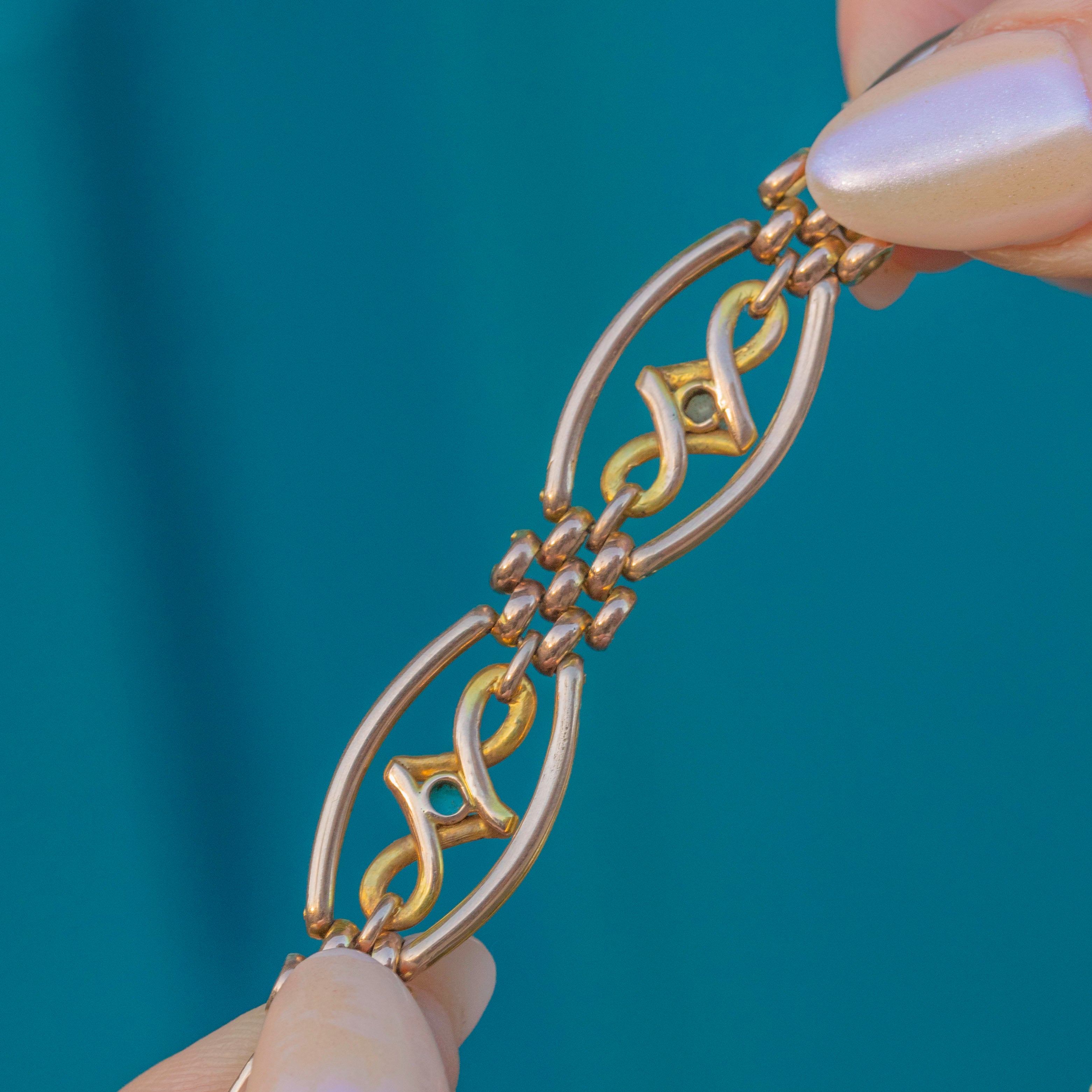 What a sumptuous Victorian 9ct Gold Turquoise Pearl gate bracelet! Crafted from the bright, buttery antique 9ct Gold, she features interlocking gate links and is embellished with gemstones throughout.