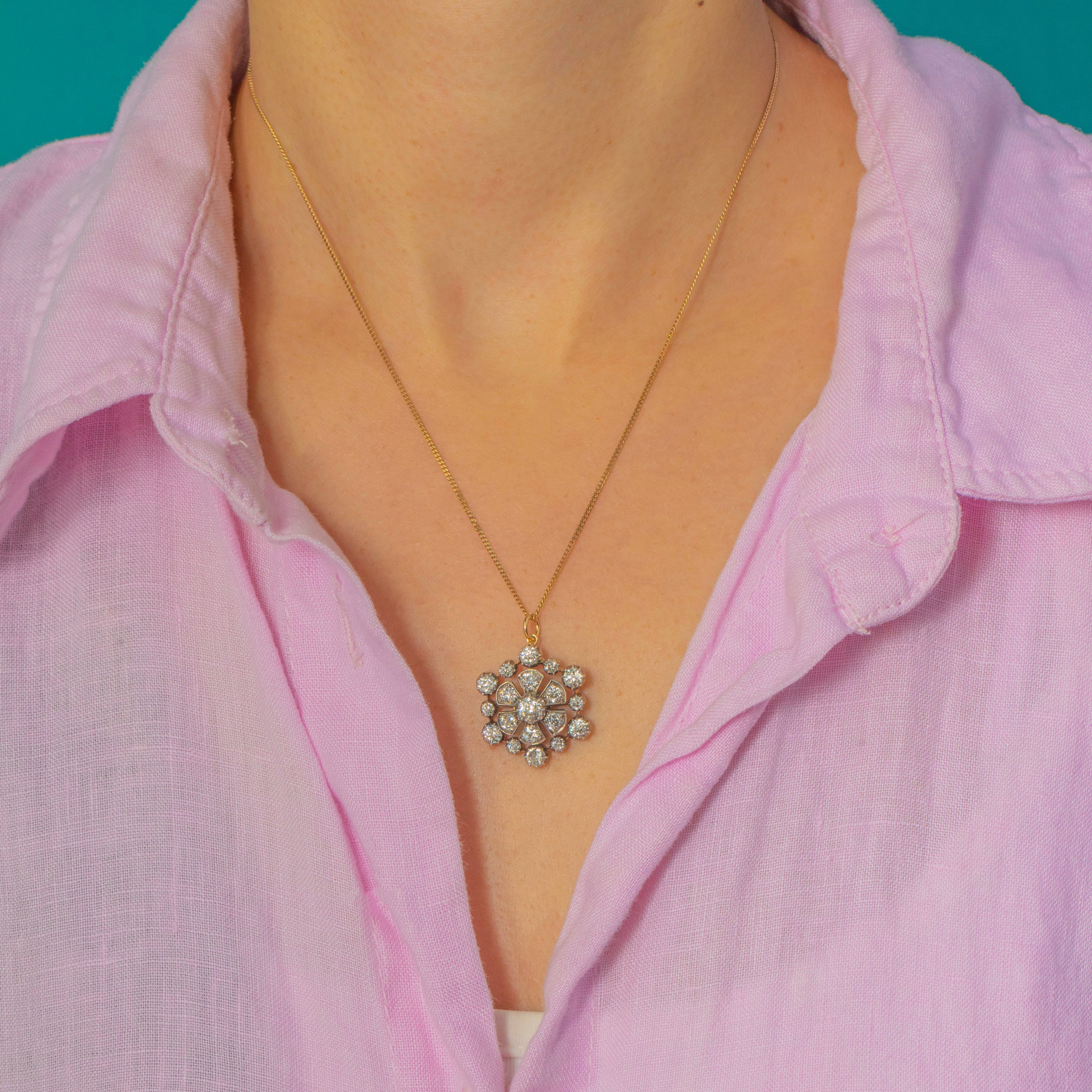 A breathtaking Victorian Diamond pendant with brooch fittings, crafted circa 1890 in rich 18ct Gold with traditional Silver settings. This elegant cluster features approximately 2.50cts of bright and lively Old Mine Cut Diamonds arranged in a classic rosette form, sparkling beautifully with every movement.