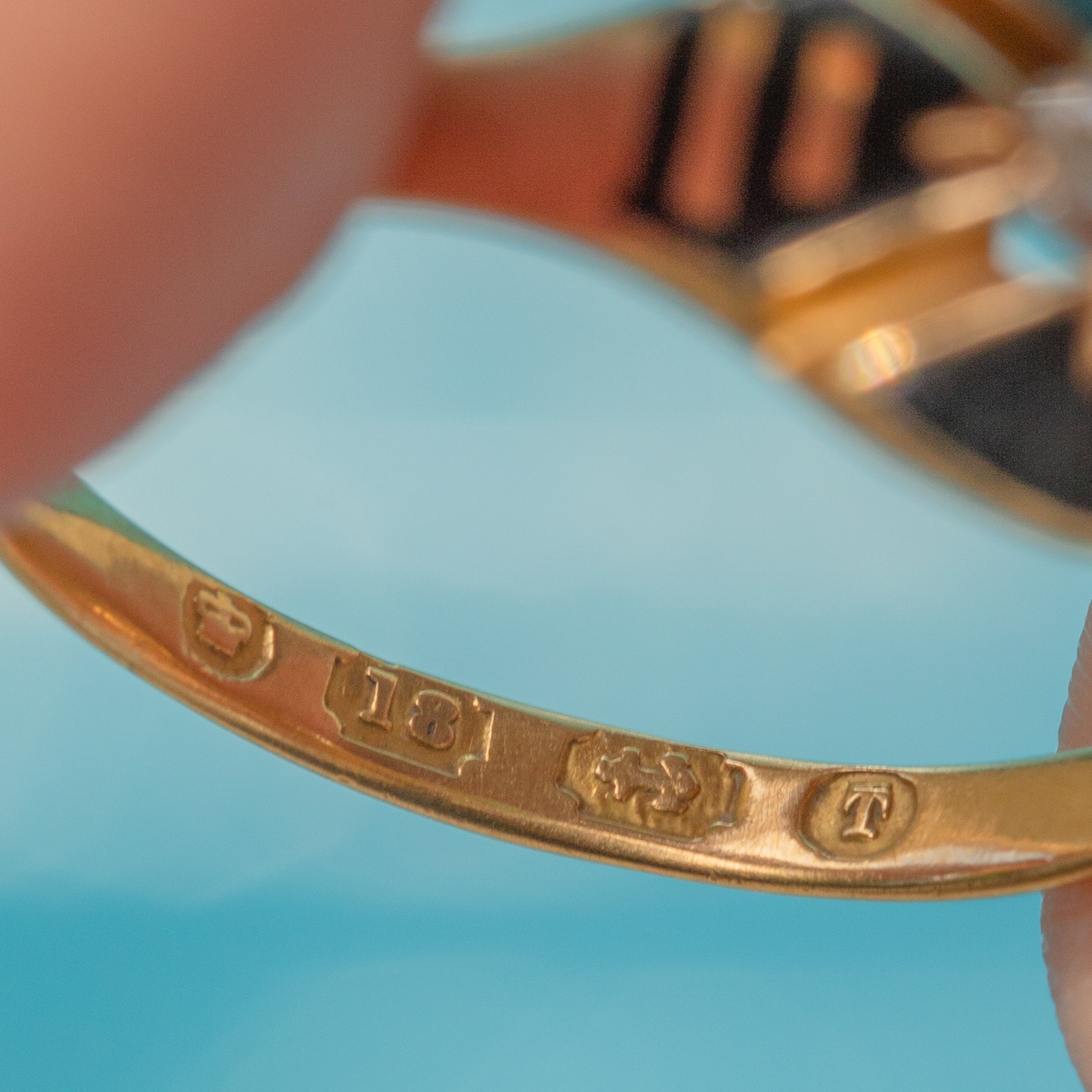 In her centre sits a dazzling old-mine-cut Diamond, faceted wonderfully with a gorgeous twinkle as she catches the light. She is flanked by an inky black Enamel detailing creating an eye-catching contrast against the saturated 18ct Gold.