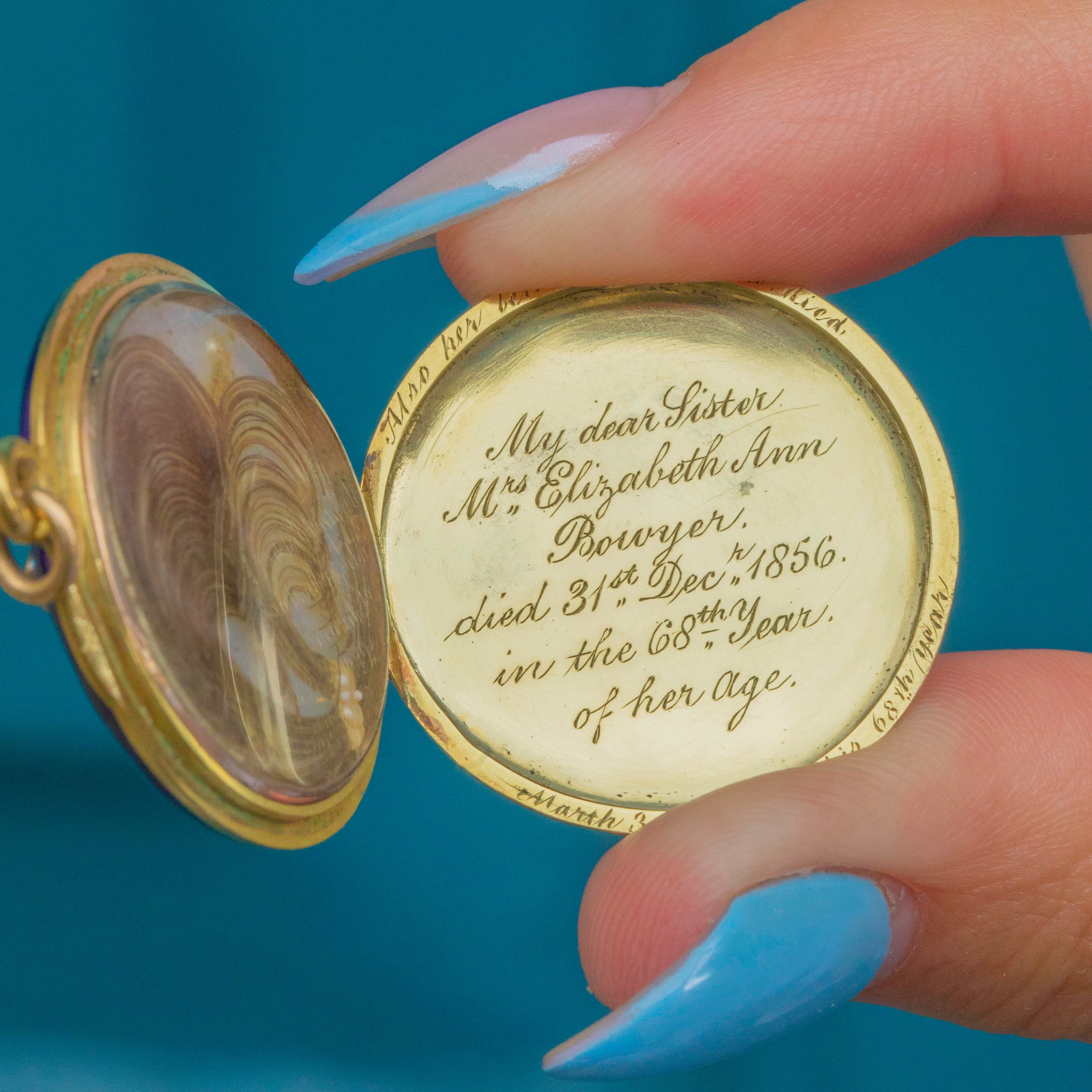 EXCELLENT: This antique Victorian 9ct Gold mourning hair locket is in exquisite condition for its long life. The Enamel has kept in pristine condition with no dinks or dents to note. Her Pearls are all present and secure and have a delightful lustre with minimal wear. Equally her wonderful engravings are immaculate and the lock of her well in place. Presented in her original box, she will be worn and adored for generations to come.