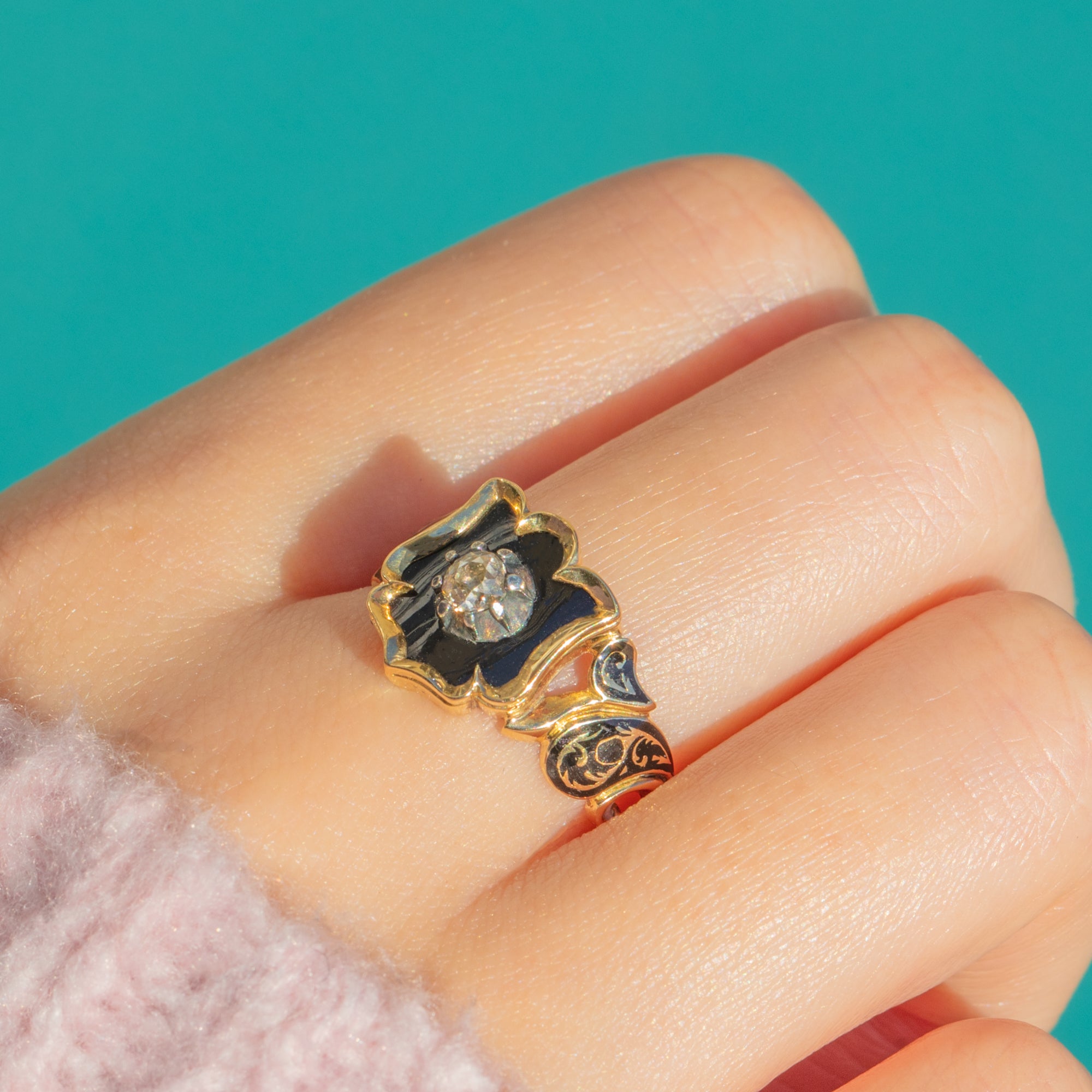 A beautifully preserved Victorian mourning ring in rich 18ct Gold, c.1850. The scalloped cartouche head gleams with glossy black Enamel, centred by a Silver collet holding a bright Diamond for striking contrast. Foliate and scrollwork shoulder panels, including a tiny heart detail, lead to a bold black enamel legend reading “IN MEMORY OF”.