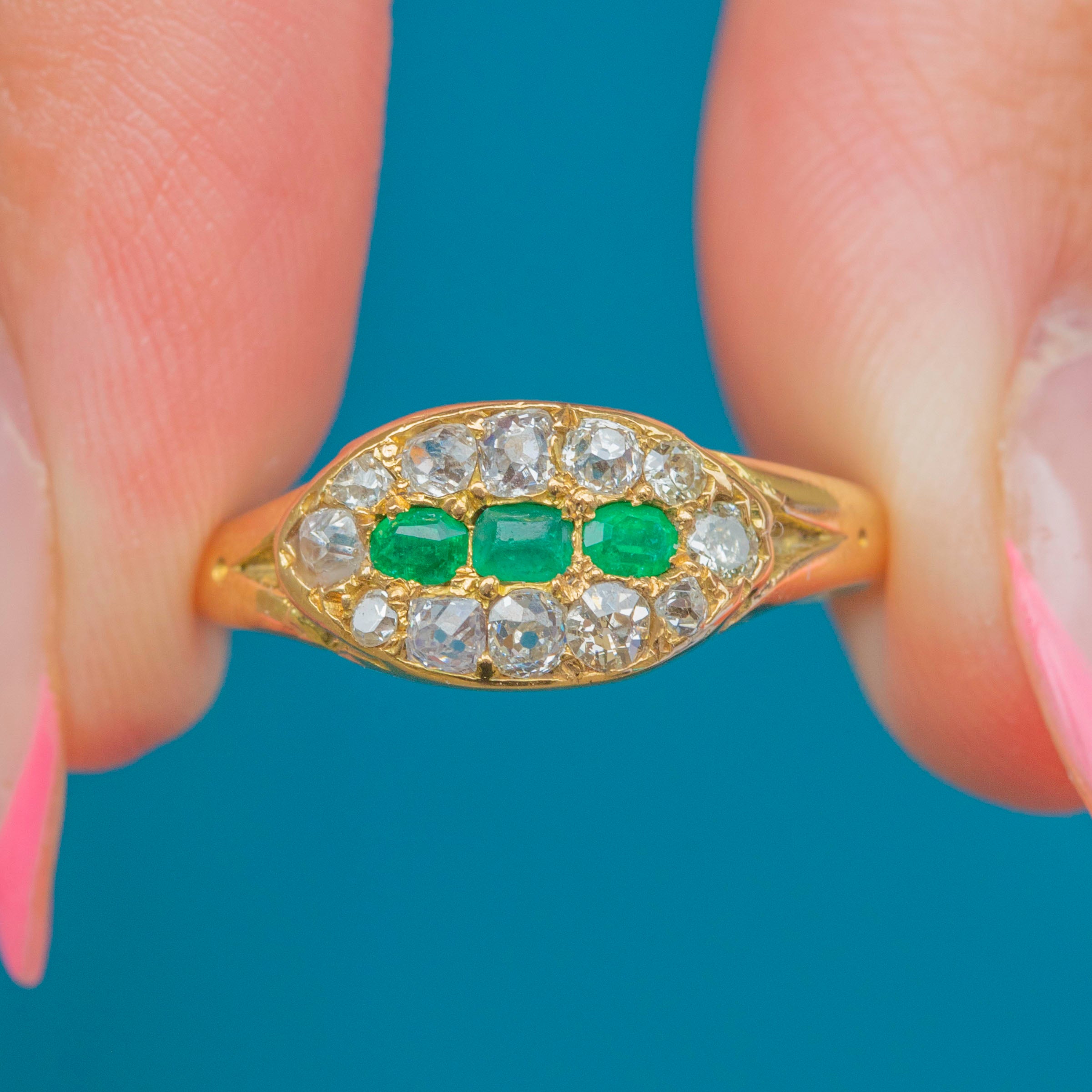 EXCELLENT: We are pleased to present this Victorian 18ct Gold Emerald Diamond east to west cluster ring in excellent condition. The gemstones are radiant and set securely within their buttery settings. There are some mild dings inside the band, though this cannot be seen when the ring is worn. The band is robust and feels comfortable to wear, promising many more years of enjoyment!