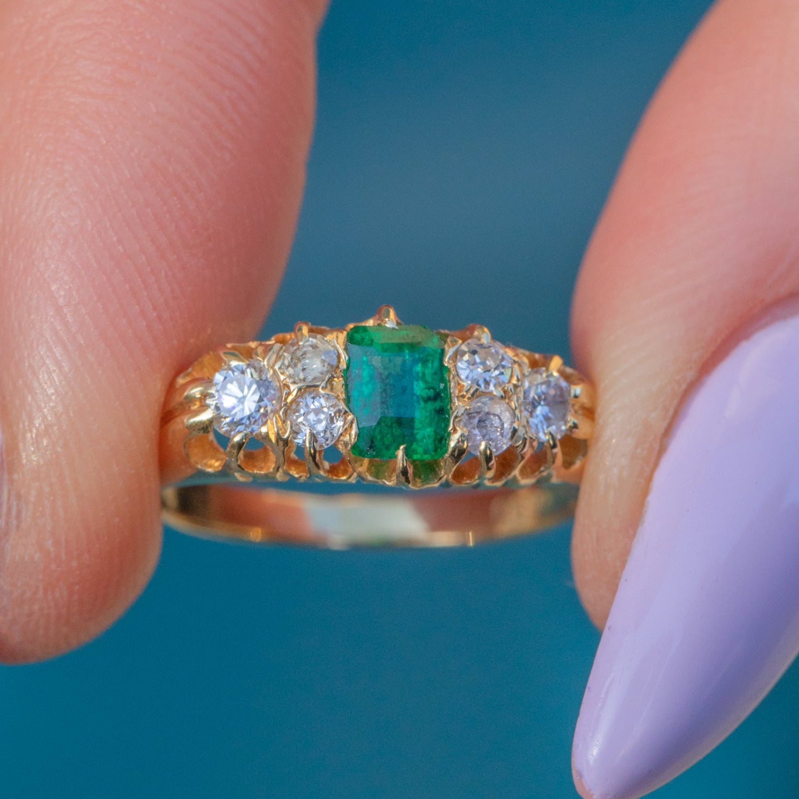 Comprised of seven gorgeous gemstones, this antique 18ct Gold ring boasts a vivid green Emerald in her centre adorned by six twinkling Diamonds, each scintillating brightly.
