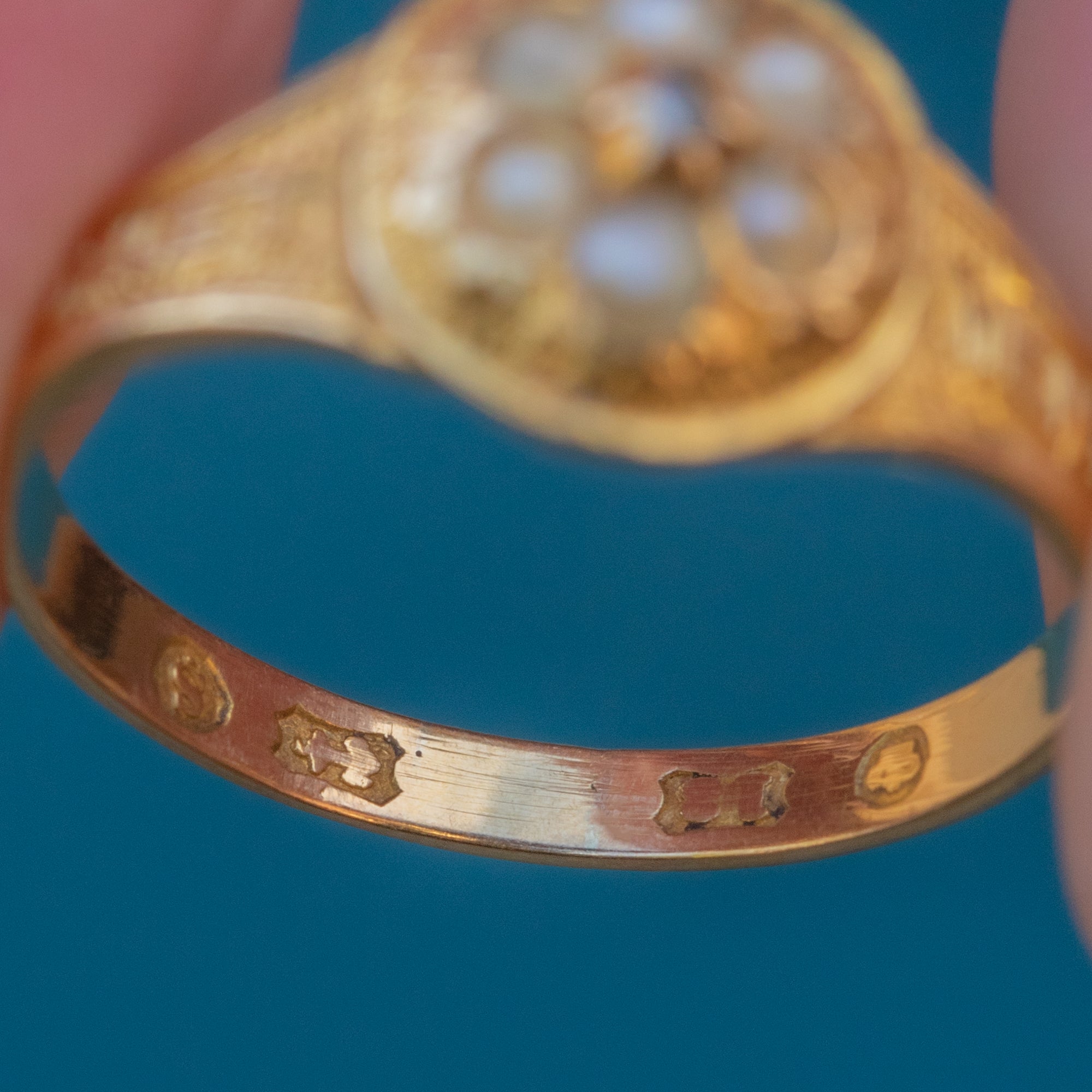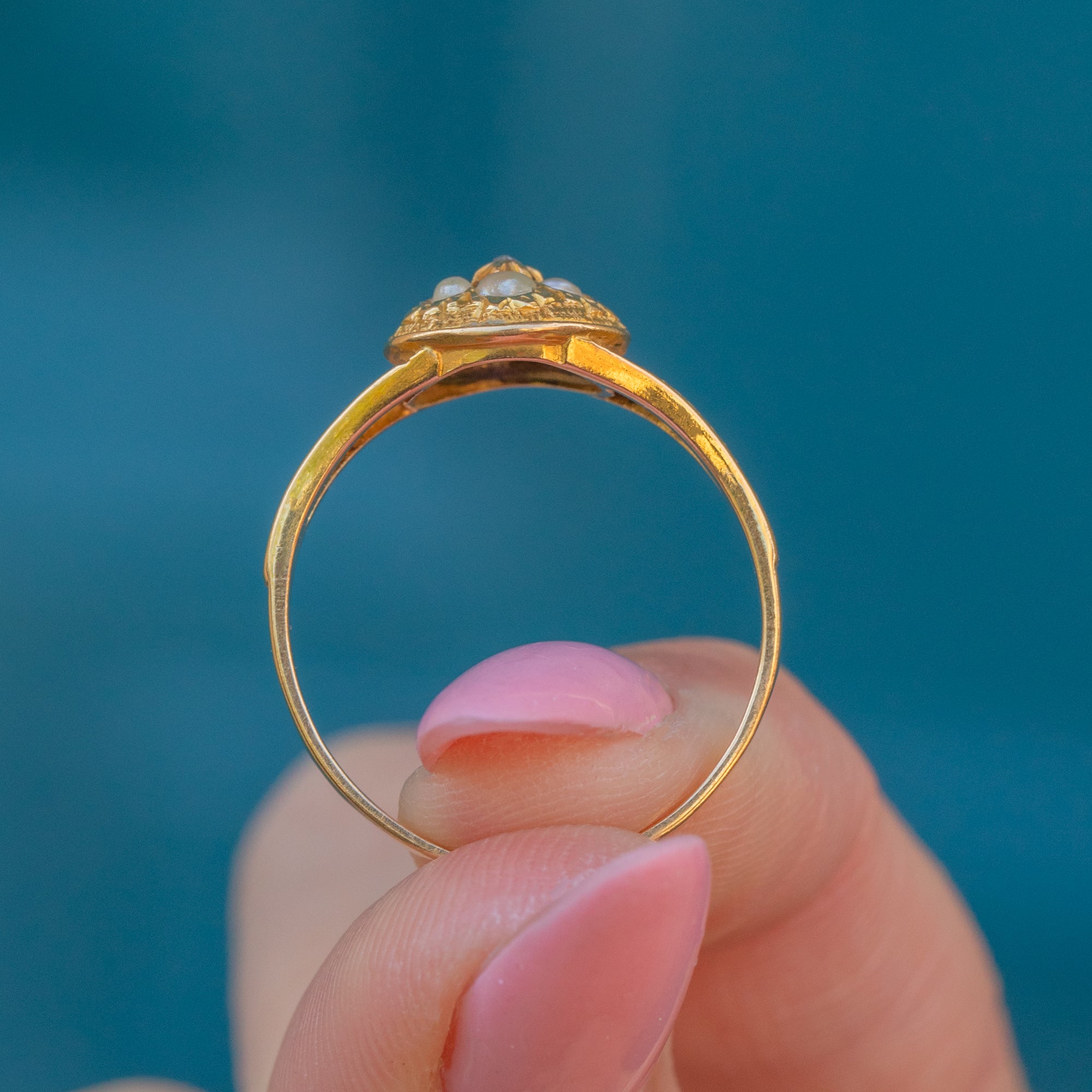 Victorian 18ct Gold Engraved Forget-Me-Not Pearl Diamond Ring, c.1867