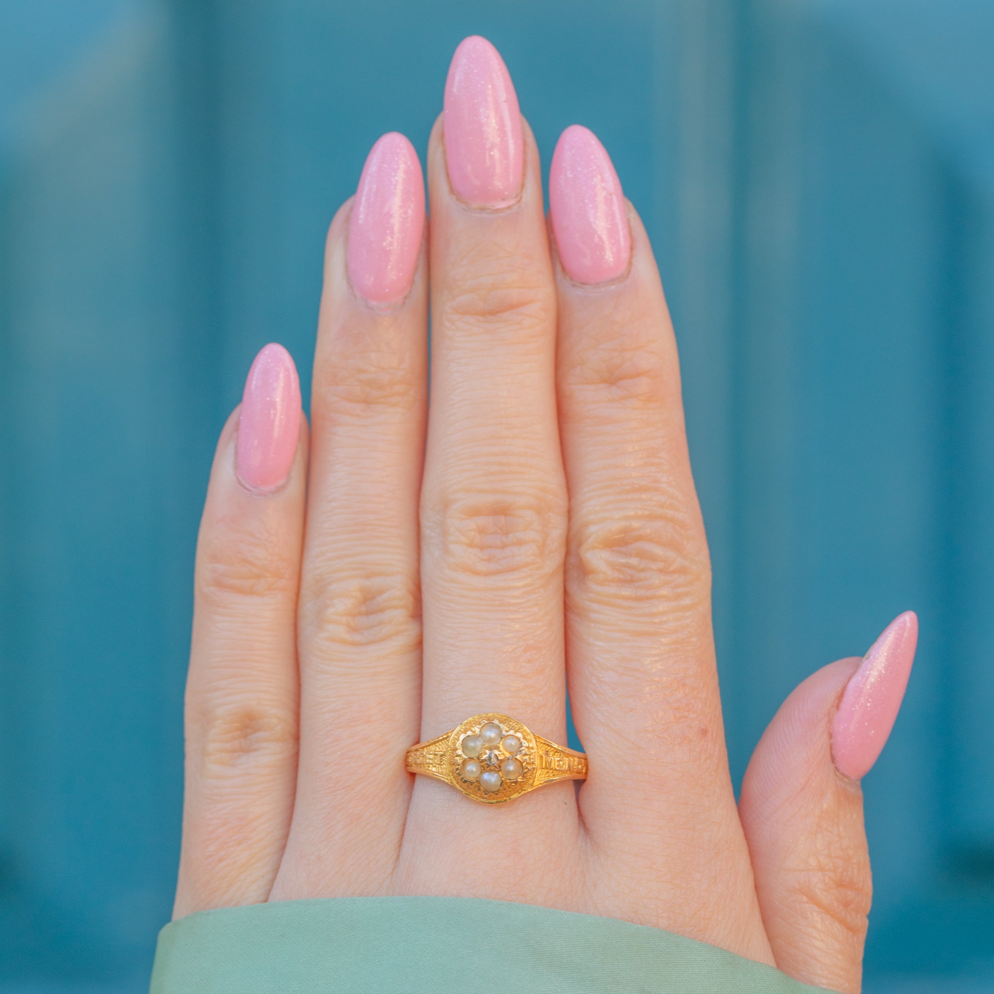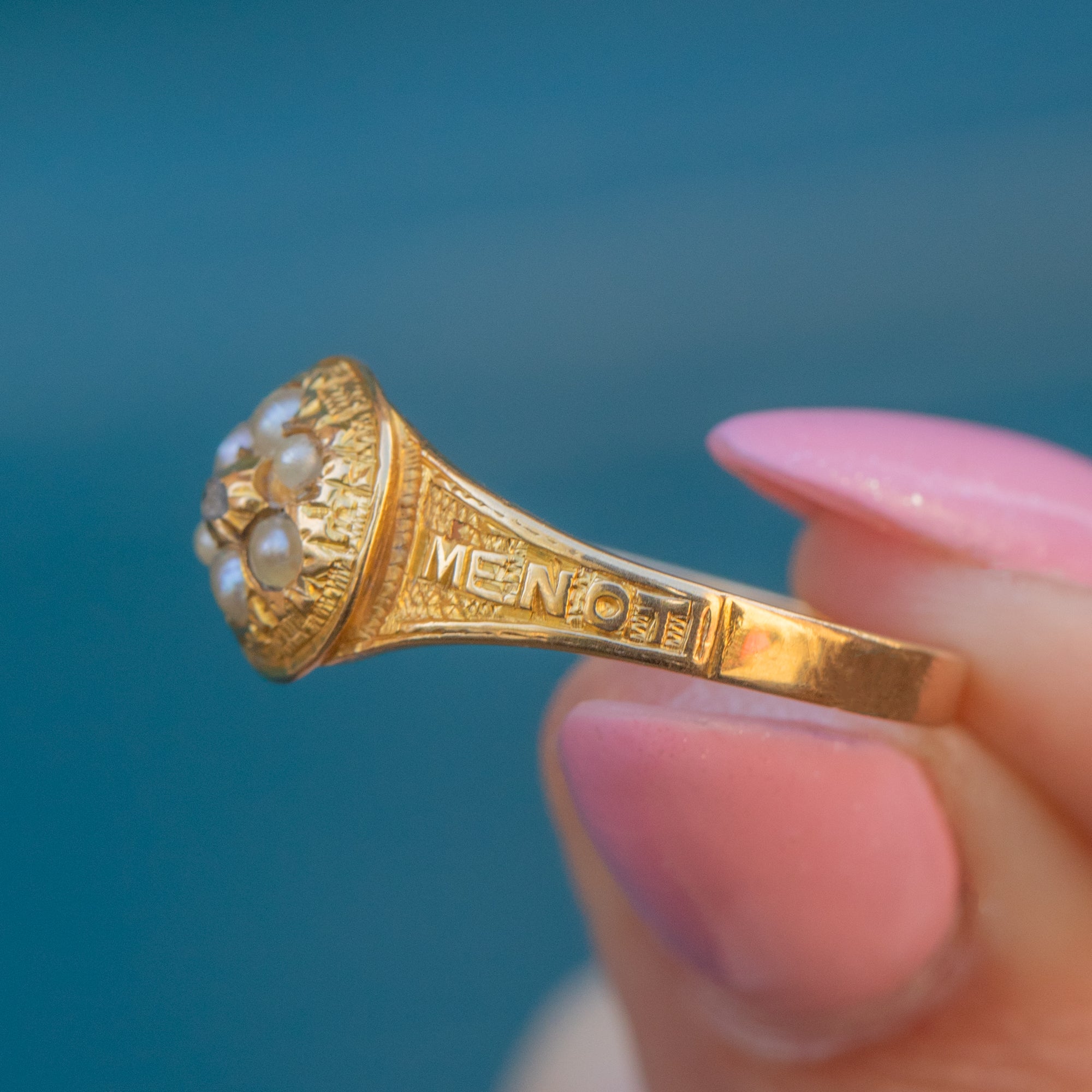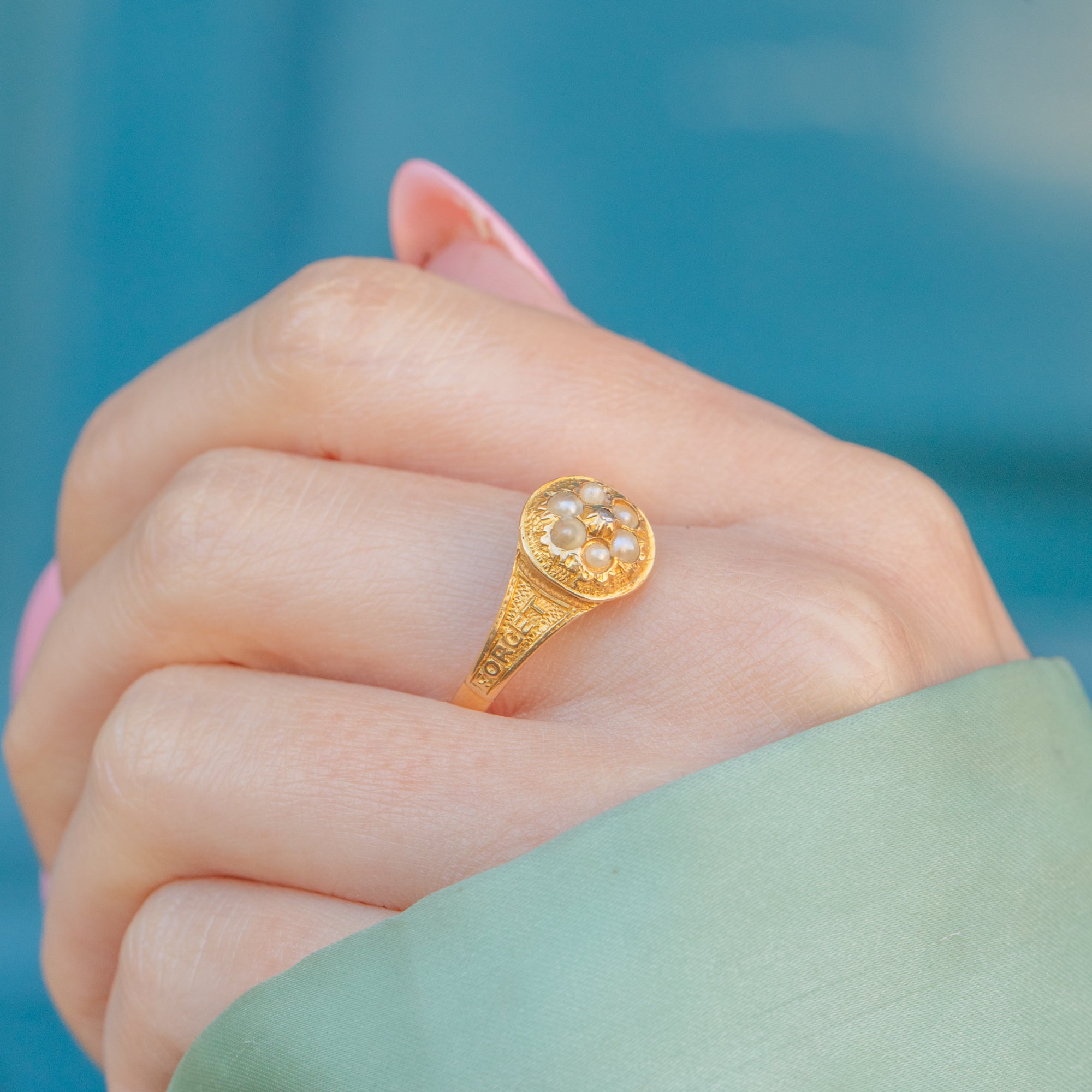 In her centre sits a dainty flower cluster, formed of six lustrous Pearls surrounding a central scintillating Diamond. The ring face is flanked by inscribed shoulders reading 'FORGET ME NOT', a unique feature adding allure and Victorian charm to this antique ring.