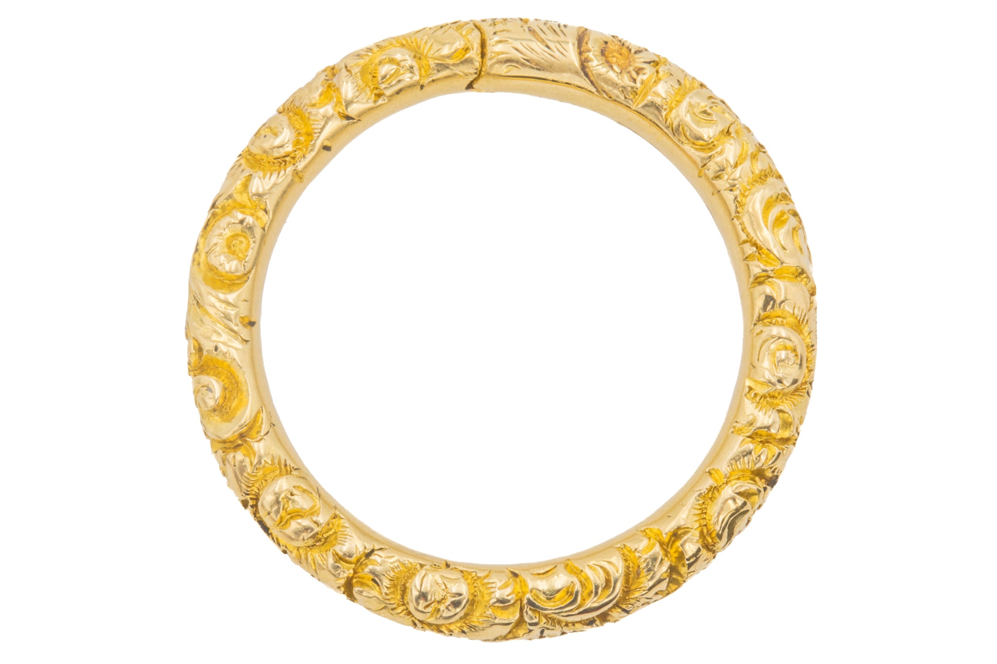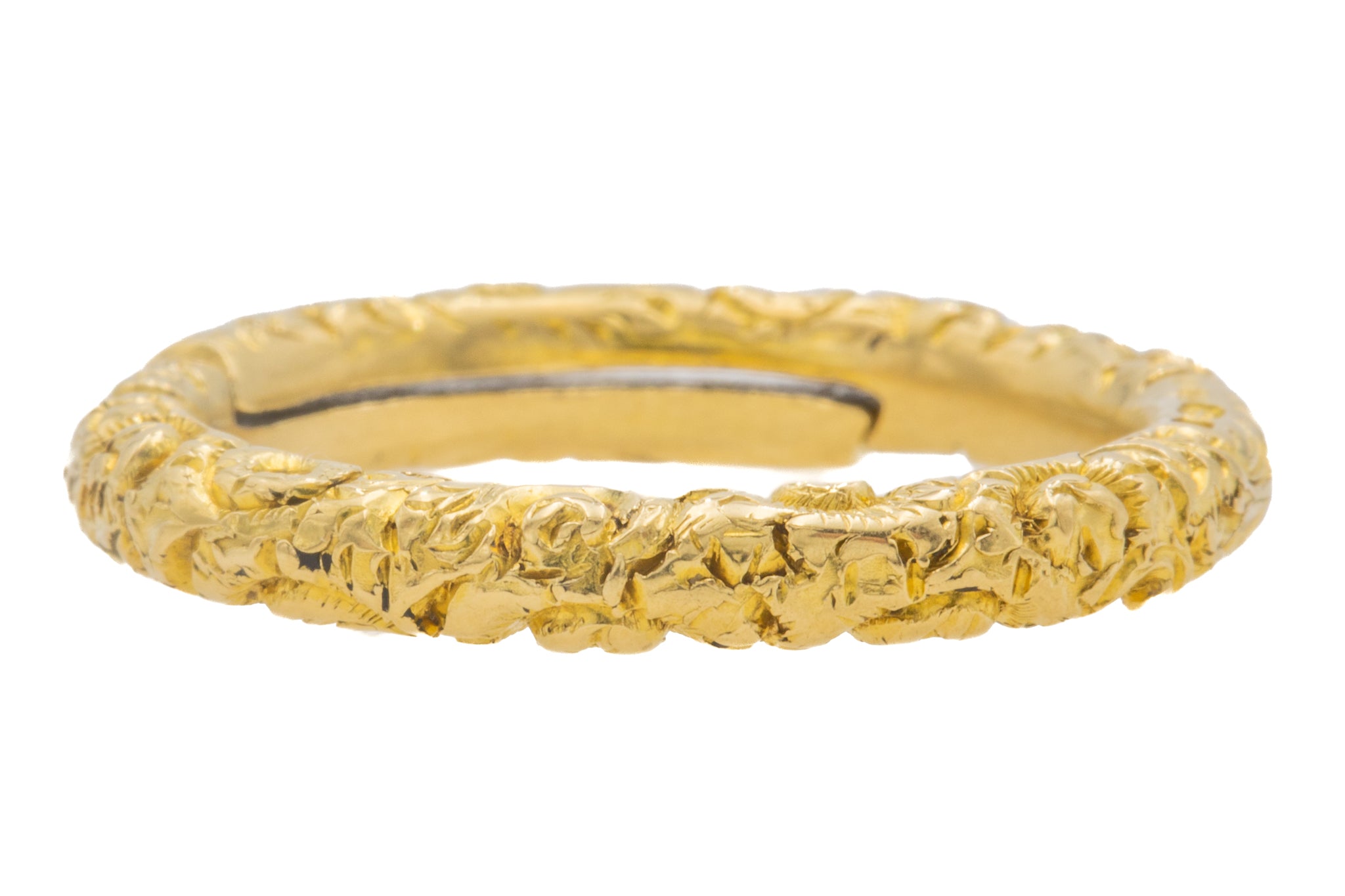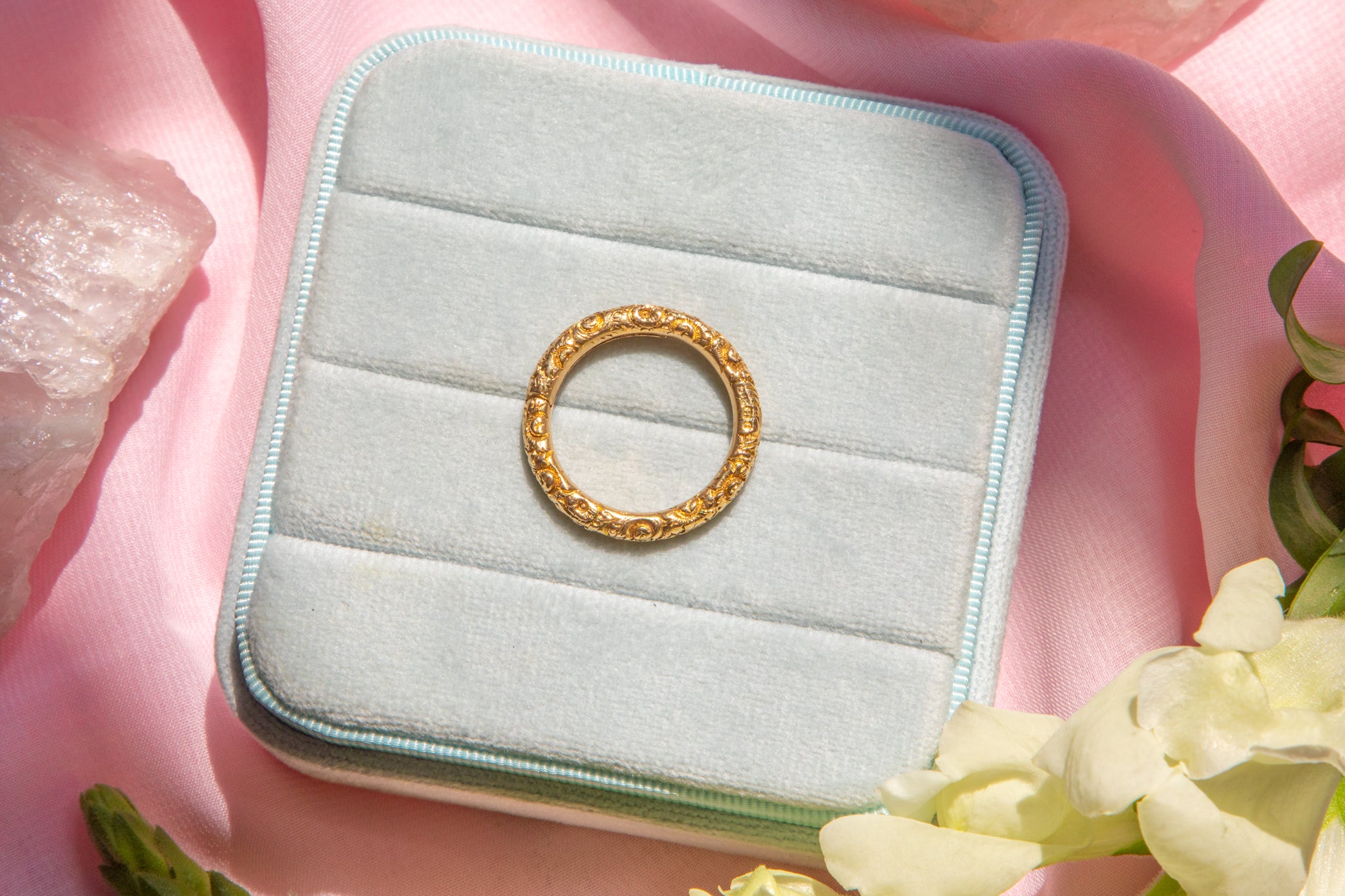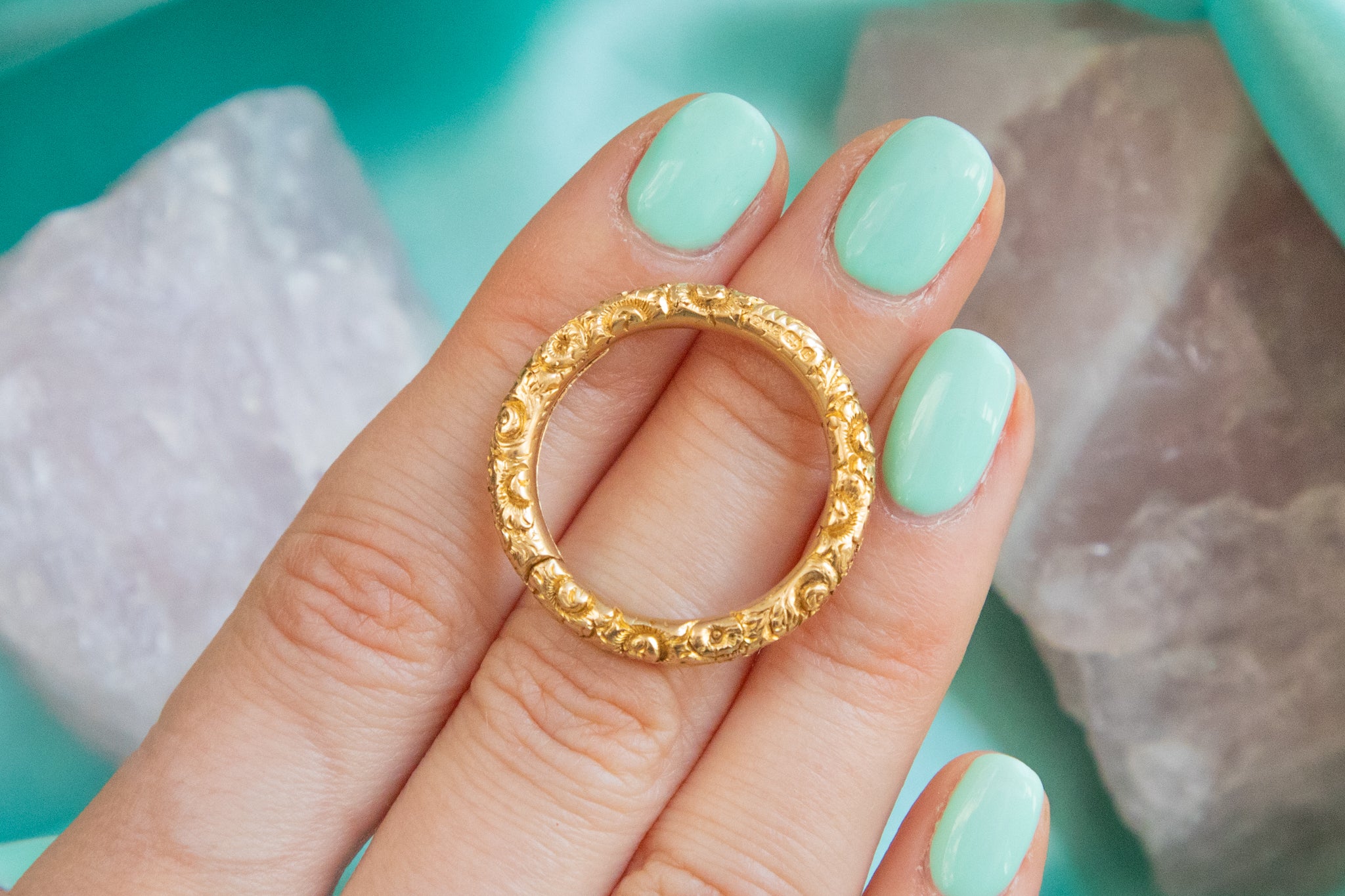 This incredible Victorian 18ct Gold engraved split-ring, weighing an impressive 10.3 grams, possesses a saturated sunshine hue and boasts gorgeous deeply grooved engravings and a wonderful texture throughout.