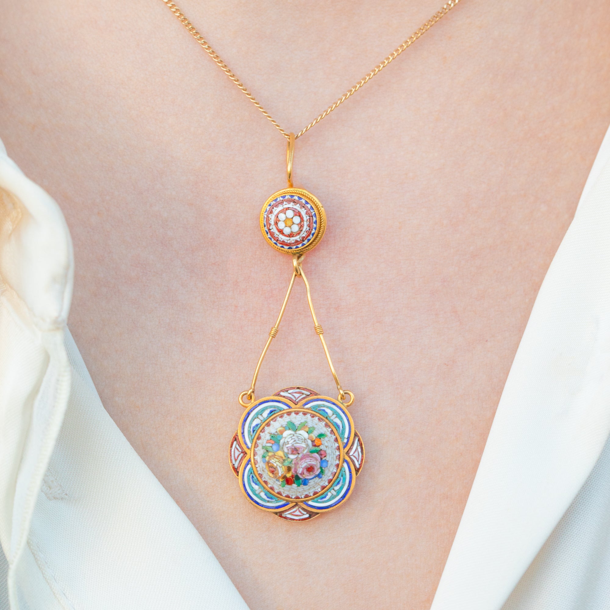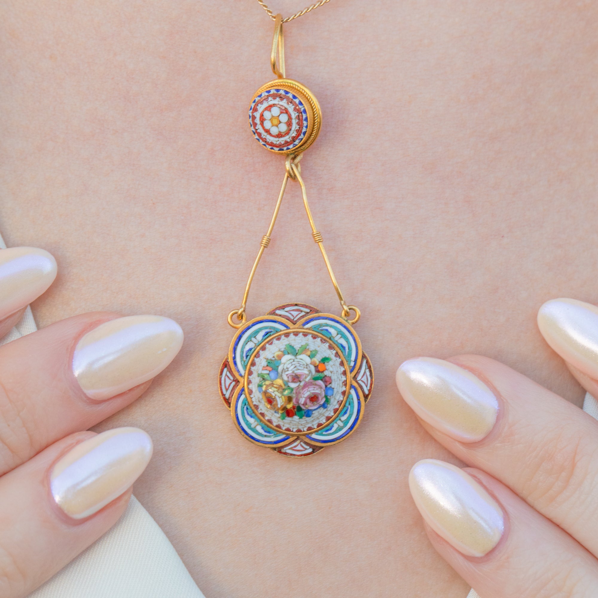 An impeccable Victorian 18ct Gold floral micro-mosaic drop pendant! This beautifully handcrafted, likely Italian, micro-mosaic pendant has been made from 18ct Gold and tiny pieces of tesserae to create a show-stopping floral design.