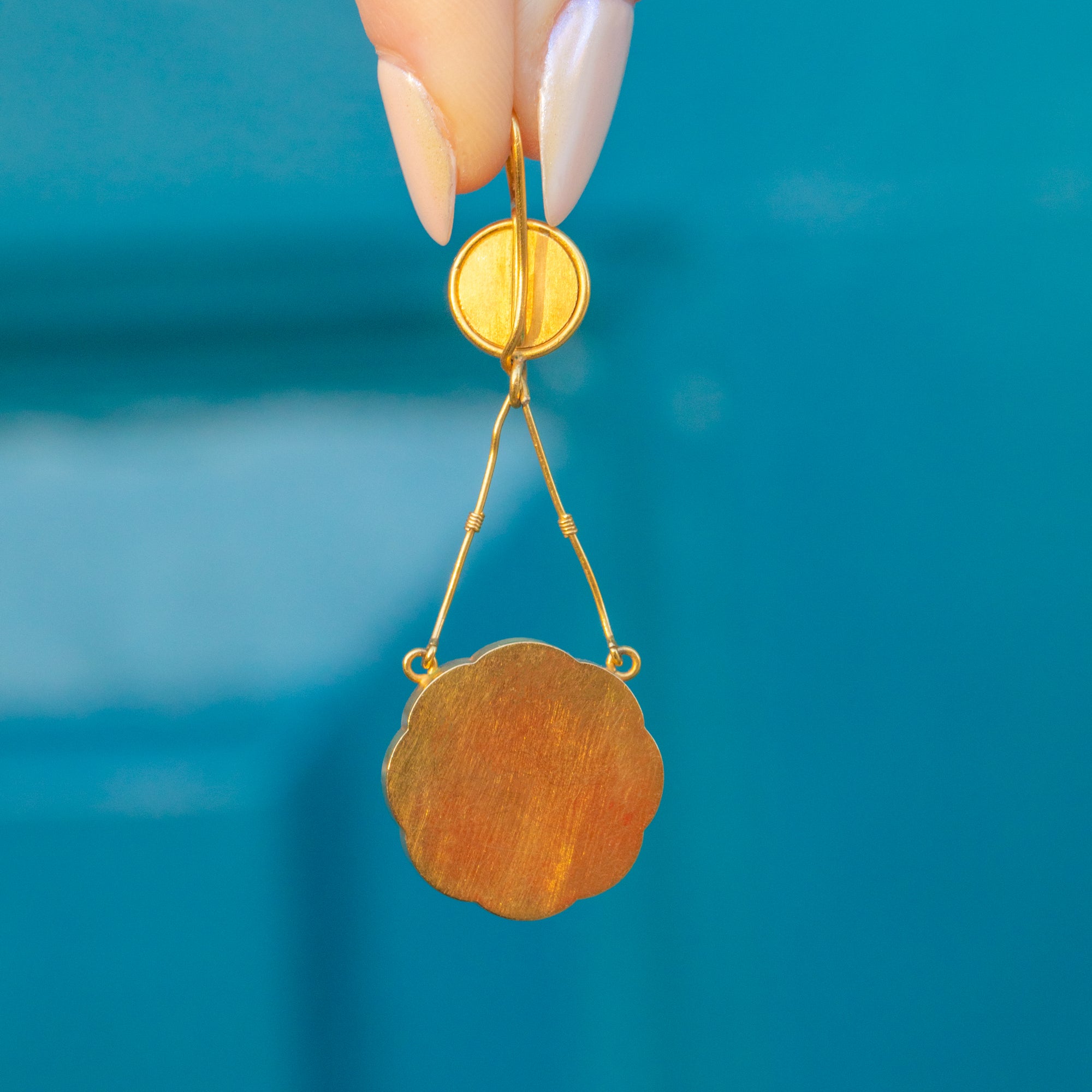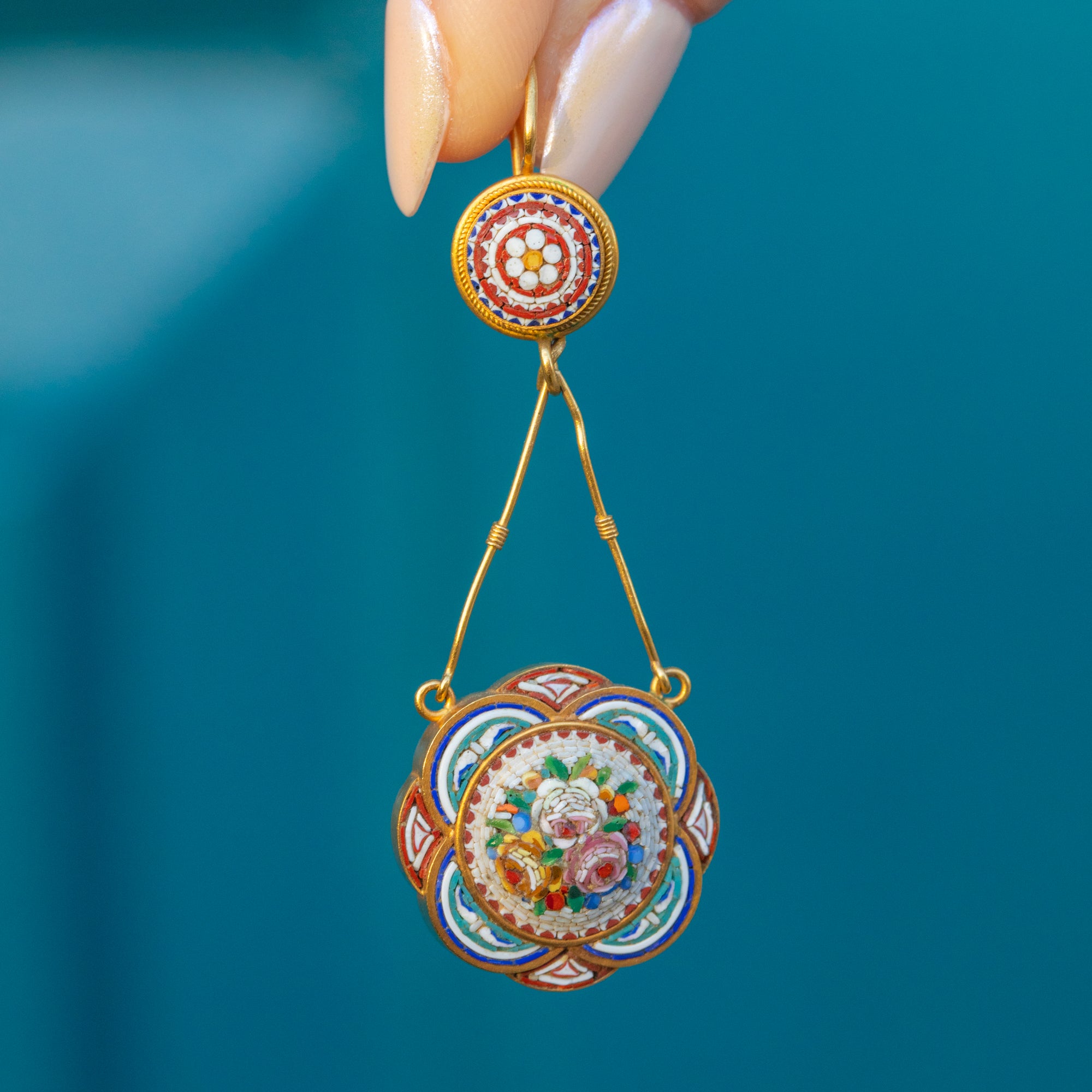 EXCELLENT. This Victorian 18ct Gold floral micro-mosaic drop pendant is in excellent condition. The pendant is smooth, and the micro mosaic pendants are all securely set into place. There is very little wear to note - this is a truly exquisite piece.