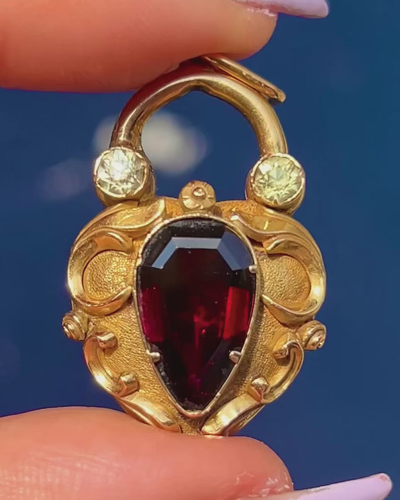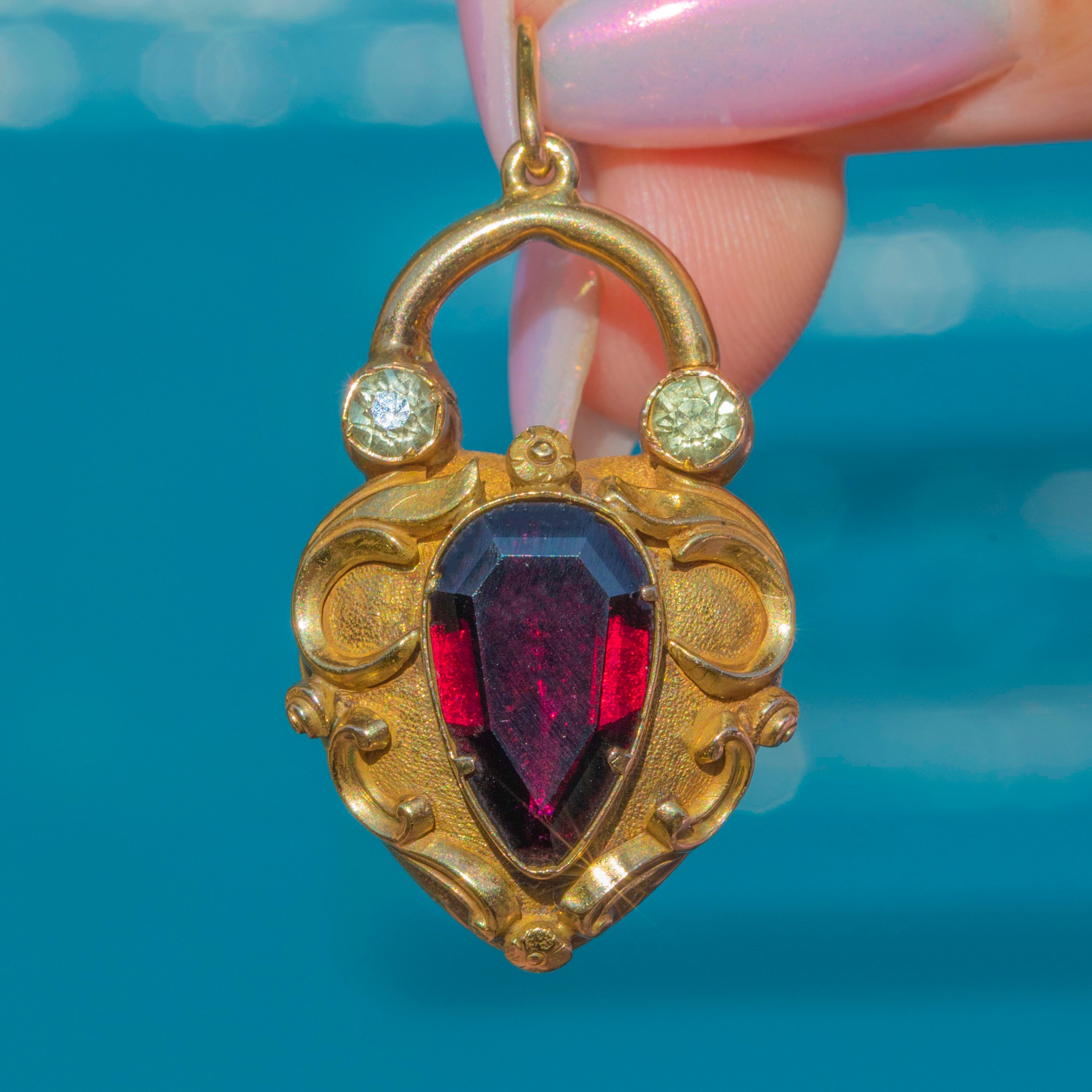 Ornately engraved patterns dance across the surface of this Victorian 18ct Gold heart padlock pendant, which boasts the most juicy teardrop Garnet!
