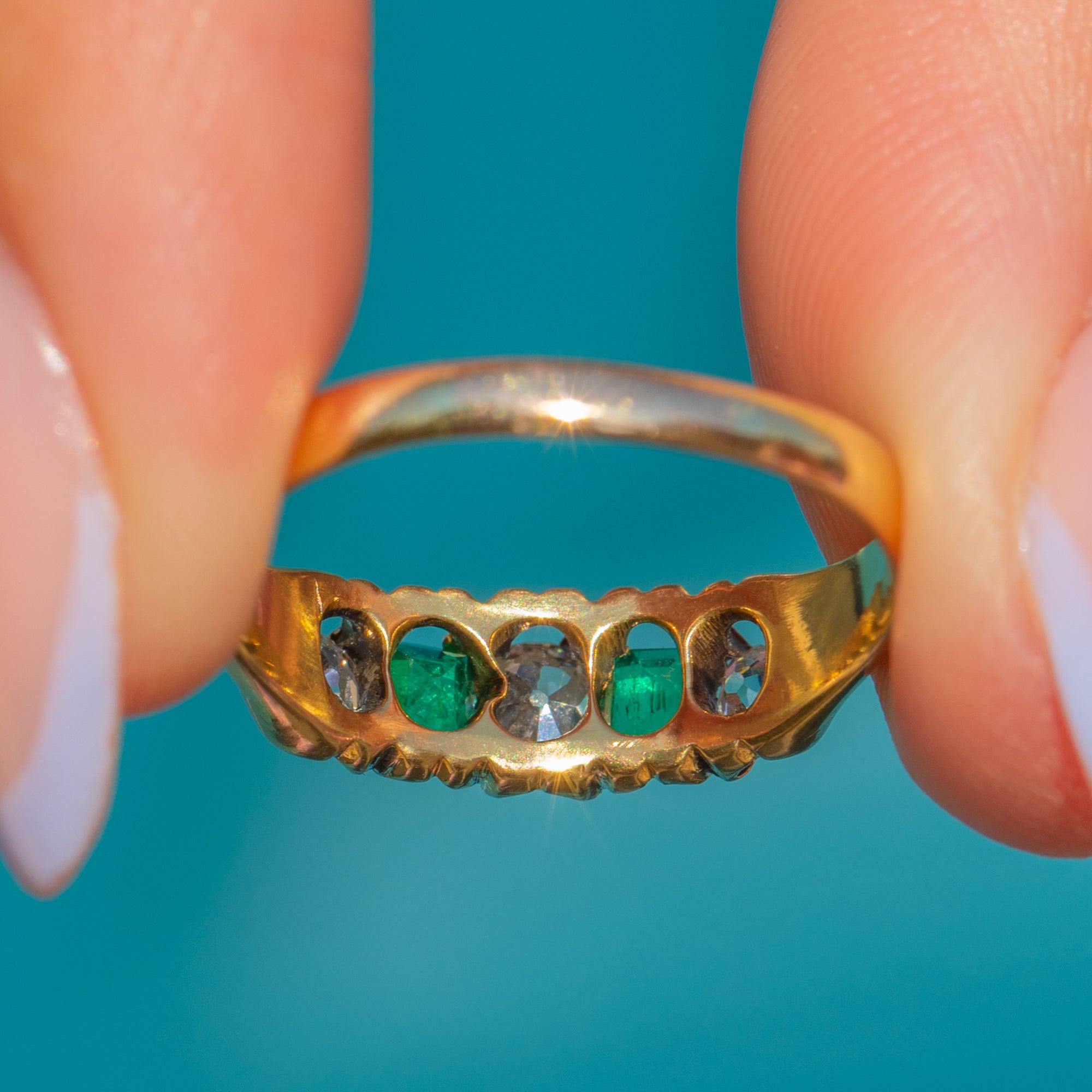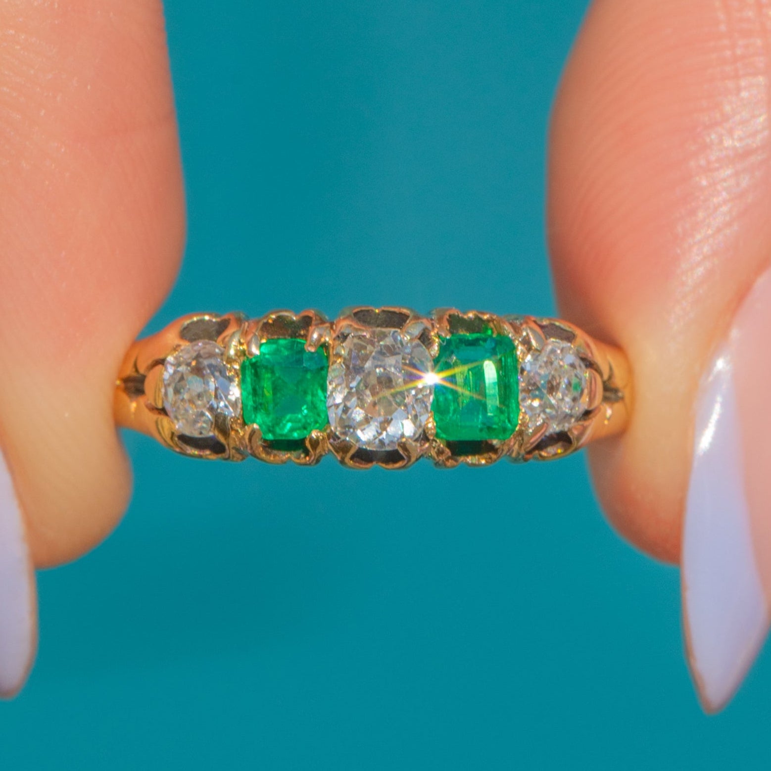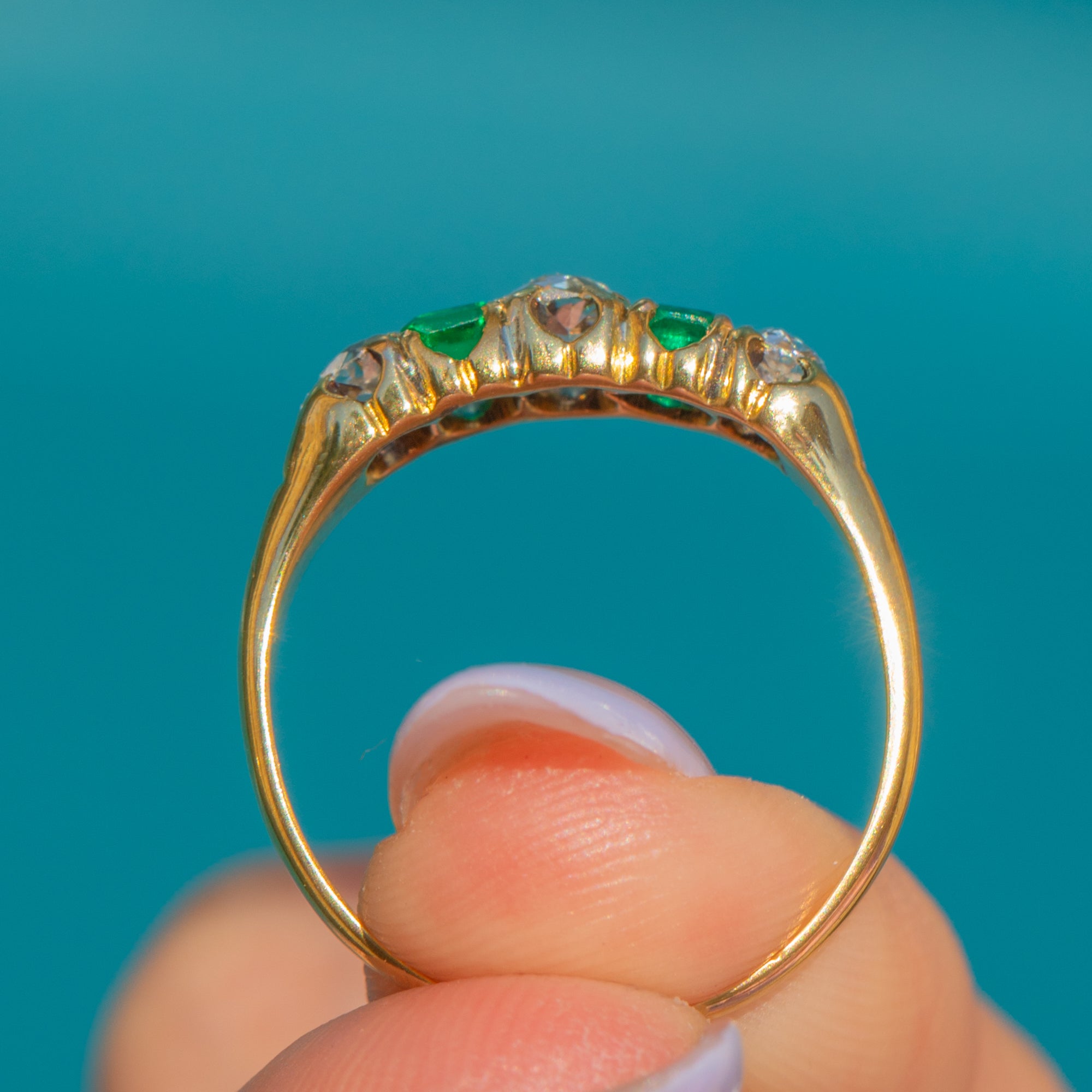 This antique 18ct Gold Emerald and Old-Mine cut Diamond five stone ring is exquisite! Two vibrant Emeralds, with a combined carat weight of 0.40ct - as well as 0.40cts of scintillating Old-mine Diamonds - are proudly displayed within glossy claw settings, with the vibrant gemstones married by the warmth of her buttery 18ct Gold.