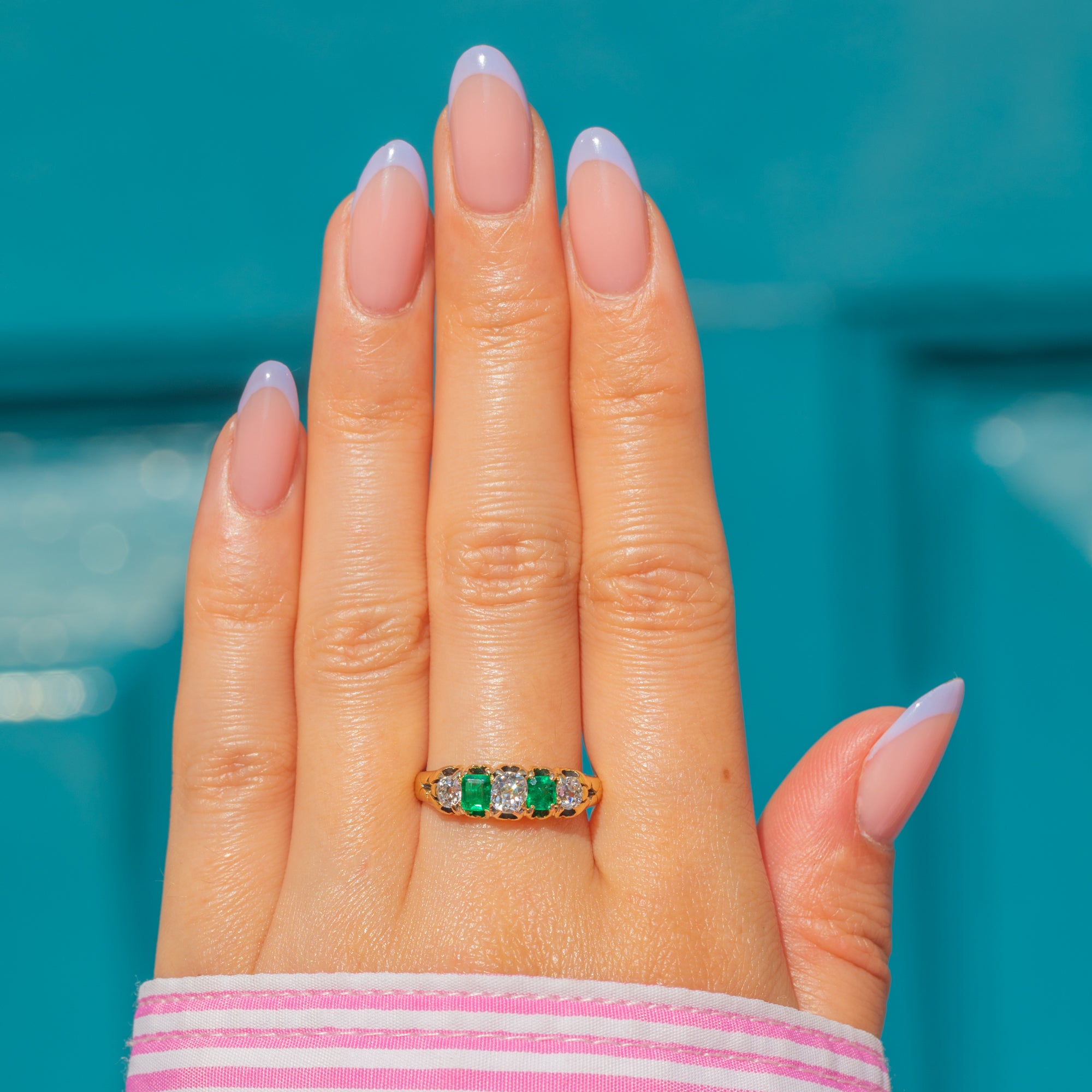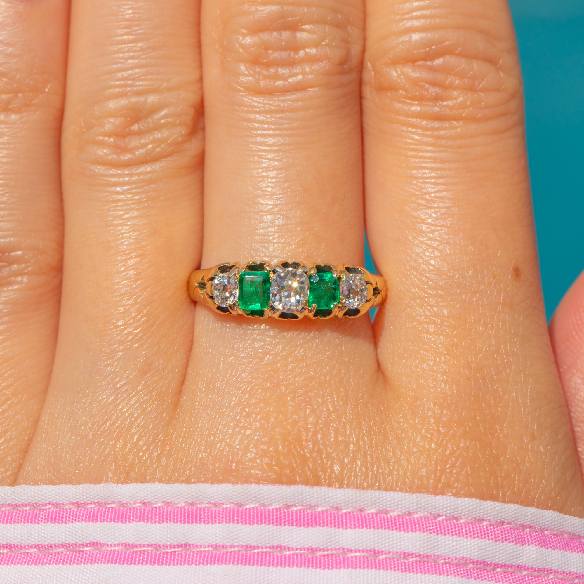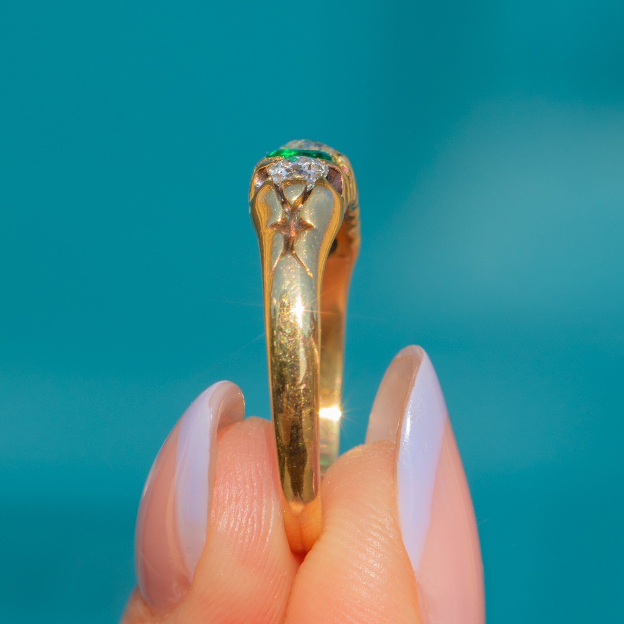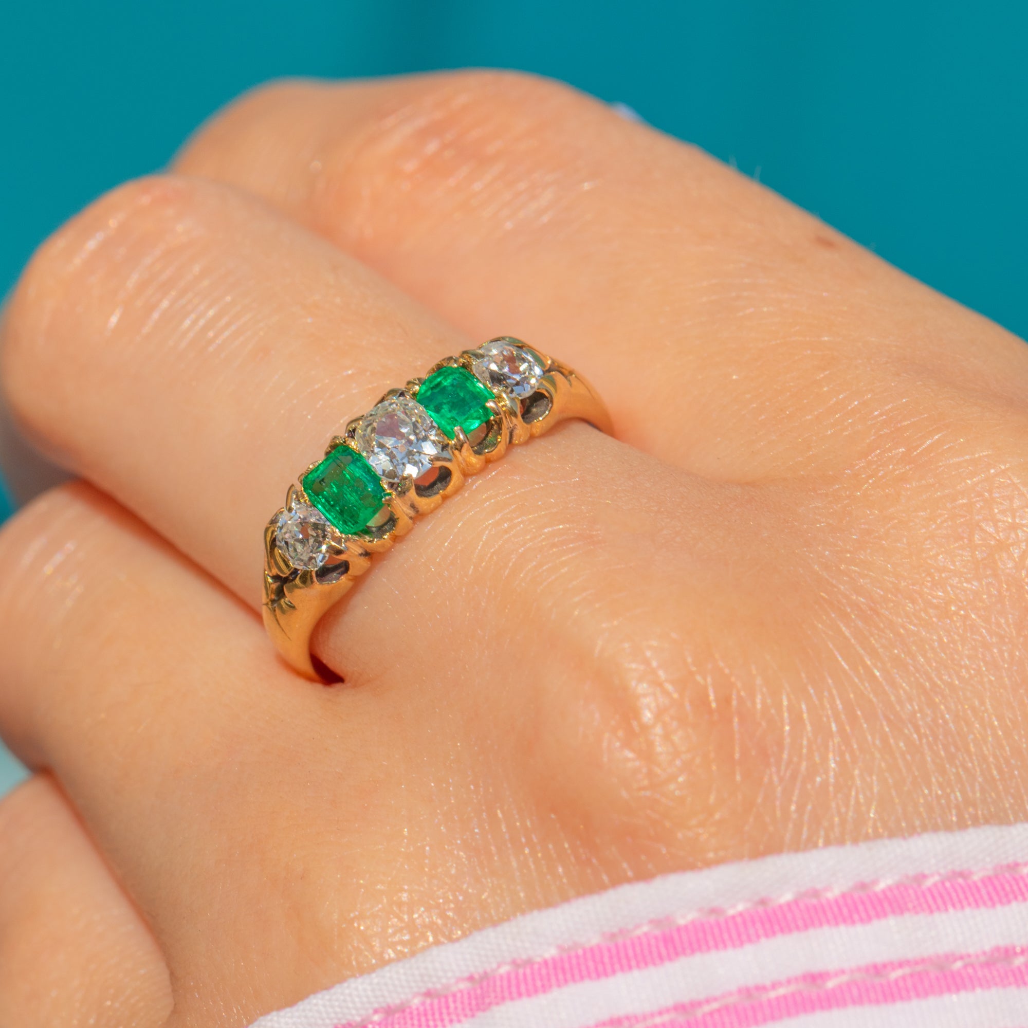 This antique 18ct Gold Emerald and Old-Mine cut Diamond five stone ring is exquisite! Two vibrant Emeralds, with a combined carat weight of 0.40ct - as well as 0.40cts of scintillating Old-mine Diamonds - are proudly displayed within glossy claw settings, with the vibrant gemstones married by the warmth of her buttery 18ct Gold.