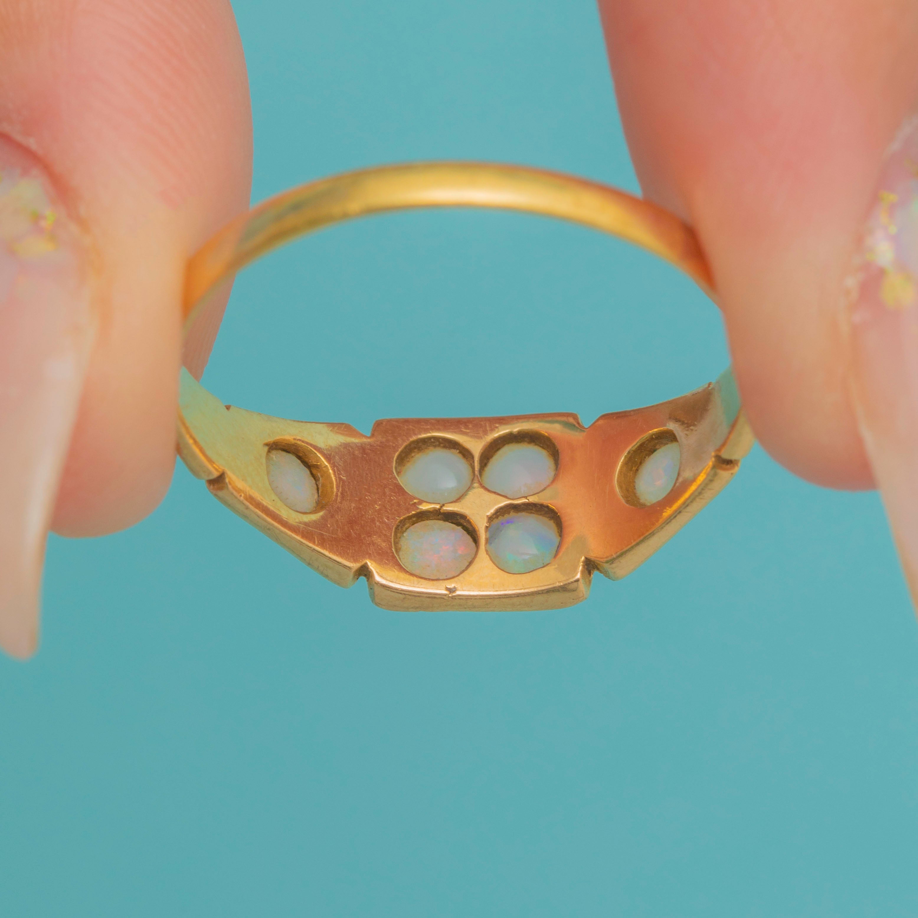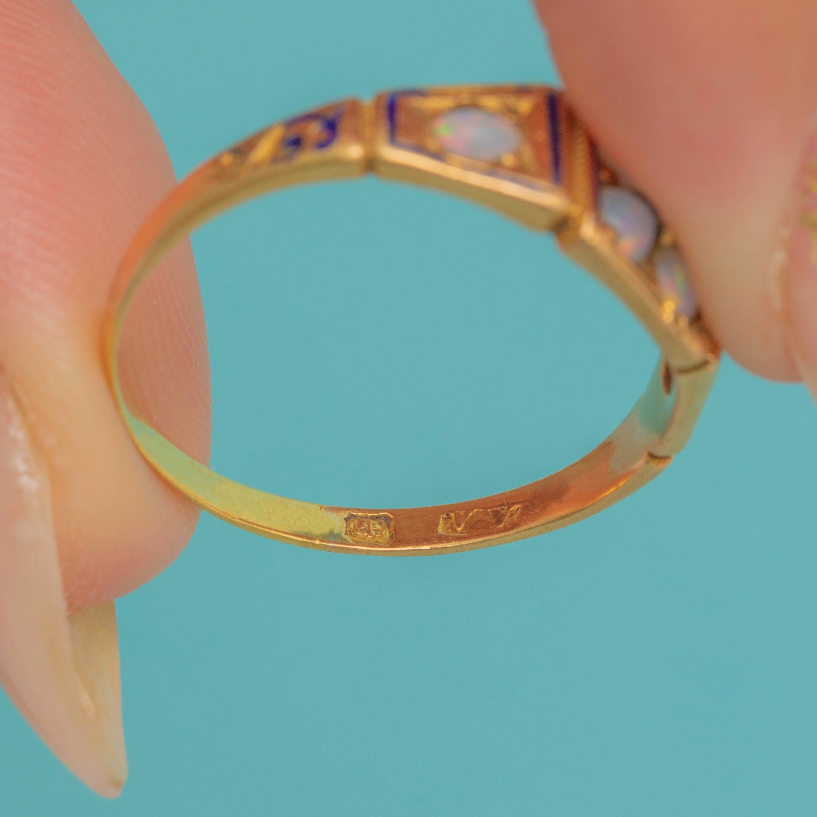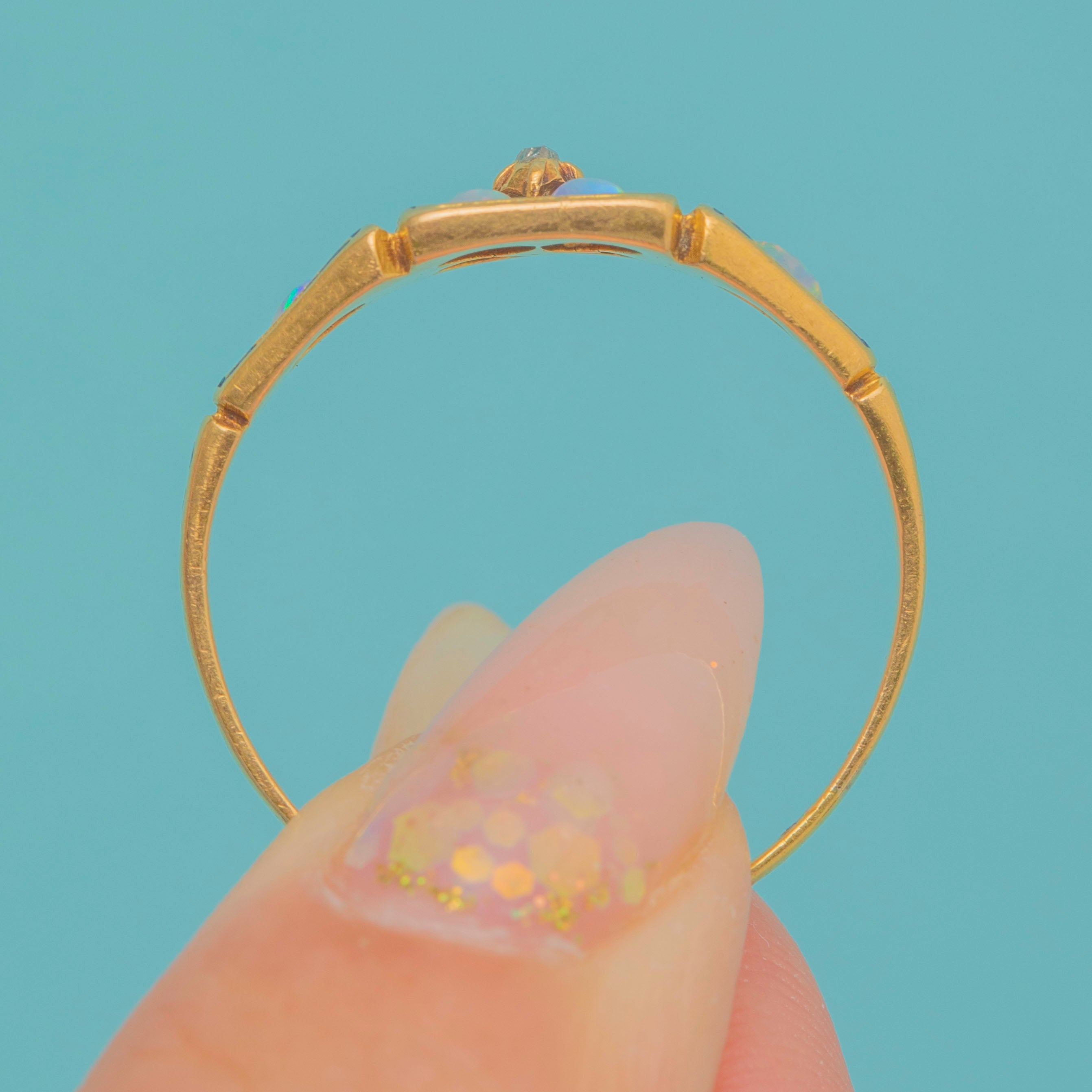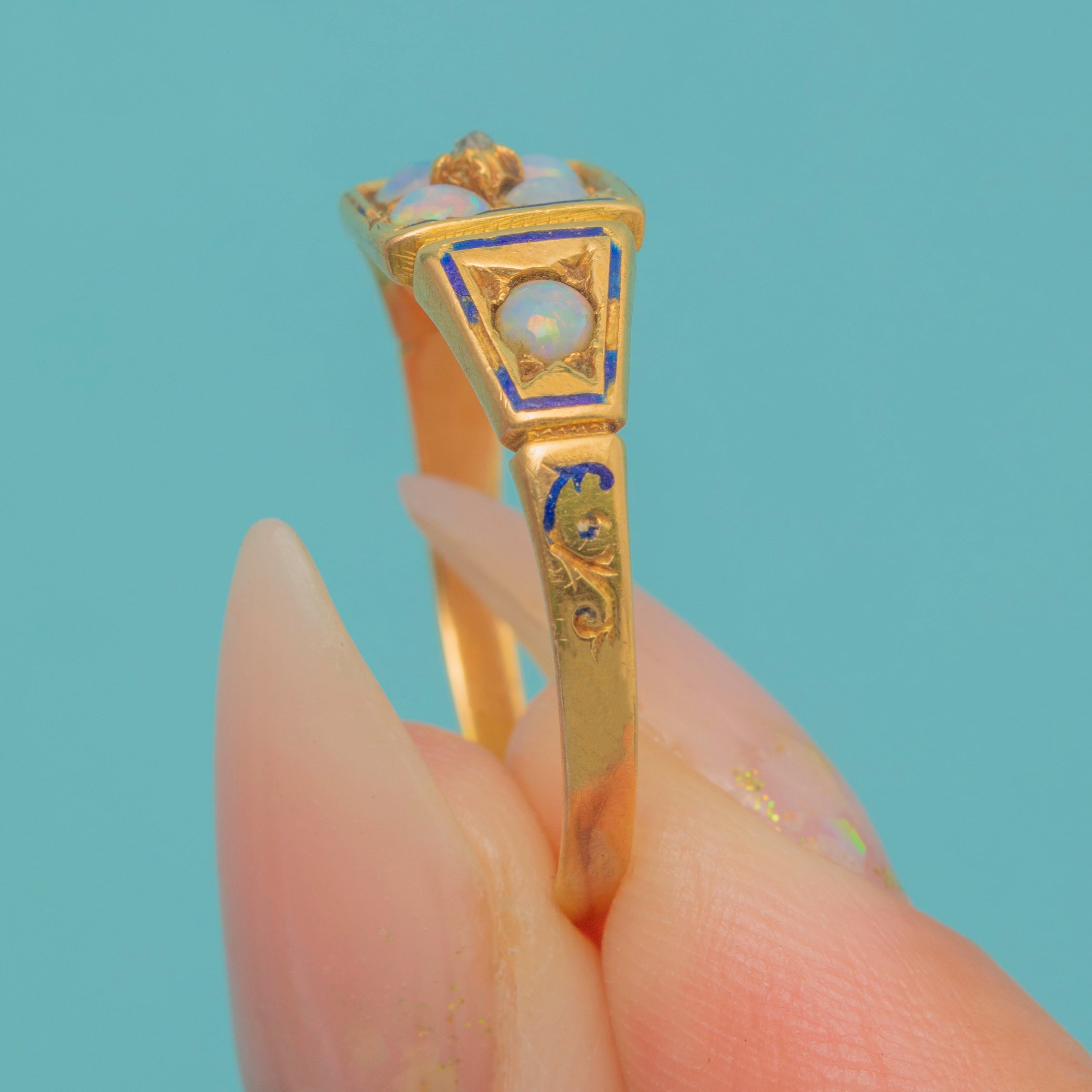 VERY GOOD: The Opals are luminous with lovely play-of-colour, and the Diamonds are bright and securely set. The Gold remains in excellent condition. Much of the black enamel has been lost with age, but the ring retains a wonderful aura and antique charm overall.